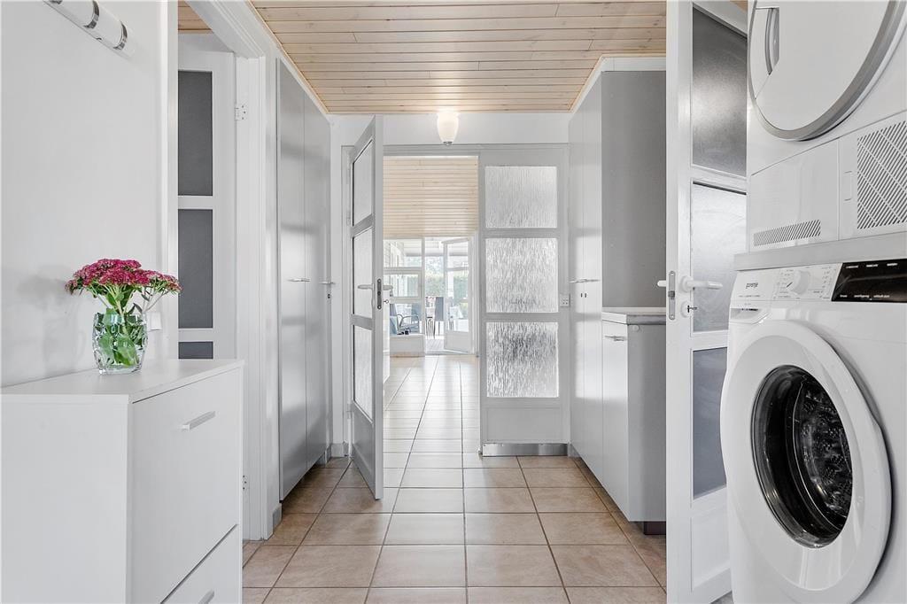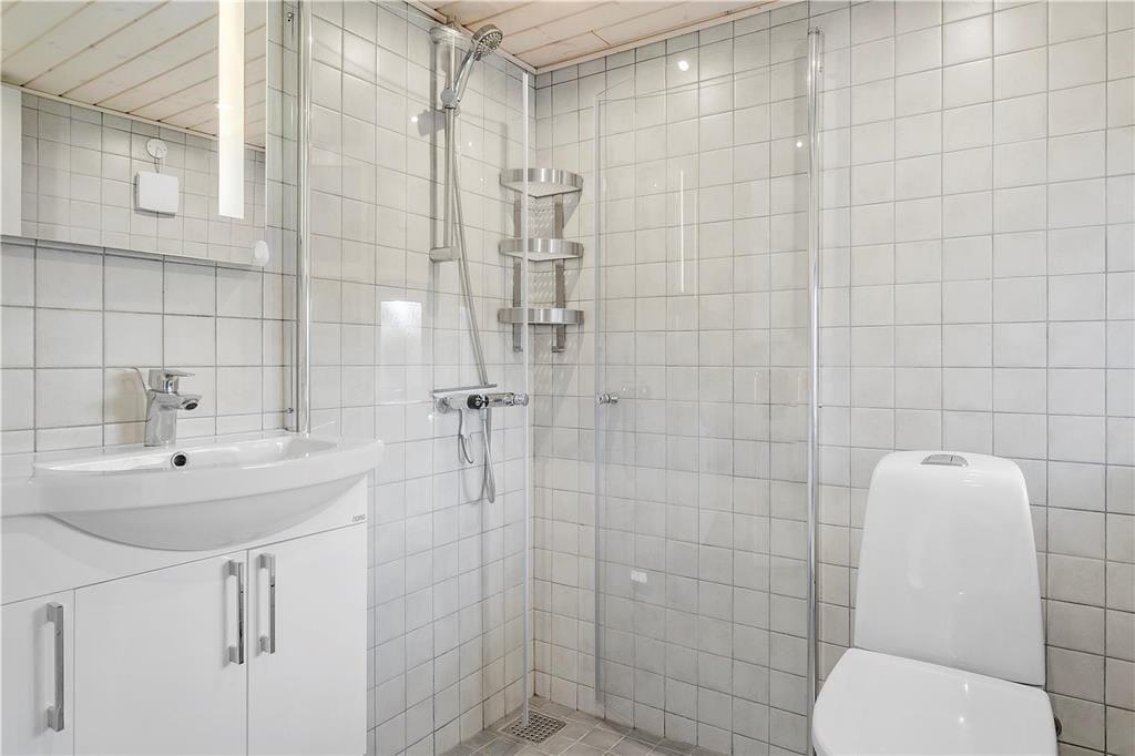 Flot badeværelse med god plads, bruseniche, toilet og en dejlig sauna. Uden for badeværelset er der installeret ny vaskemaskine og tørretumbler i 2020.