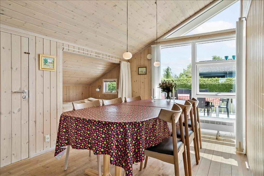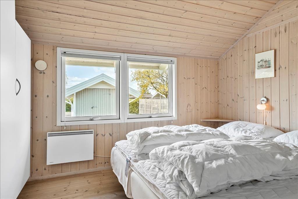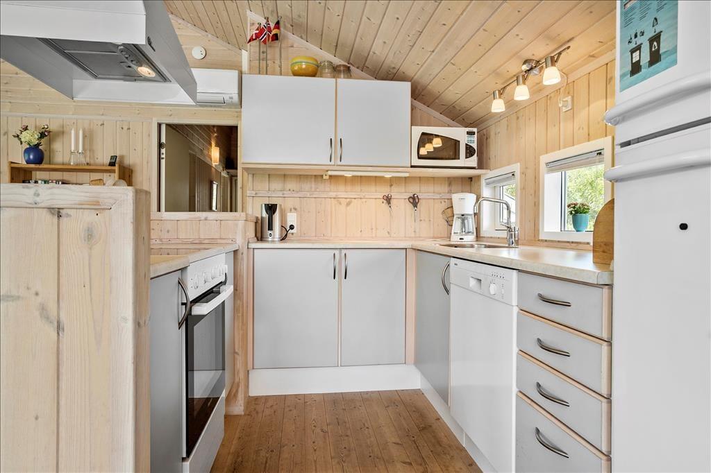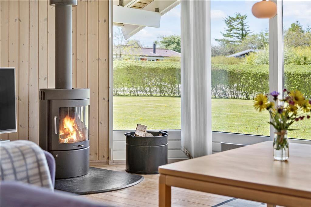 Dette klassiske træsommerhus ved Dyngby Strand byder på en lys og indbydende atmosfære, hvor hele familien kan føle sig hjemme. Det rummelige opholdsrum samler køkken og stue i ét, så der er plads til både madlavning, leg og hyggelige stunder foran brændeovnen. Den åbne indretning giver et naturligt samlingspunkt for alle aldre, og små detaljer som alkoven skaber ekstra hyggekroge, hvor man kan trække sig tilbage med en bog eller en kop kaffe. Huset er skabt til ferie med ro og nærvær, hvor hverdagen kan lægges bag sig, og familien kan være sammen på en afslappet måde.