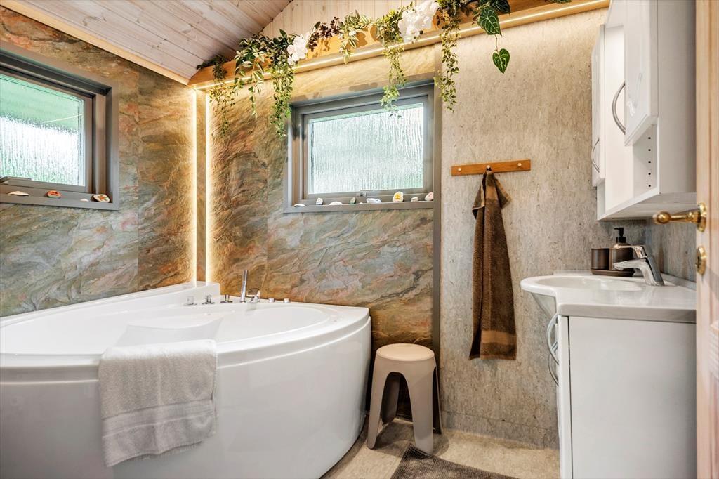 Du har god plads at brede dig på – her er tre soveværelser og en hyggelig alkove, som er perfekt til en lur, lidt leg eller fordybelse i en god bog. Efter en frisk tur ved stranden kan du forkæle dig selv med en stund i husets spabad eller lade varmen fra saunaen få skuldrene helt ned. Her får du alt det, du har brug for – inklusiv vaskemaskine, tørretumbler og opvaskemaskine, så du kan holde ferien enkel og bekymringsfri.