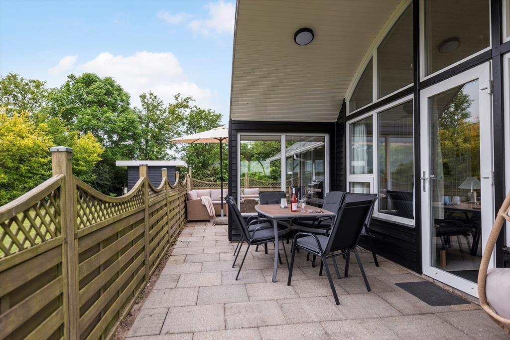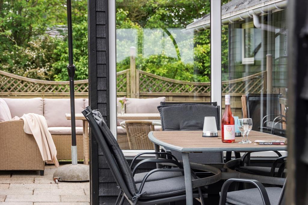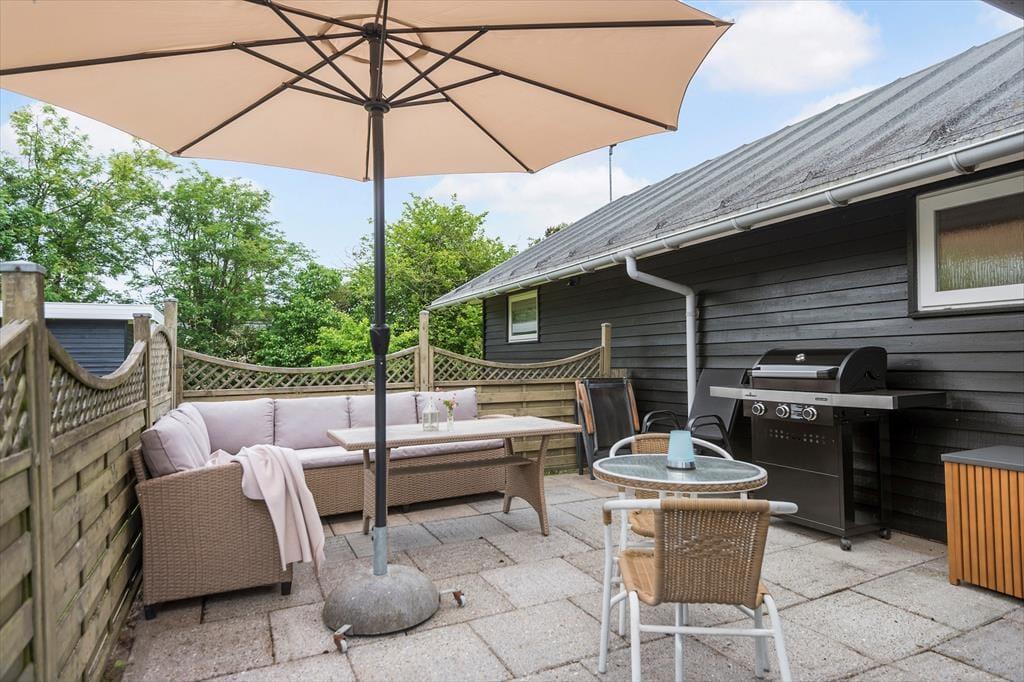 Fra stuen træder du direkte ud på en stor, sydvendt terrasse, hvor ferielivet for alvor folder sig ud. Her kan du nyde dagens måltider, slappe af med en bog i solen eller bare lade tiden gå i godt selskab. Terrassen er delvist overdækket og omgivet af et lukket hegn, så du får både læ, privatliv og tryghed – ideelt, hvis du har mindre børn eller hund med.