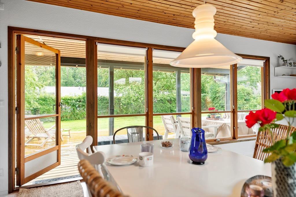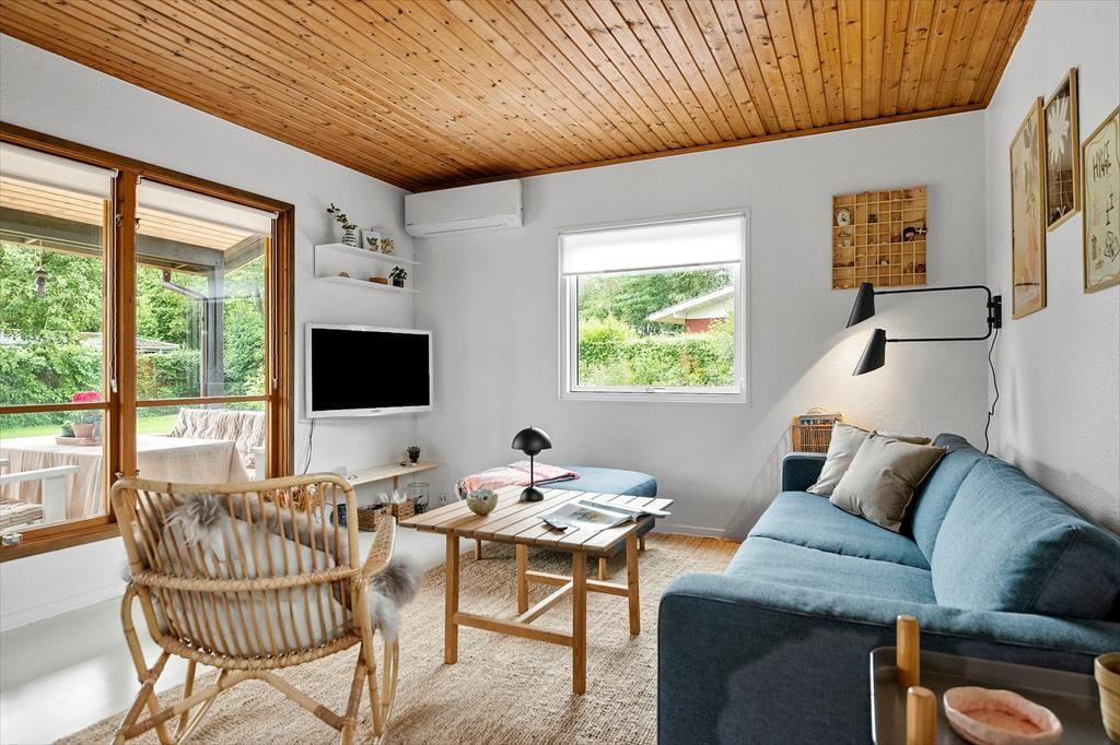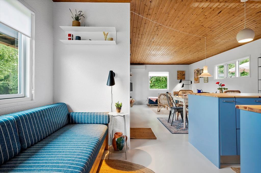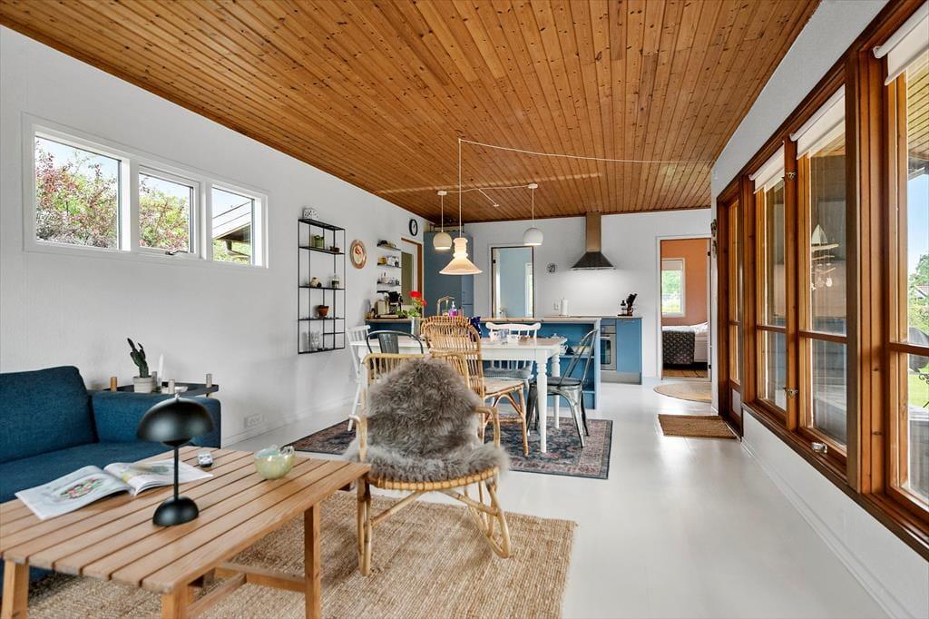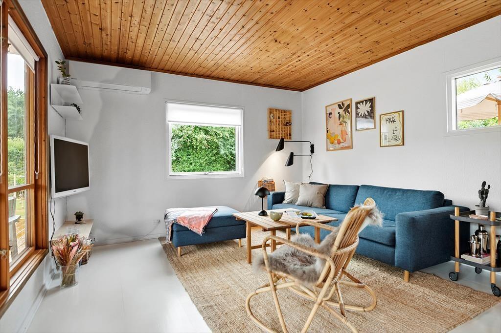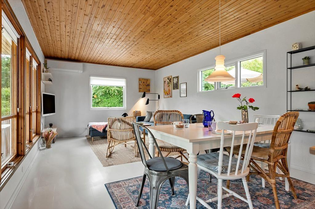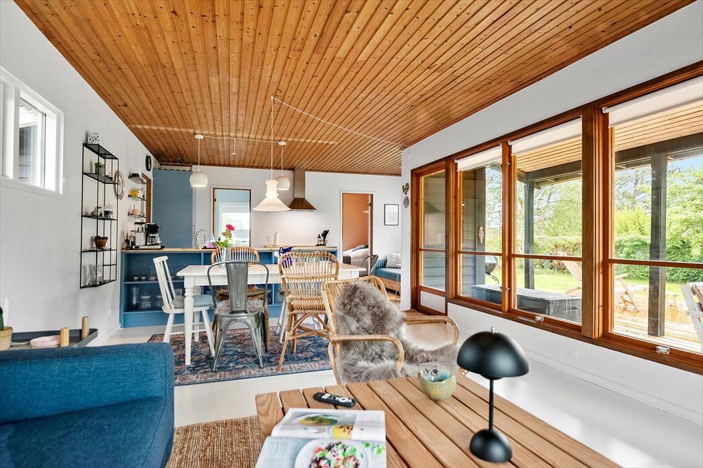 Indenfor åbner huset sig med et lyst og rart rum, hvor det er let at finde sig til rette. De store vinduer trækker naturen helt tæt på, og her er en rolig atmosfære, der indbyder til at slappe af – måske med en god bog i sofaen eller et brætspil omkring bordet.