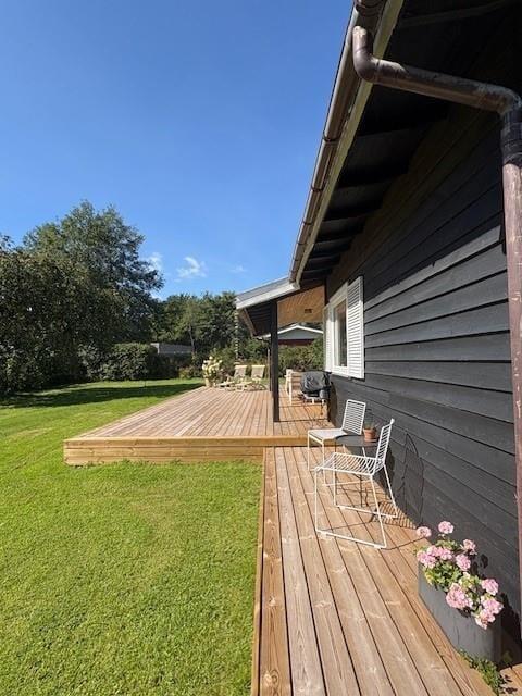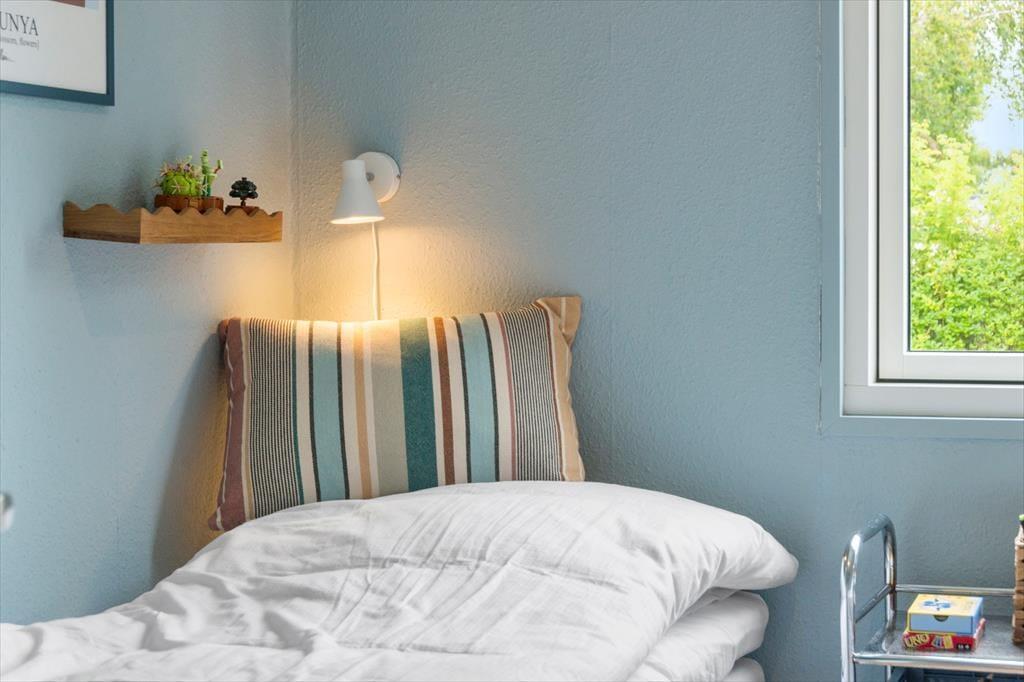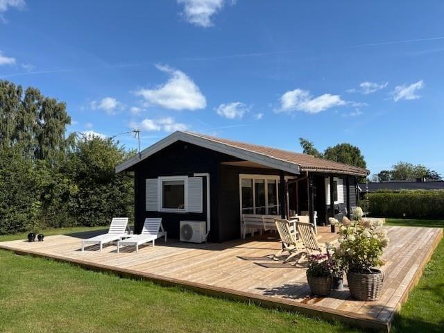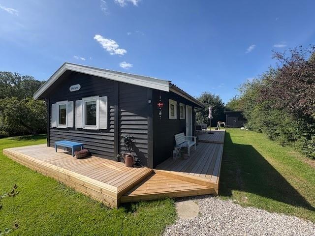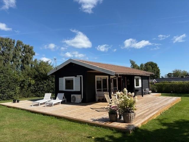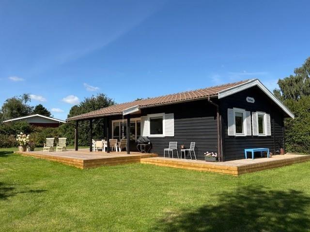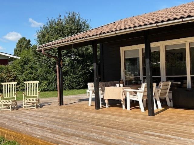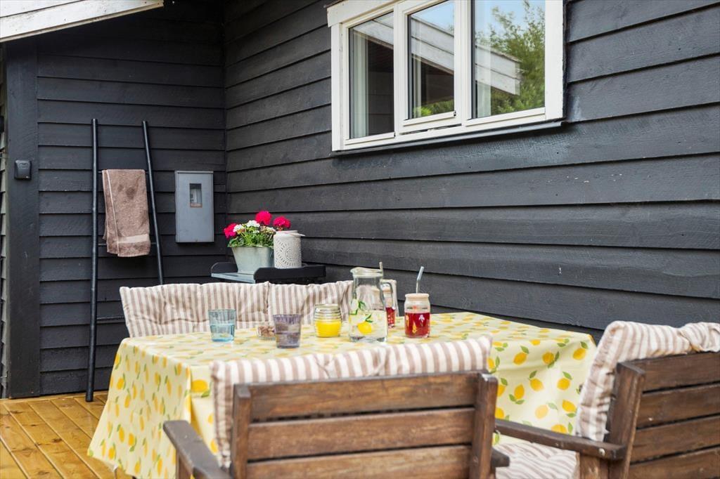 Livet leves i høj grad udenfor, og haven omkring sommerhuset er som skabt til det. Den store træterrasse er et naturligt samlingspunkt – fra den første kop morgenkaffe til de stille aftentimer, hvor solen går ned bag trætoppene og efterlader himlen i varme farver. Her kan du læne dig tilbage i stolen, mærke solen på huden og lade tankerne flyde. Haven er grøn og venlig, med masser af plads til børn, leg og afslapning, og måske til at lade dagen drive af sted i sit eget tempo. Når du har lyst til en dukkert, er det nemt at gå ned til stranden – med bare tæer i sandalerne og håndklædet over skulderen. Havet er tæt på og altid lige der, klar til at give dig fornemmelsen af frihed og friskhed.