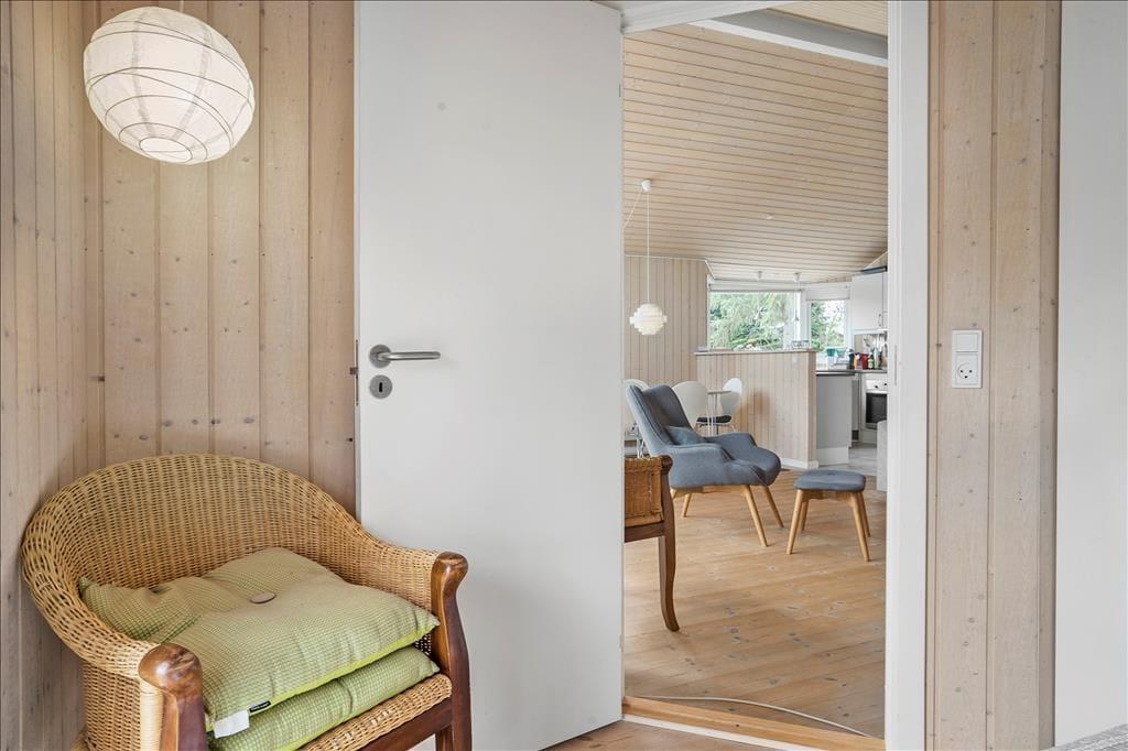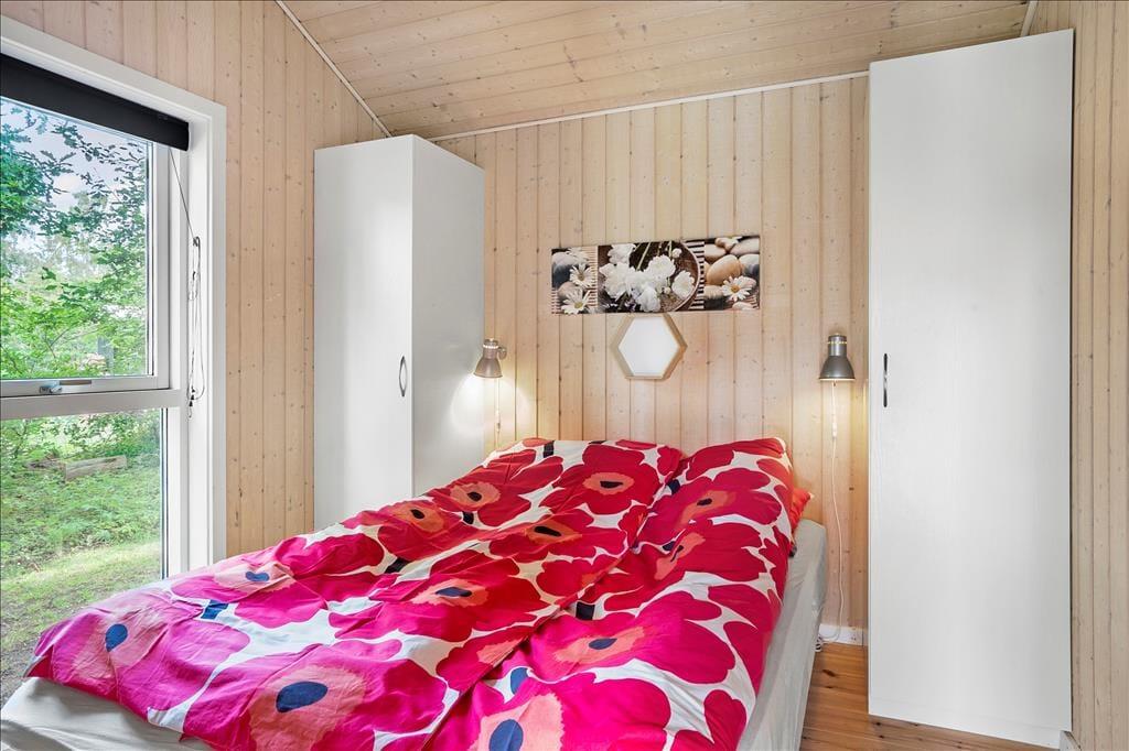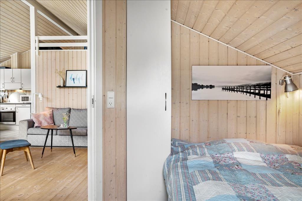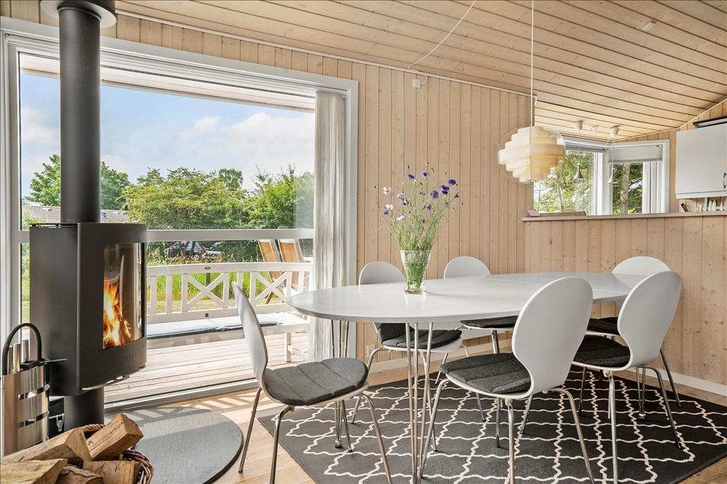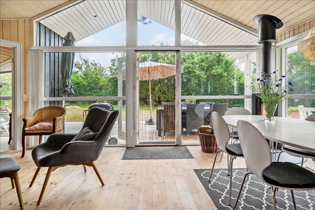 Sommerhuset er lyst og venligt, moderne indrettet og med pæne møbler. Her er loft til kip i hele huset med et lyst køkken i åben forbindelse med den hyggelige stue med brændeovn og store vinduespartier. Her er 3 gode soveværelser. Det ene med 2 enkeltsenge og de to andre med 1 ¾ dobbeltseng i hver. Her er et funktionelt badeværelse med brus, vaskemaskine og babybadekar.