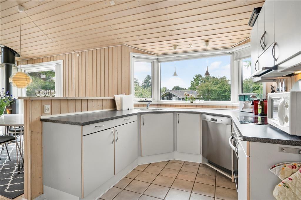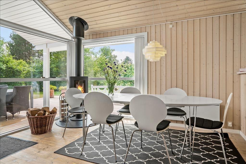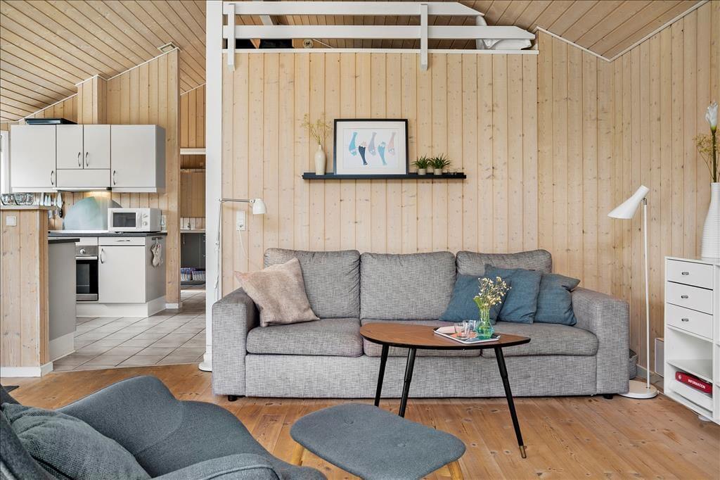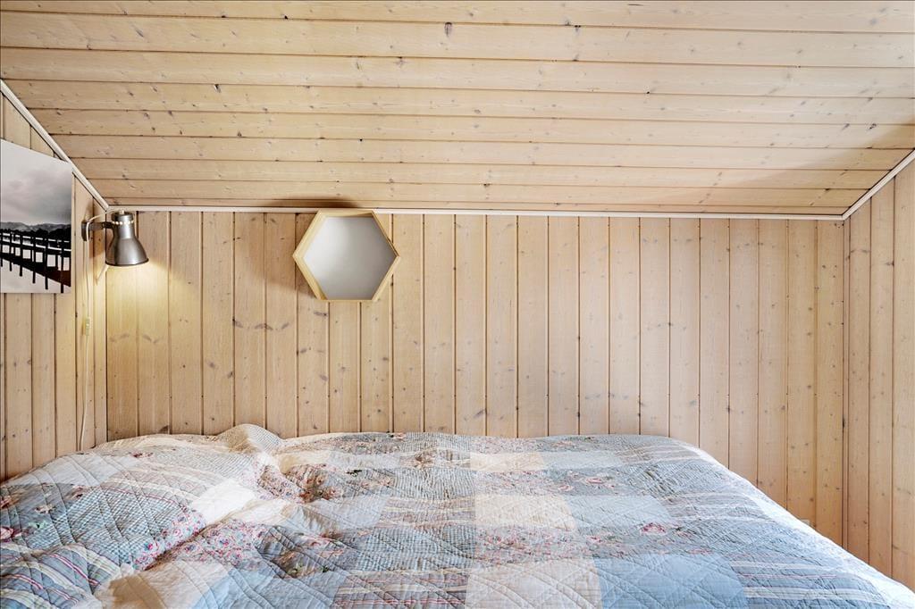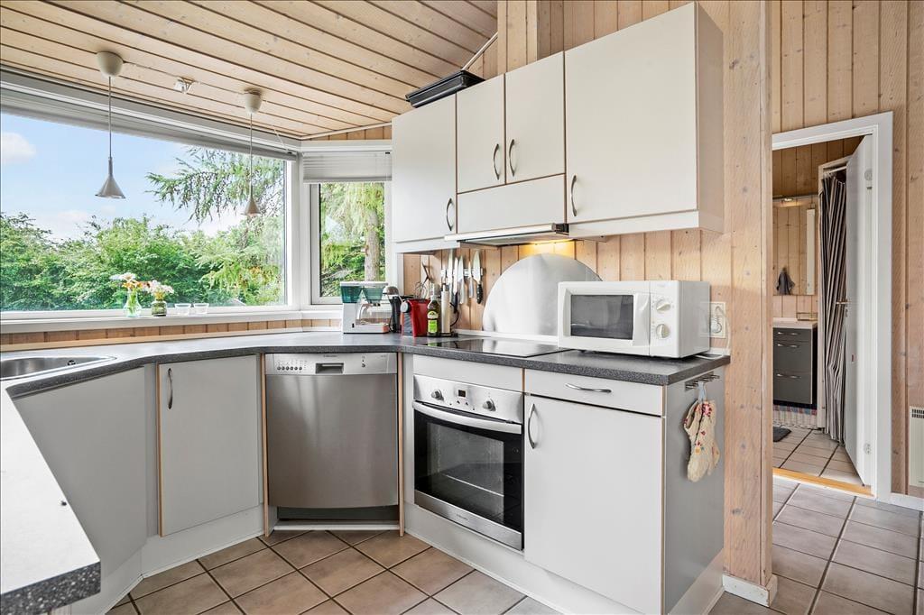 Sommerhuset er lyst og venligt, moderne indrettet og med pæne møbler. Her er loft til kip i hele huset med et lyst køkken i åben forbindelse med den hyggelige stue med brændeovn og store vinduespartier. Her er 3 gode soveværelser. Det ene med 2 enkeltsenge og de to andre med 1 ¾ dobbeltseng i hver. Her er et funktionelt badeværelse med brus, vaskemaskine og babybadekar.