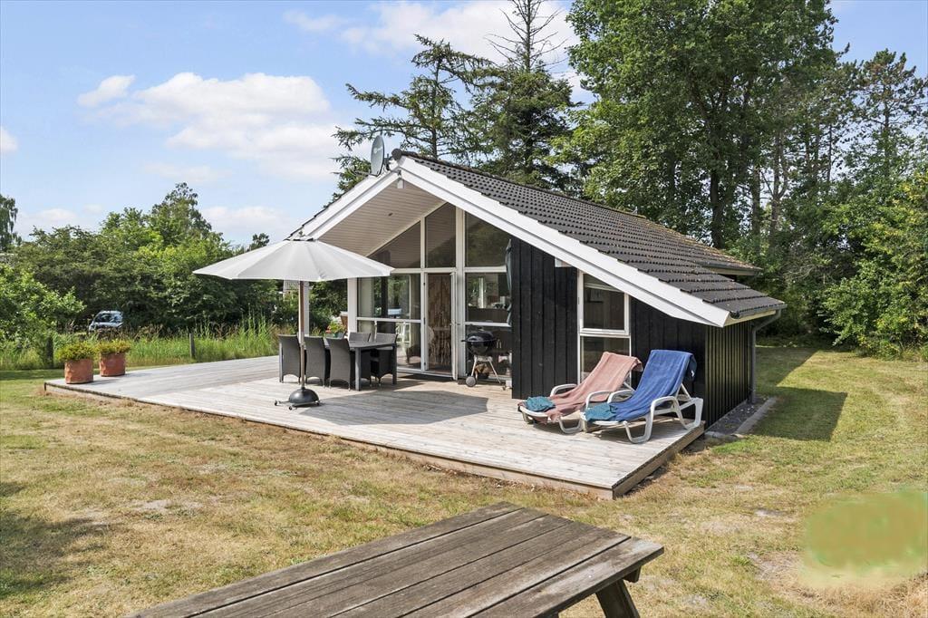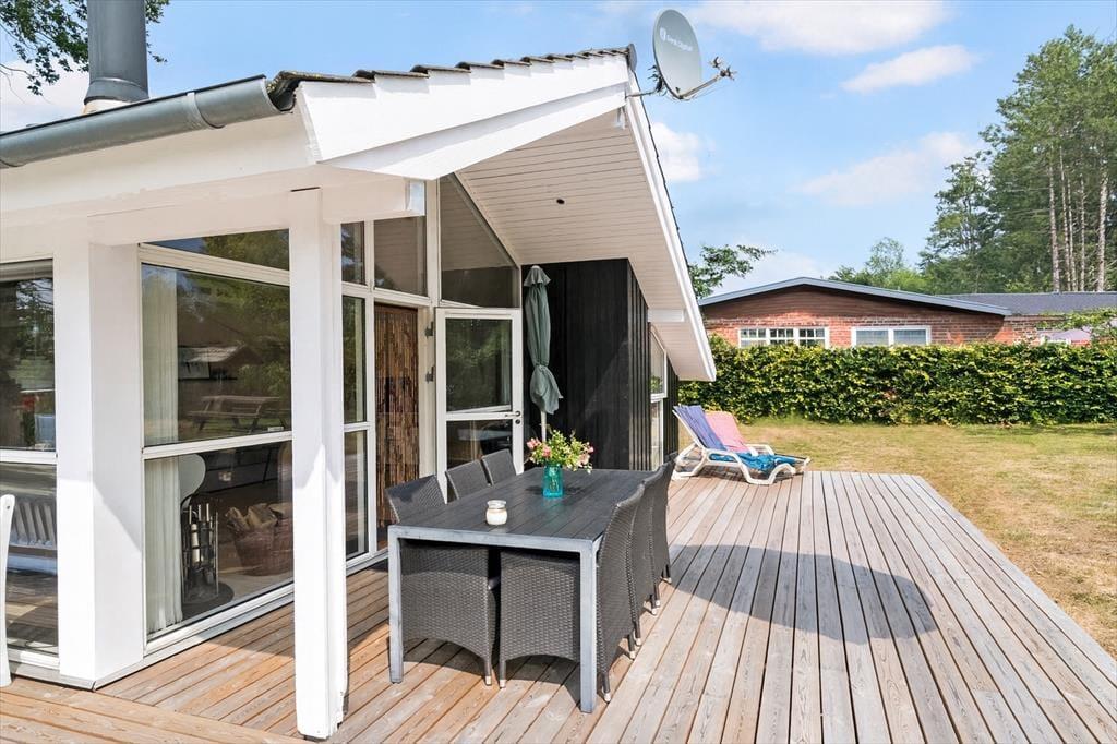 Udendørs er der en dejlig træterrasse. Her er der havemøbler, liggestole og parasol. Den hyggelige have har også en bålplads og sandkasse. Grunden grænser op til Spongså, hvor der er afskærmet med trådhegn.