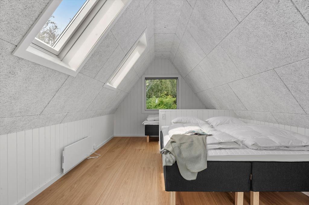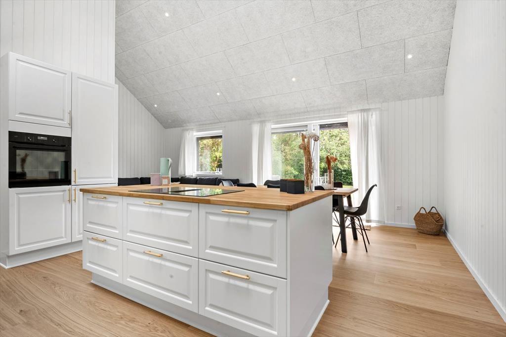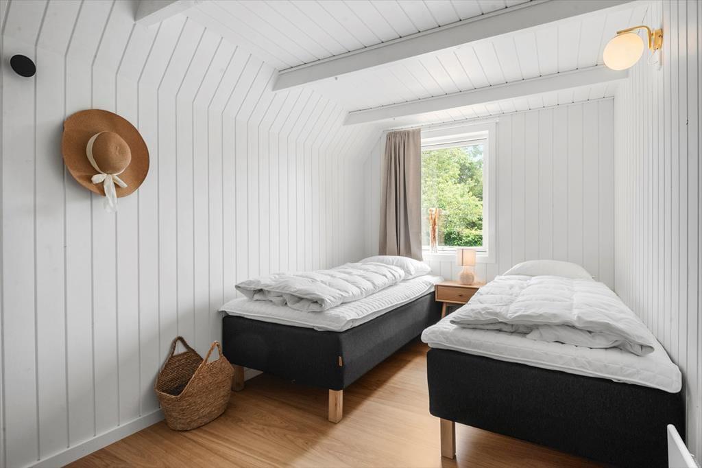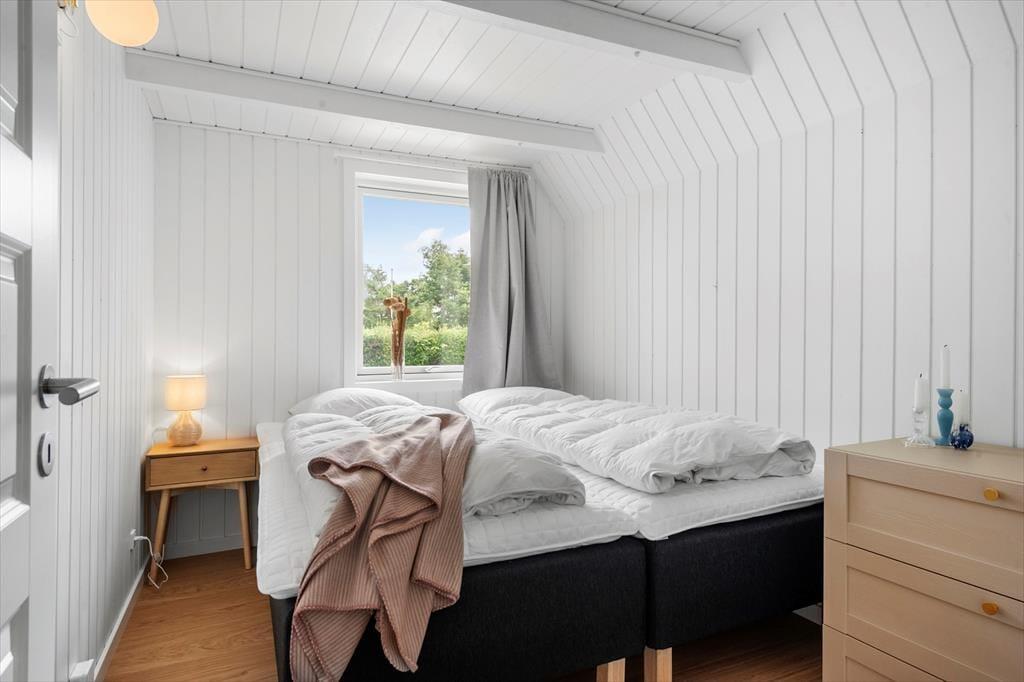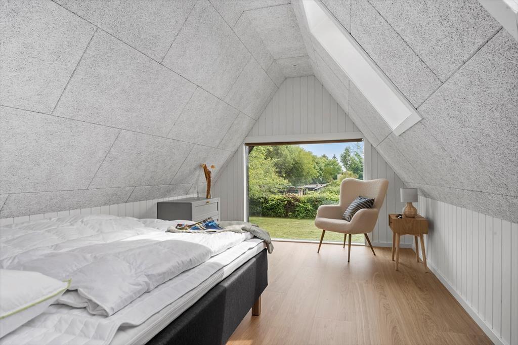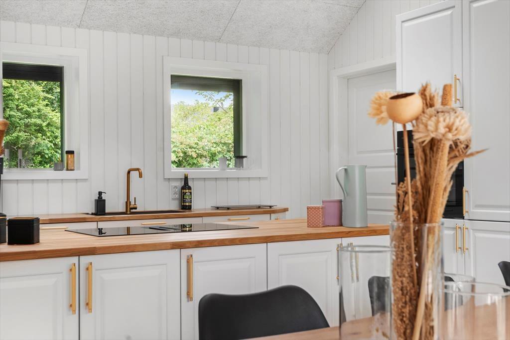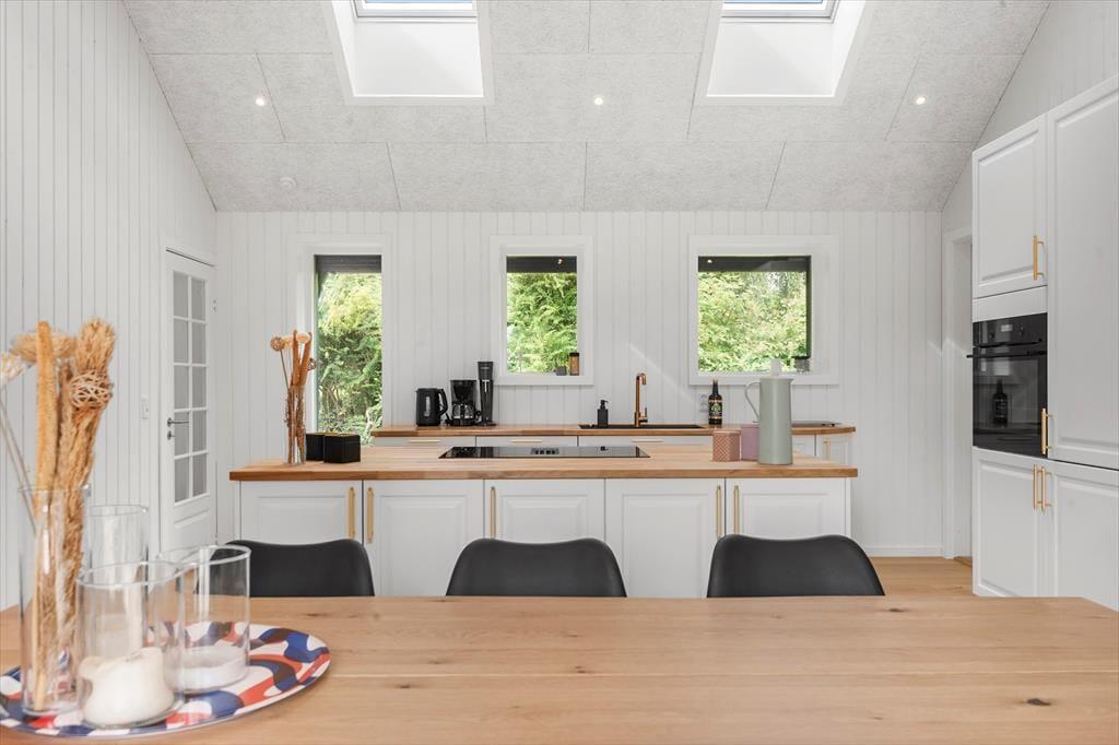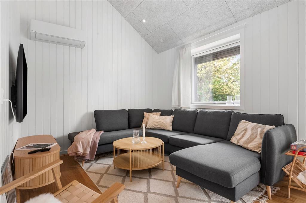 Når du træder indenfor, omfavner sommerhuset dig med en lun og behagelig atmosfære, der straks inviterer til afslapning og fællesskab. De lyse rum er badet i dagslys, der strømmer gennem store vinduer og giver en følelse af at være tæt på naturen hele tiden. Her er plads til både livlige samtaler og stille stunder – et rum hvor du kan samles om gode samtaler, lade latteren fylde og mærke, hvordan feriestemningen sniger sig ind under huden. De bløde tekstiler og det rolige farvevalg skaber en behagelig balance, hvor du kan finde ro efter en dag fyldt med oplevelser. Her kan du trække dig tilbage med en god bog, finde fred i en stille stund eller være sammen med dem, du holder af, uden at føle dig presset – et sommerhus, der både er rammen om nærvær og plads til fordybelse.