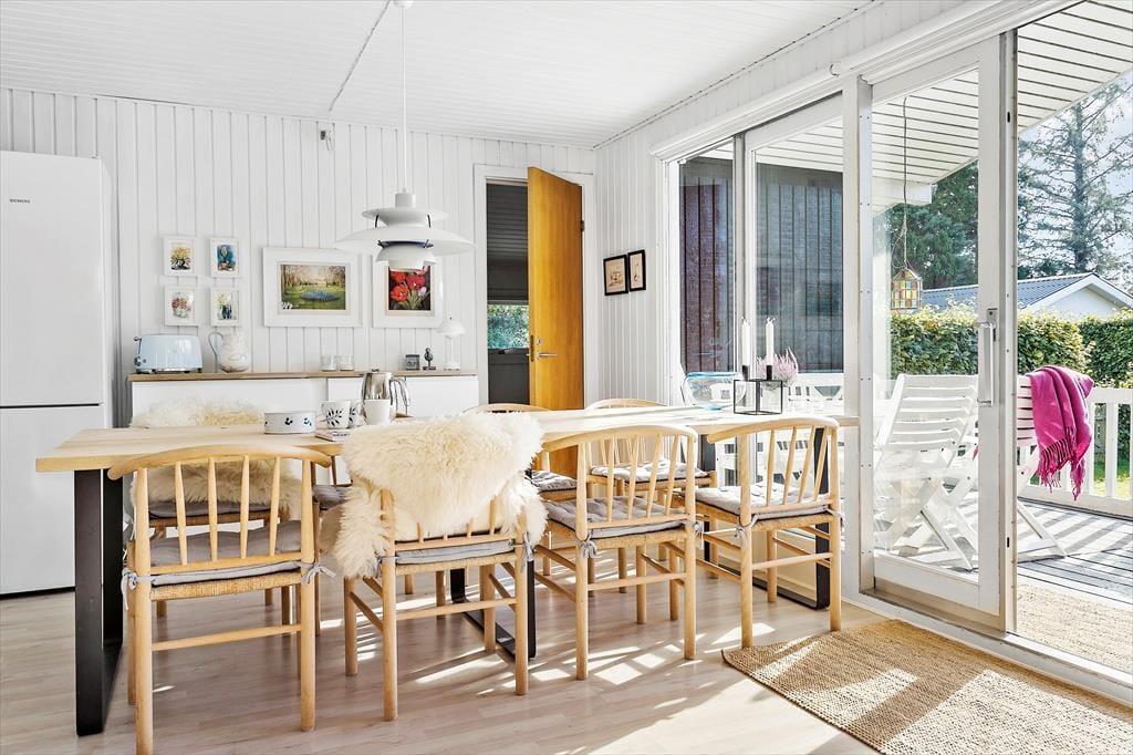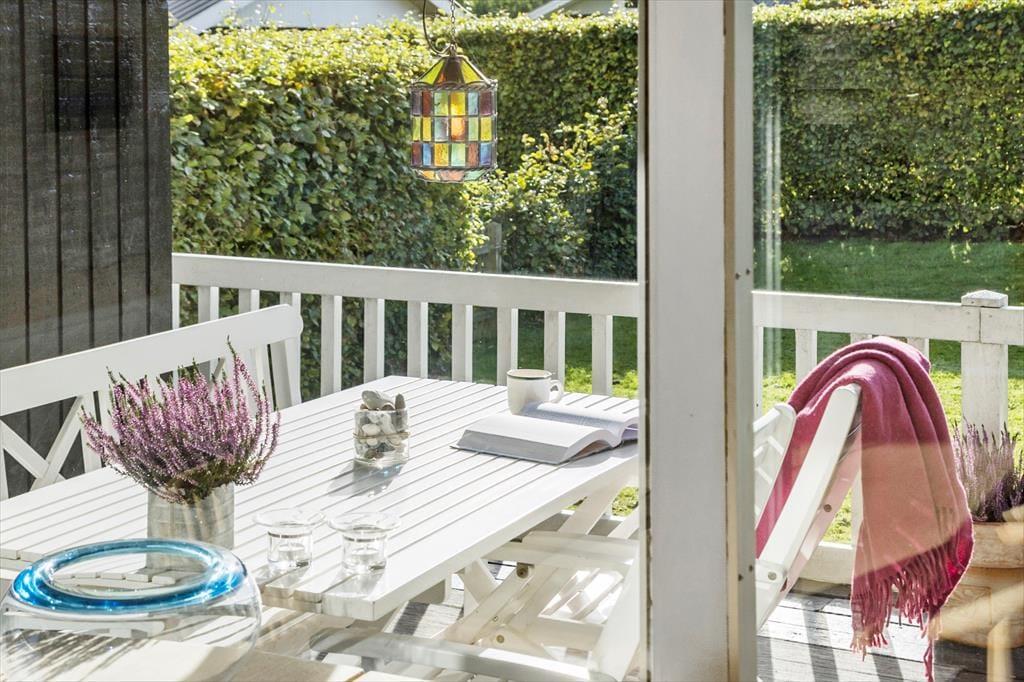 Huset har et stort og dejligt spisebord, hvor I kan nyde en dejlig middag eller et slag kort. Fra pladsen ved spisebordet kan I se ud på skønne terrassen og indhegnede, lukkede haven.