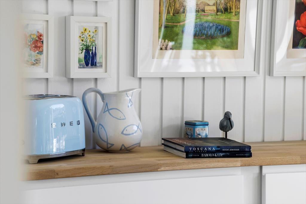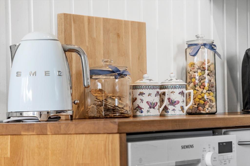Husets naturlige samlingspunkt er det rummelige køkken/alrum, der også er det første rum, man træder ind i. Her er et dejligt sofaområde hvorfra man både kan se TV eller nyde udsynet til haven. I sommerhuset kan du slappe af til nogle af TV´ets, danske, tyske, norske og svenske tv-kanaler. Derudover er TV´et også udstyret med en Chromecast, der gør det muligt at streame eget indhold fra eksempelvis telefon eller tablet, hertil kan husets tilgængelige WiFi benyttes.
