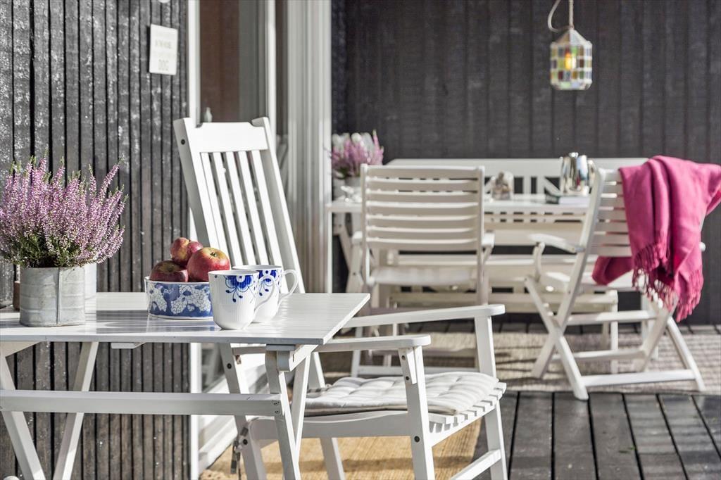 Fra husets alrum er der direkte adgang til terrassen. Sæt jer i de fine hvide havemøbler og oplev glæden ved at komme helt ned i gear. Udnyt de dejlige danske sommerhusaftner og tænd op i huset gode gasgrill.