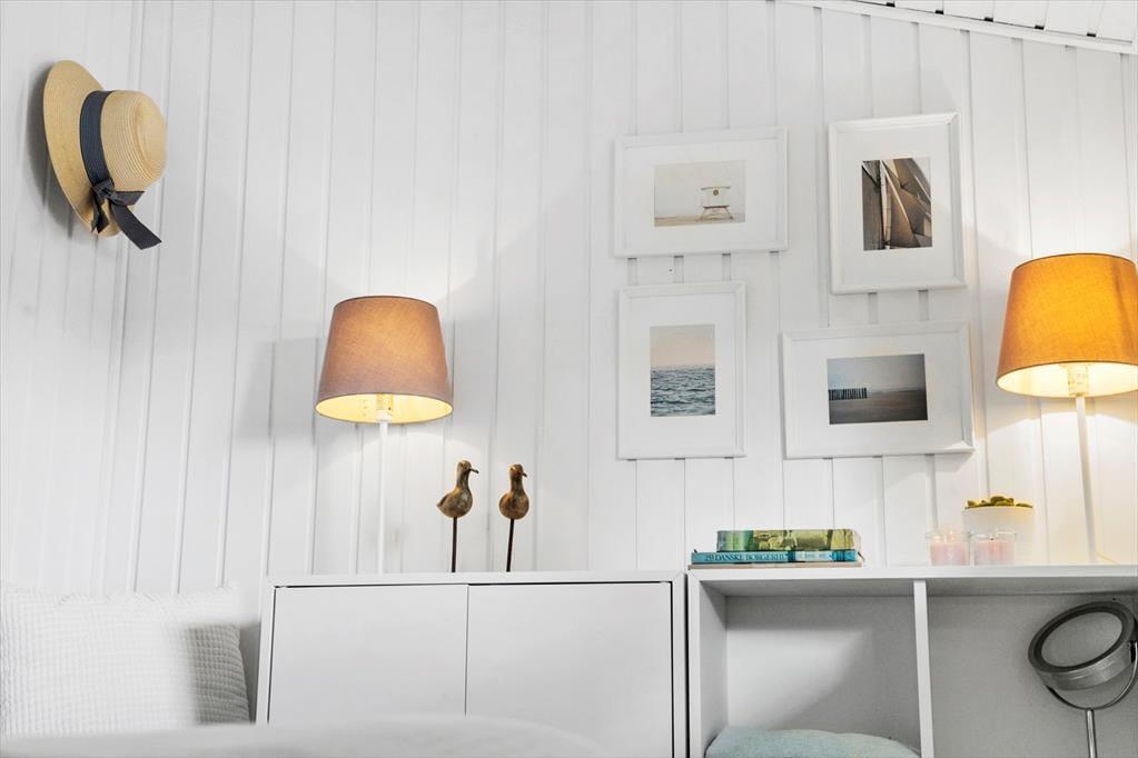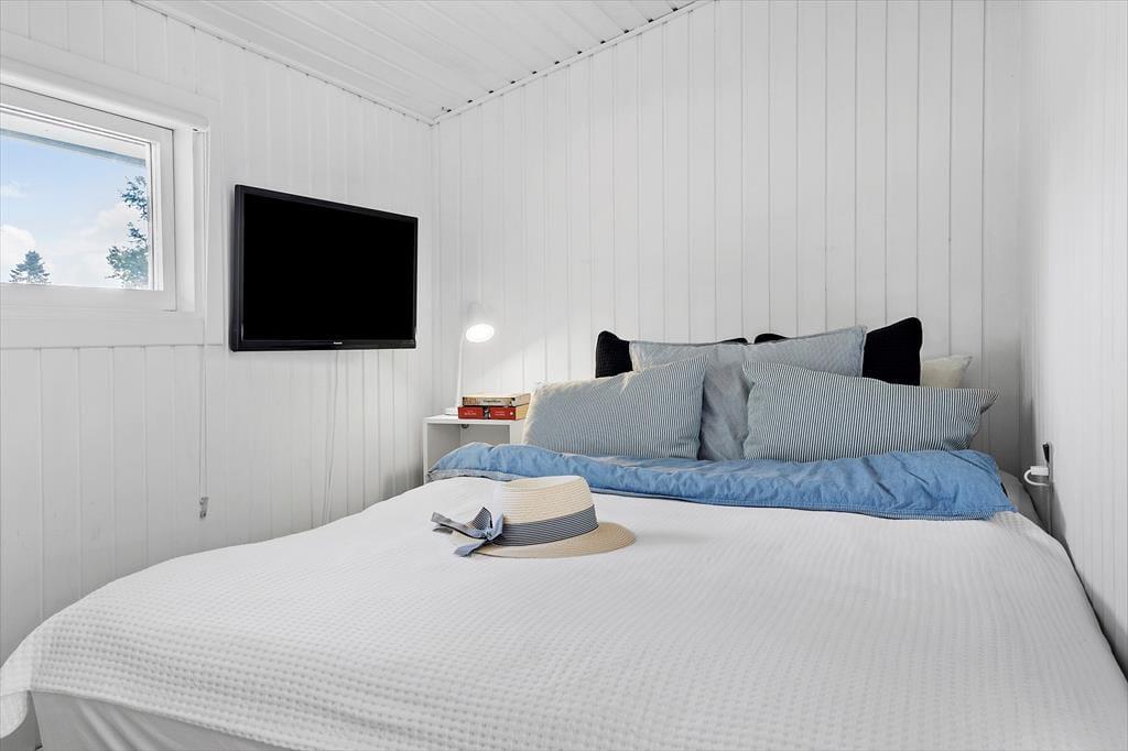 Sommerhuset har 2 fine soveværelser, begge udstyret med behagelige dobbeltsenge. Soveværelserne er placeret i hver ende af dette behagelige sommerhus. Fra det ene soveværelse er der direkte afgang til haven. Dette soveværelse er ideelt til den morgenfriske som nyder at stå op, slå døren op og høre fuglefløjt fra morgenstunden. I et af soveværelserne kan man slænge sig i sengen og se TV. Her er der ligesom i stuen danske, tyske, norske og svenske kanaler, samt en Chromecast hvortil I selv kan streame jeres ynglings programmer.