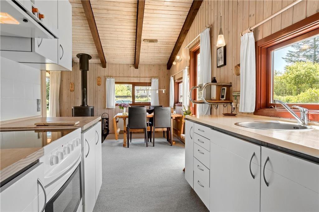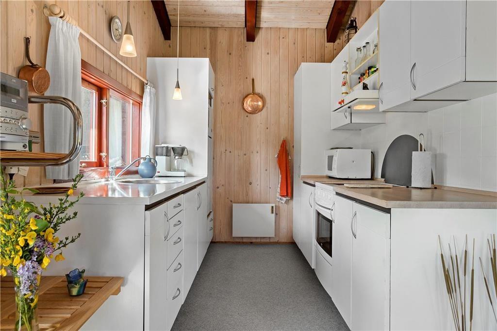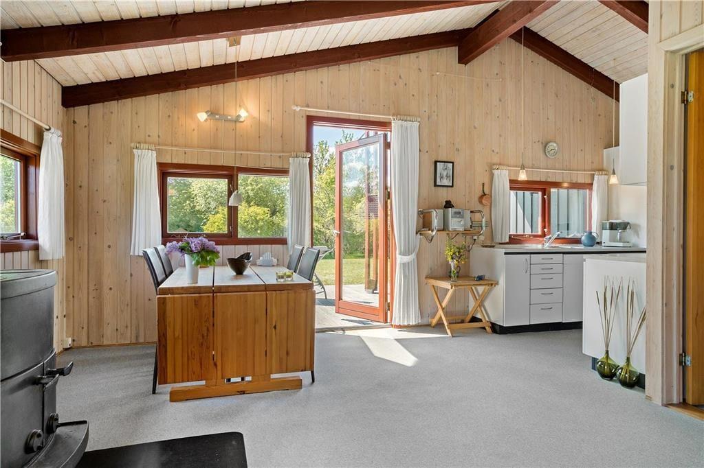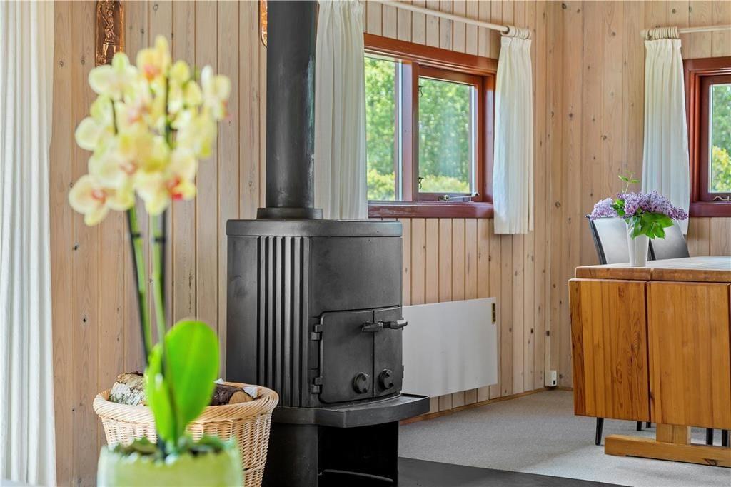 Sommerhuset er specielt og unikt. Det lyse køkken er i åben forbindelse med stuen. I den hyggelige stue er der stort 40 tommers fladskærms-TV og brændeovn og udgang til den dejlige terrasse. Tre hyggelige soverum med god plads. Badeværelset er med brus og her er gulvvarme. Køkkenet er nyere og funktionelt med nyt keramisk komfur.