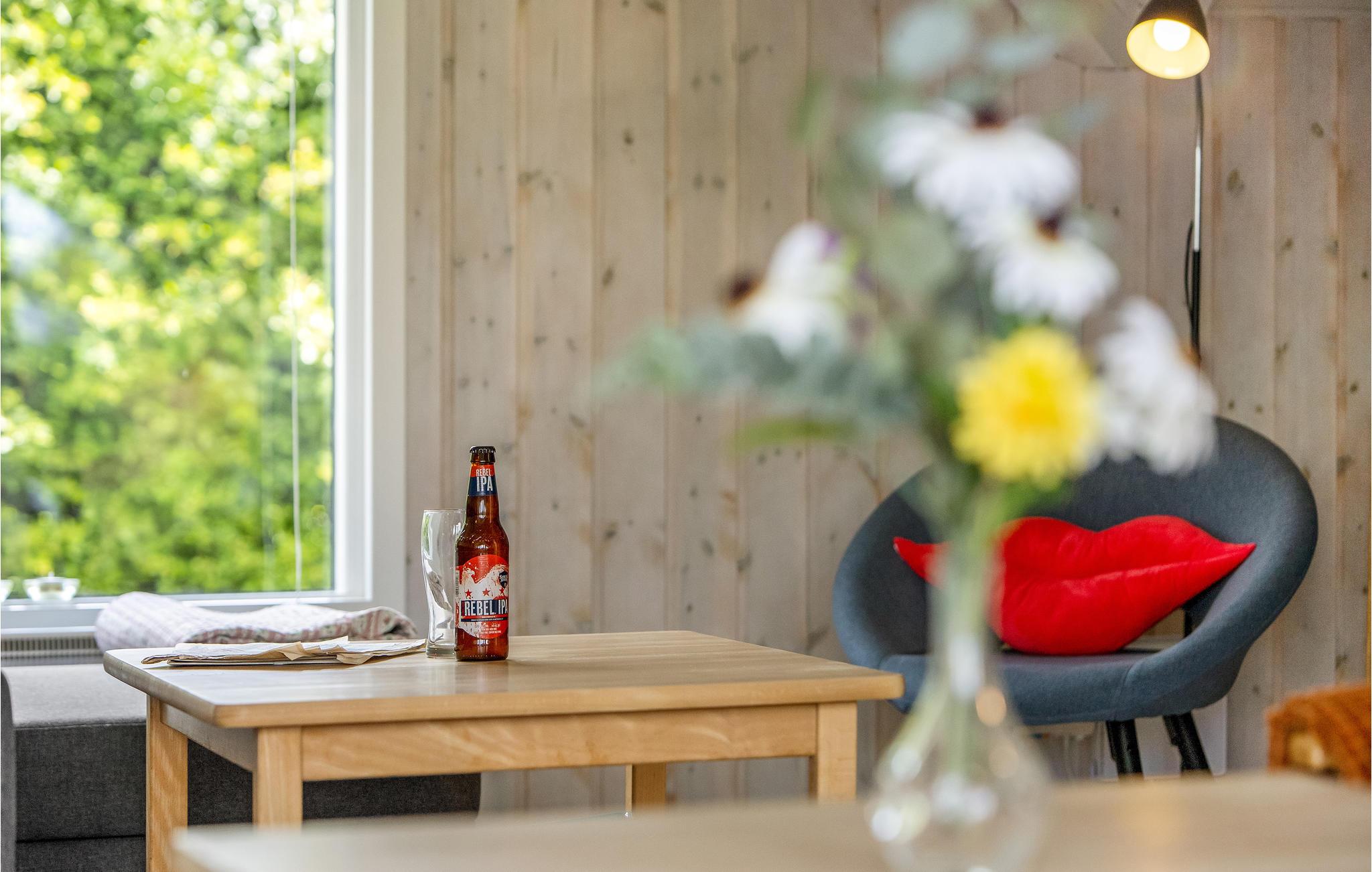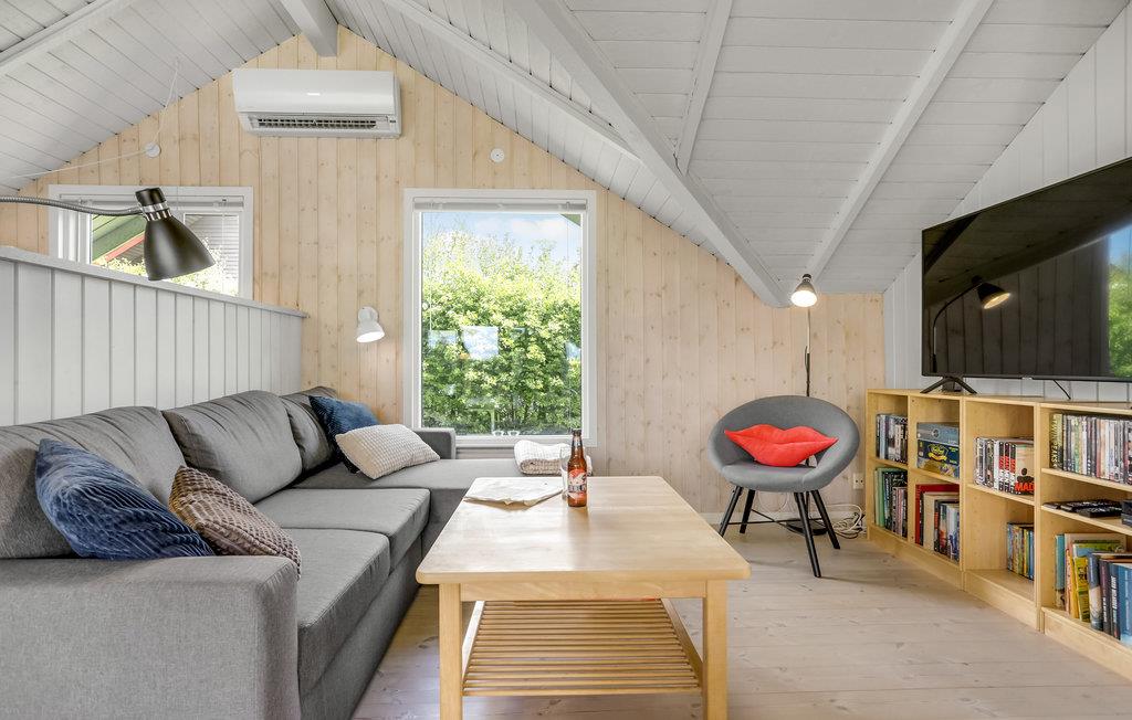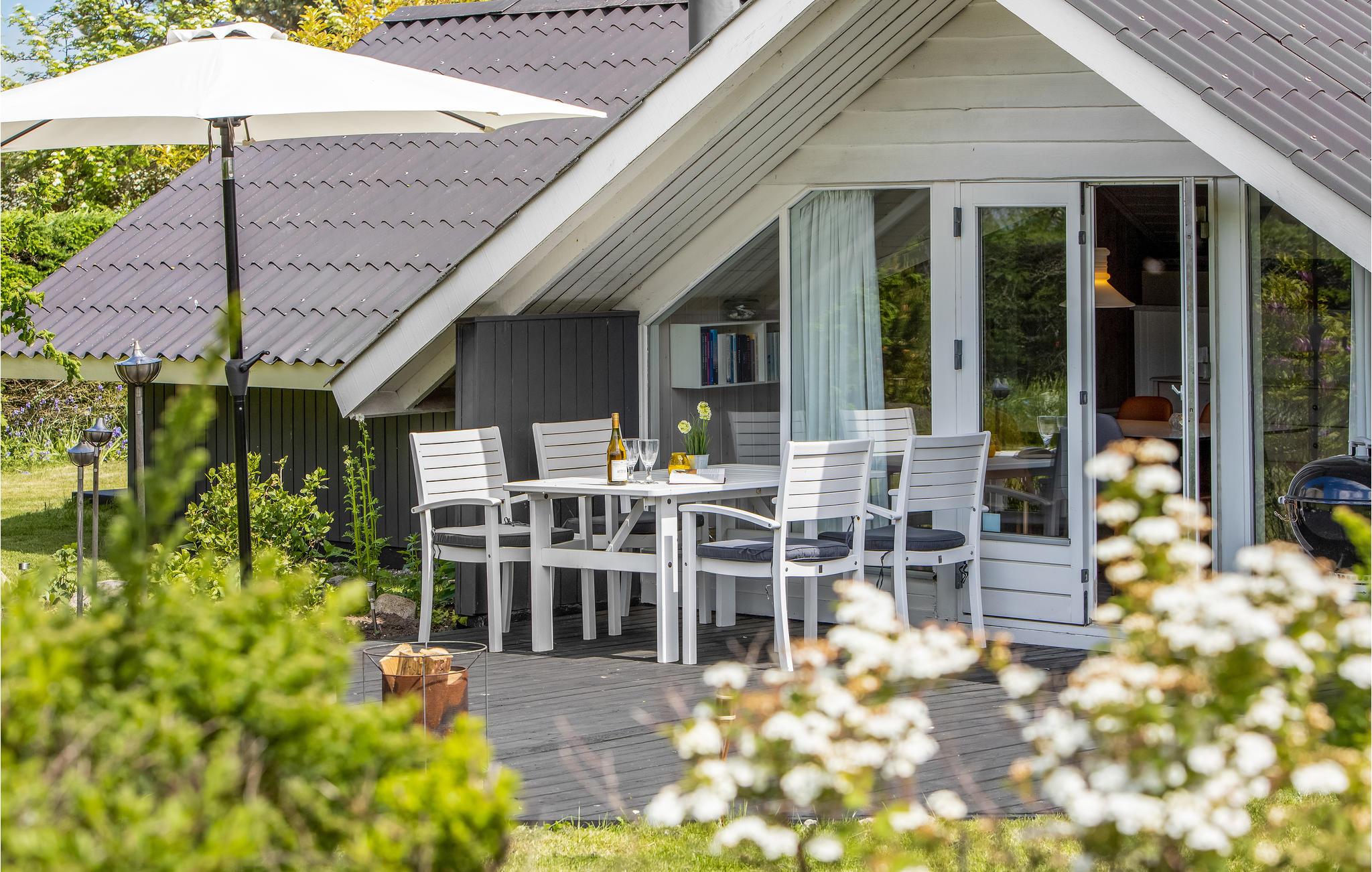 Hyggeligt feriehus tæt på fredelig sandstrand med sauna og flere terrasser i naturskønne omgivelser.