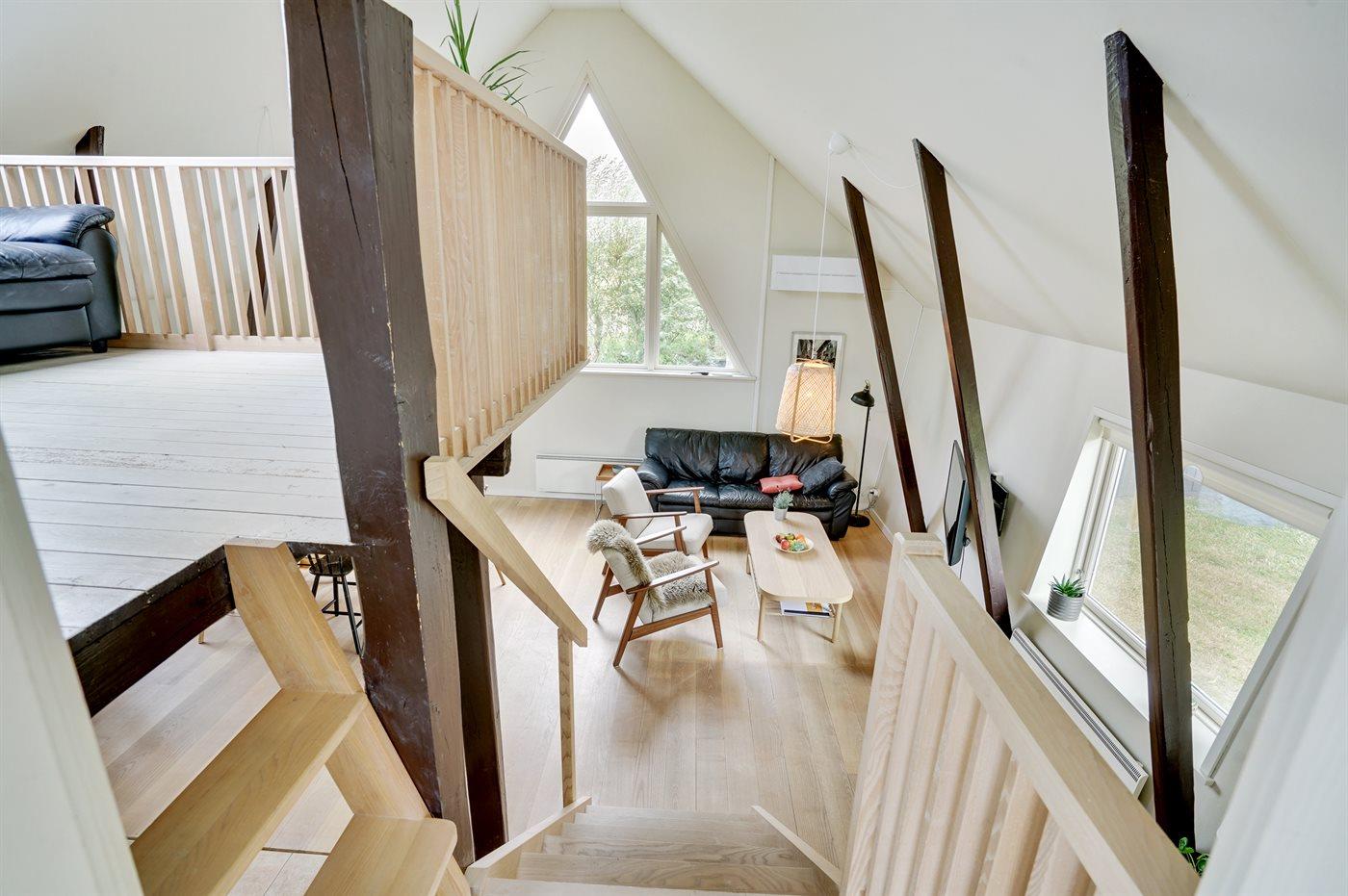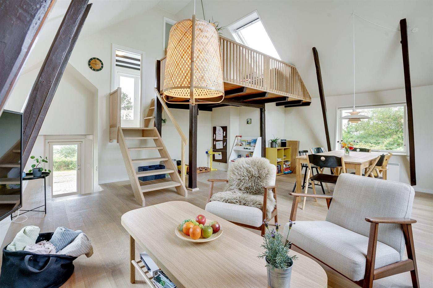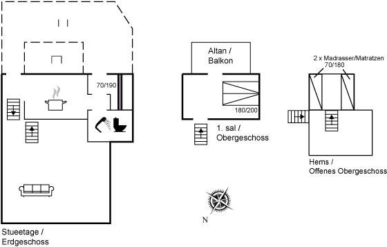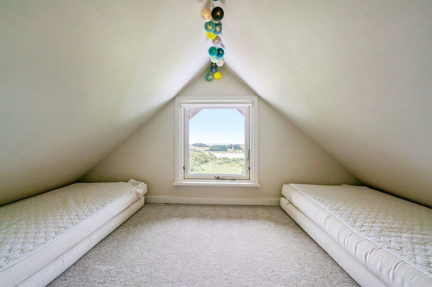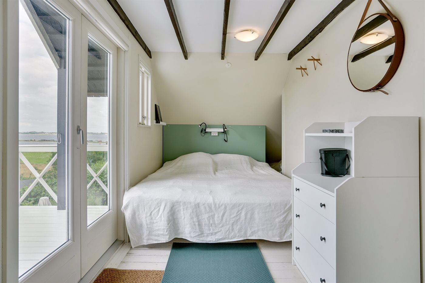 Der er i alt 2 soveværelser. Sovepladserne fordeler sig på: 2 sovepladser i dobbeltseng. 2 sovepladser i køjeseng. 2 sovepladser på madrasser. 2 af disse sovepladser befinder sig på husets hems. Derudover er der 1 stk. barneseng.