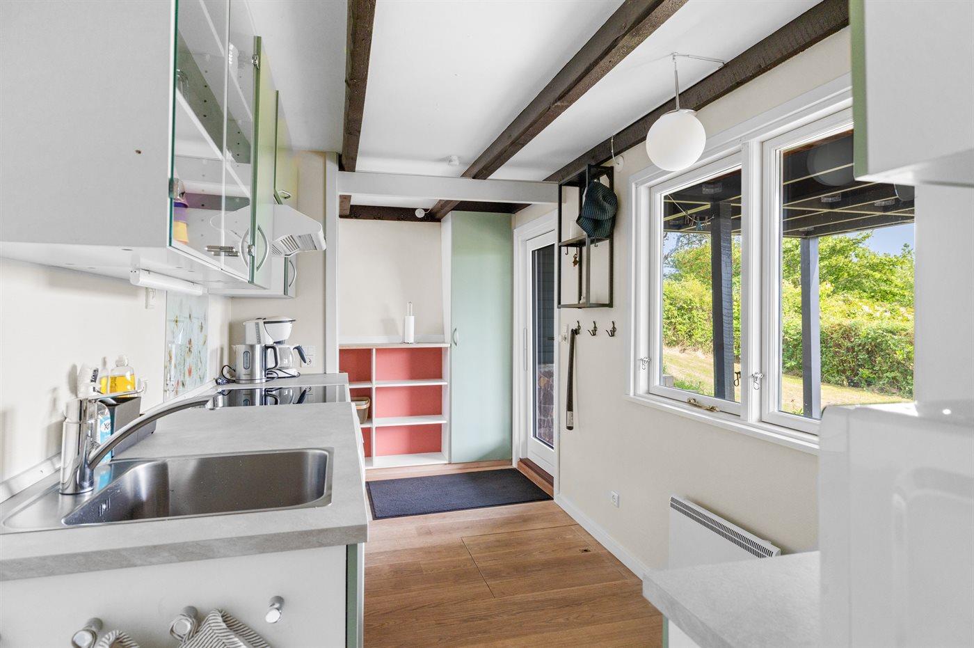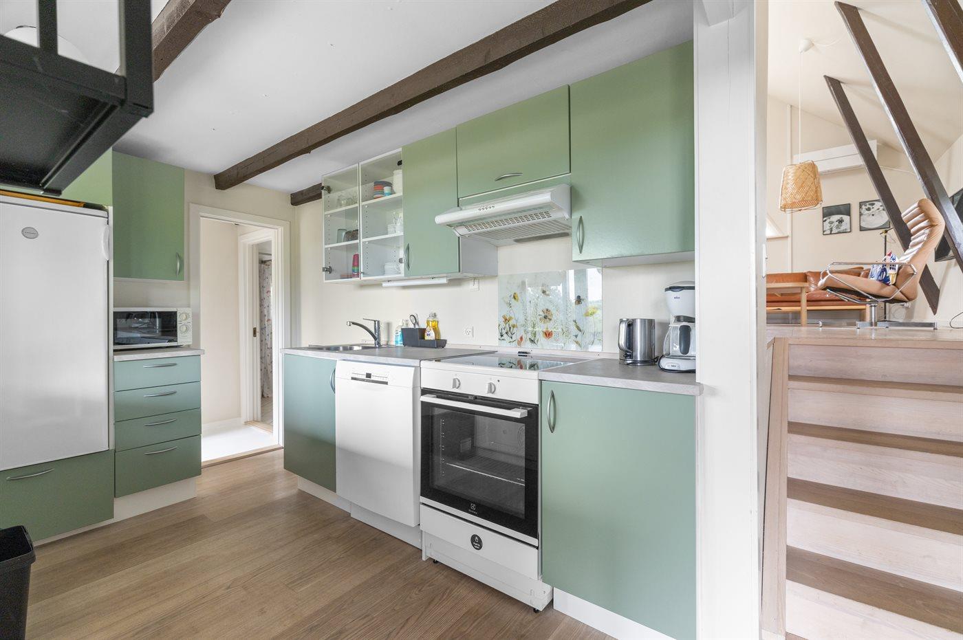 Køkkenet er udstyret med 1 køleskab. Der er 4 keramiske kogeplader, varmluftovn, mikrobølgeovn samt opvaskemaskine.