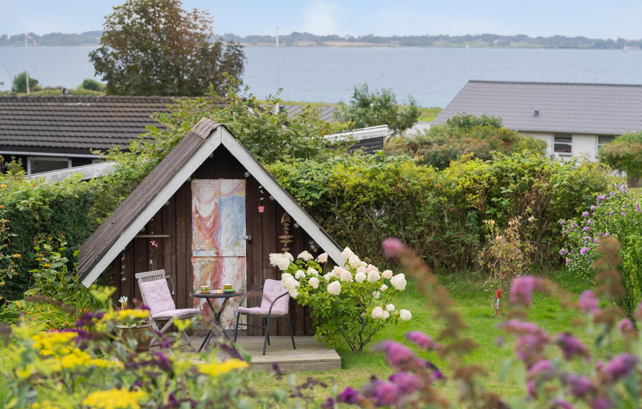 Charmerende sommerhus ved Sydfyn med panoramaudsigt over vandet og flere terrasser til solrige dage.