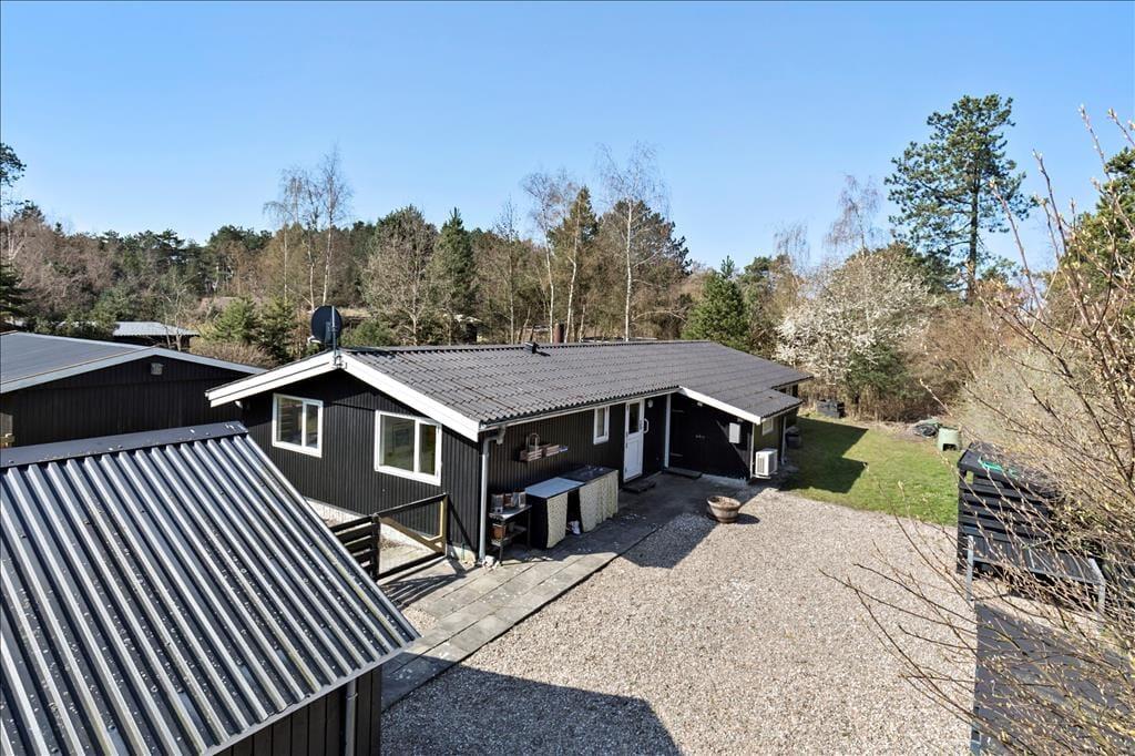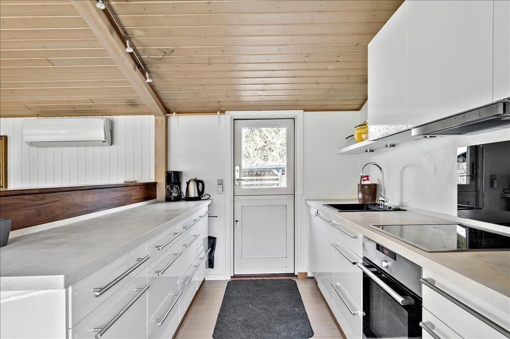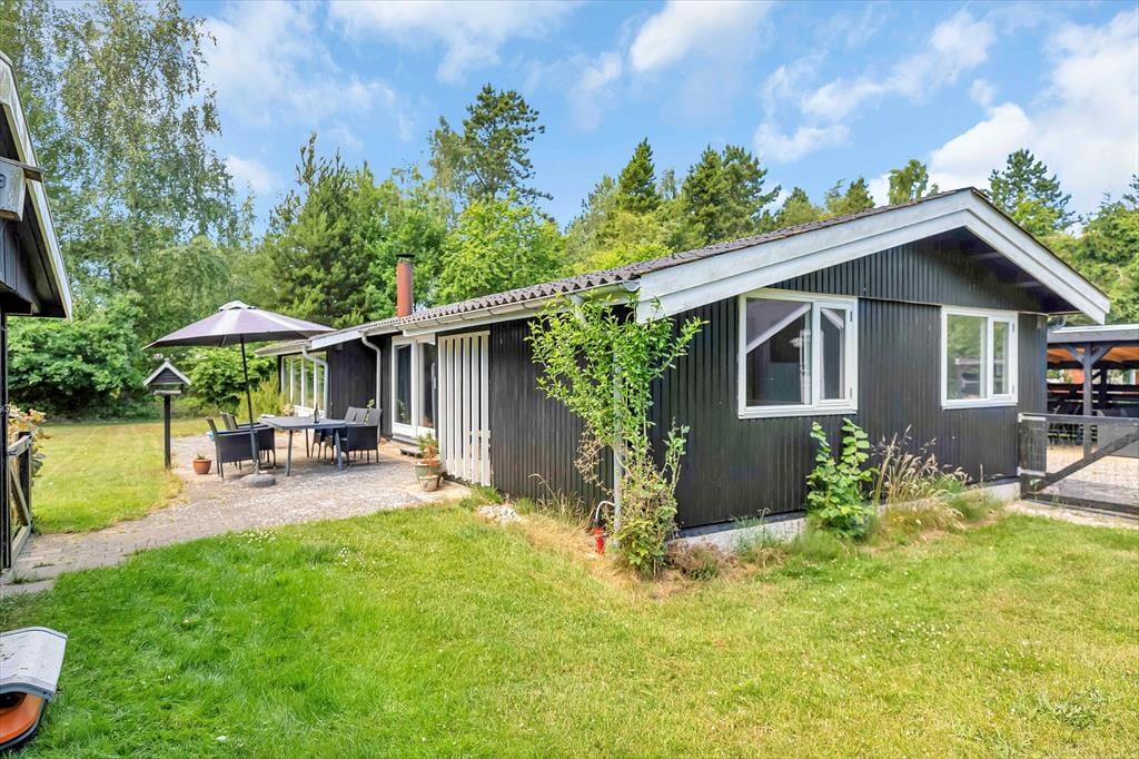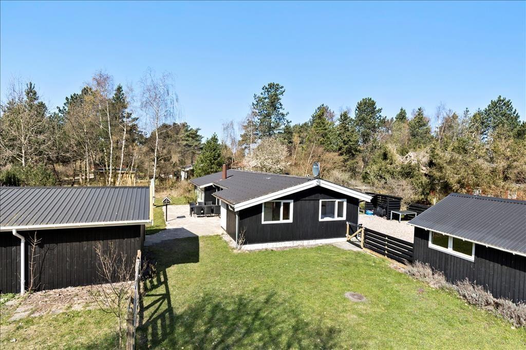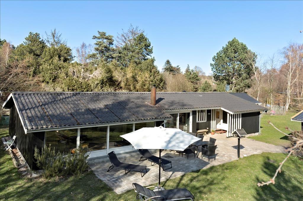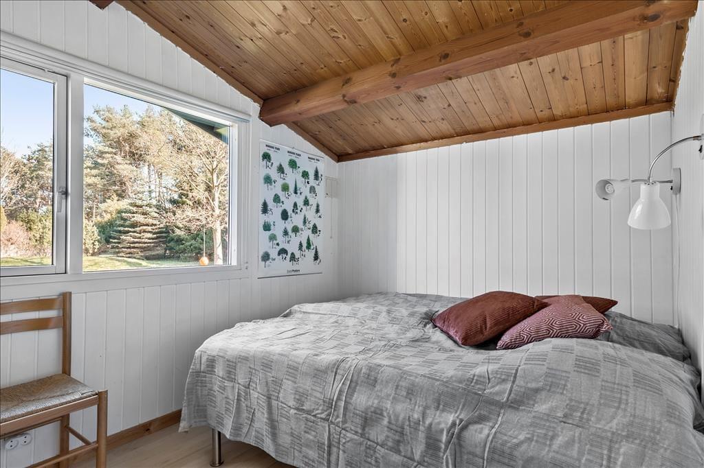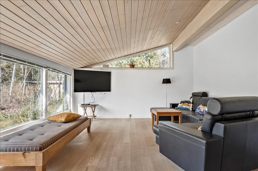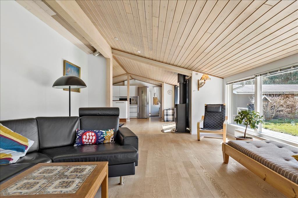 Huset indeholder stue og køkken i ét med loft til kip. I køkkenet er der opvaskemaskine og mikroovn og stuen indeholder TV, brændeovn og varmepumpe, hvilket gør huset egnet til ferie året rundt. Fra de fantastiske panoramavinduer, har du kig til den hyggelige og ugenerte have, hvor rådyrene krydser jævnligt. I huset er der desuden 3 gode værelser med dobbeltsenge og ligeledes et anneks med dobbeltseng. Badeværelset er med brus. På den sydvendte flise terrasse er der optimale solforhold og i indkørslen er der arrangeret et godt udekøkken og tæt på huset, er der slæbested til båd.