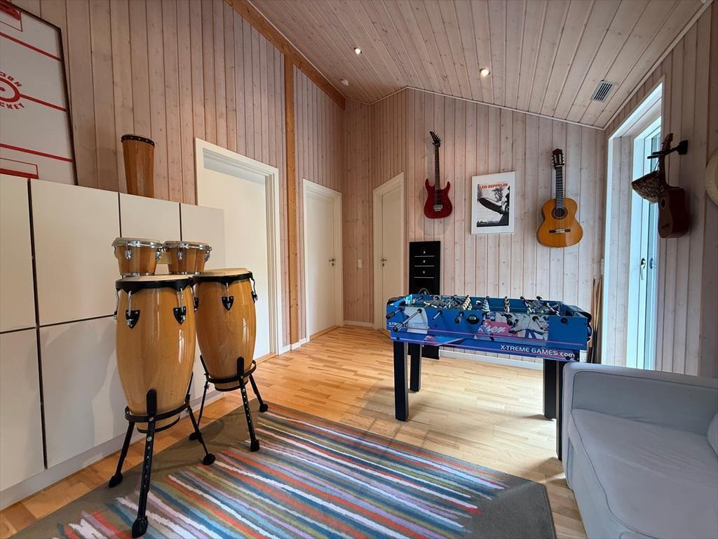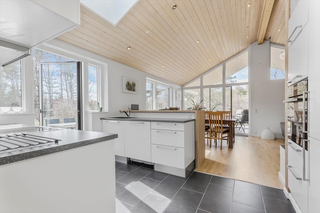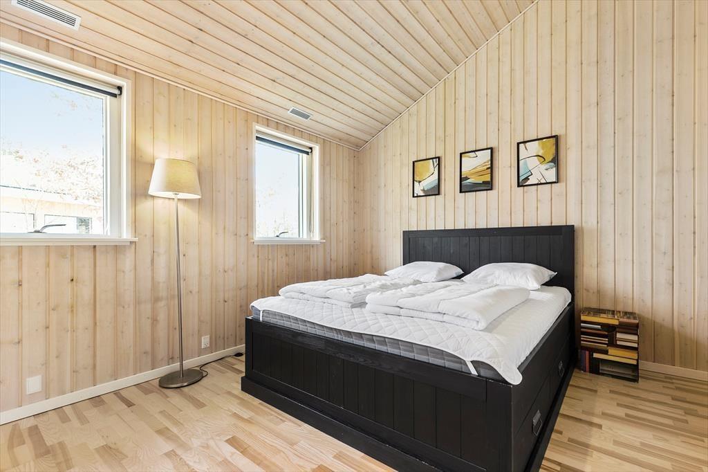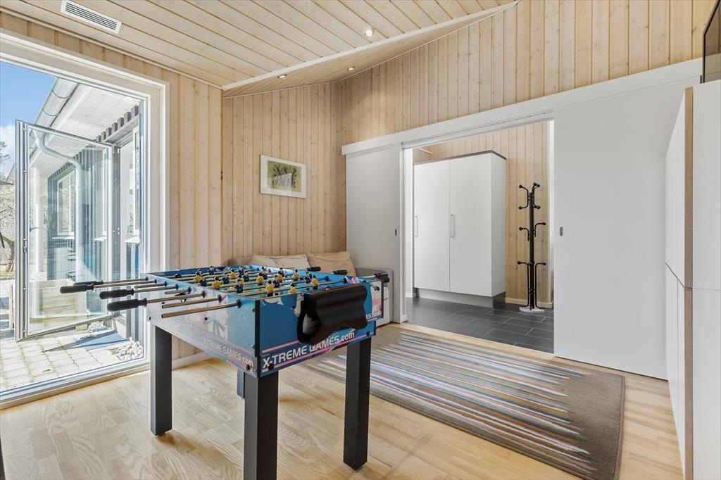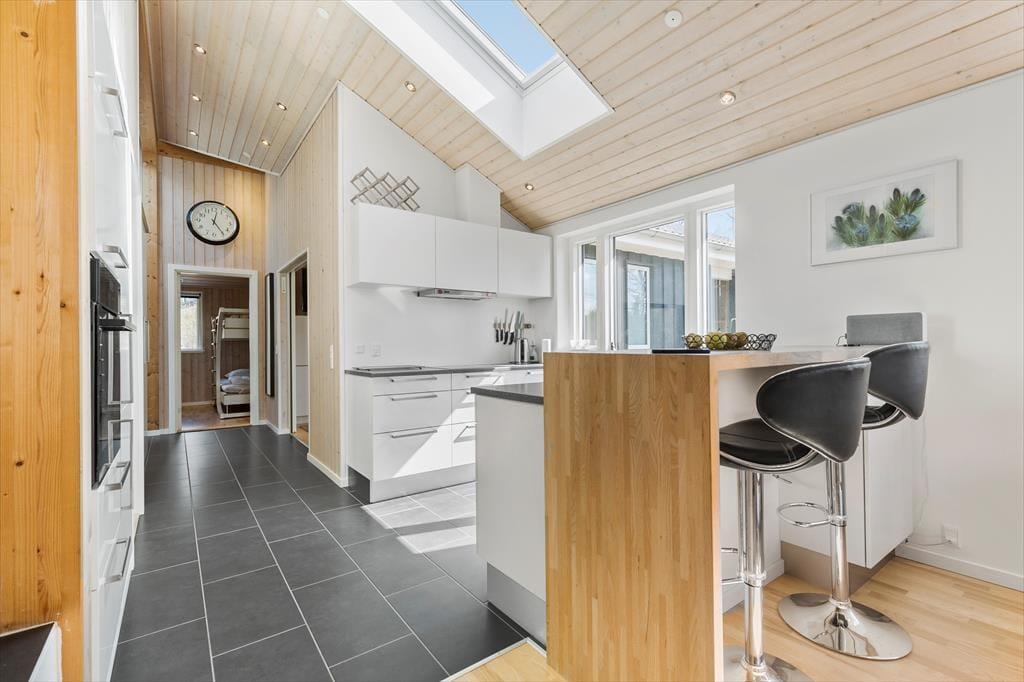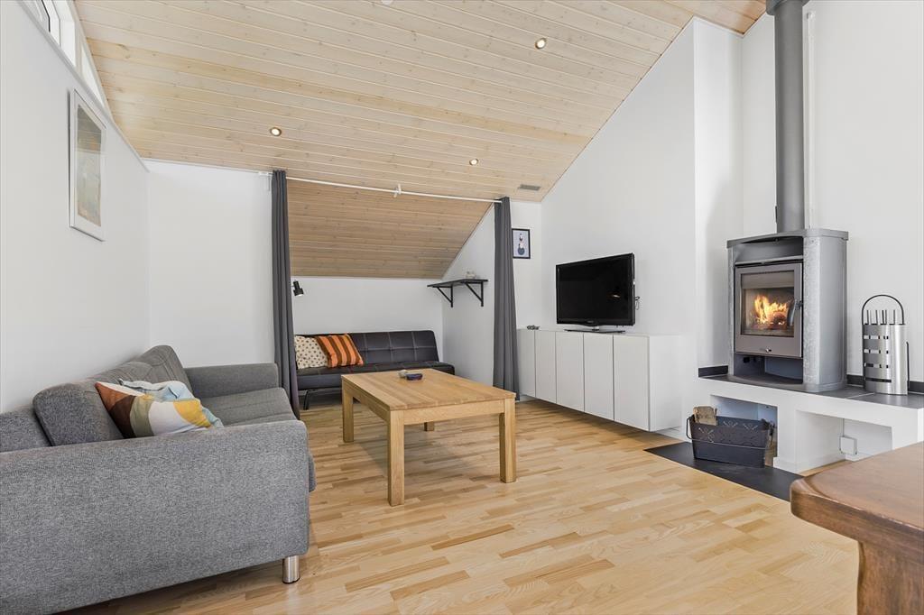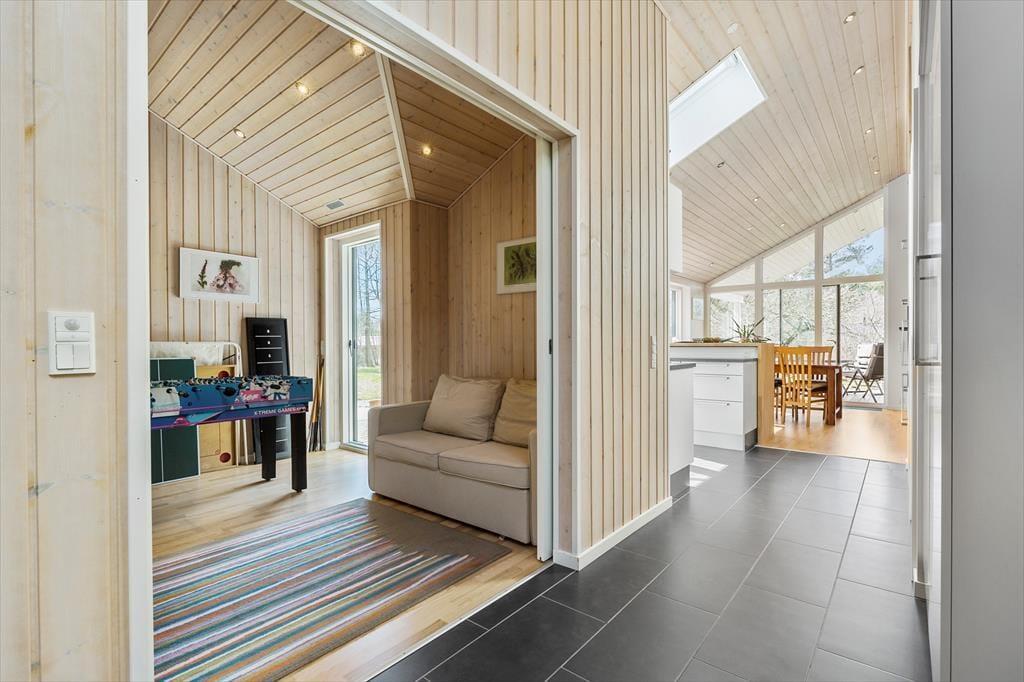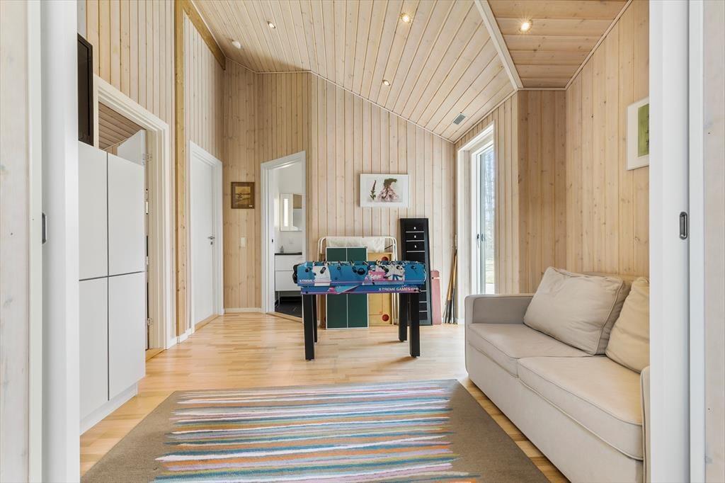 Træd ind i et hyggeligt og funktionelt ferieparadis! Dette dejlige træhus byder på et lyst og åbent opholdsrum med store vinduespartier, der lader solen danse ind og skaber en afslappet atmosfære. Stuen er indrettet med komfortable møbler og en brændeovn, som indbyder til hyggelige aftener med familie og venner. Det åbne køkken-alrum gør det nemt at være sammen, uanset om der forberedes måltider eller nydes et glas vin ved spisebordet. Huset har tre soveværelser og et lækkert badeværelse. Aktivitetsrummet er proppet med spil og instrumenter til en hyggelig dag indendørs.
