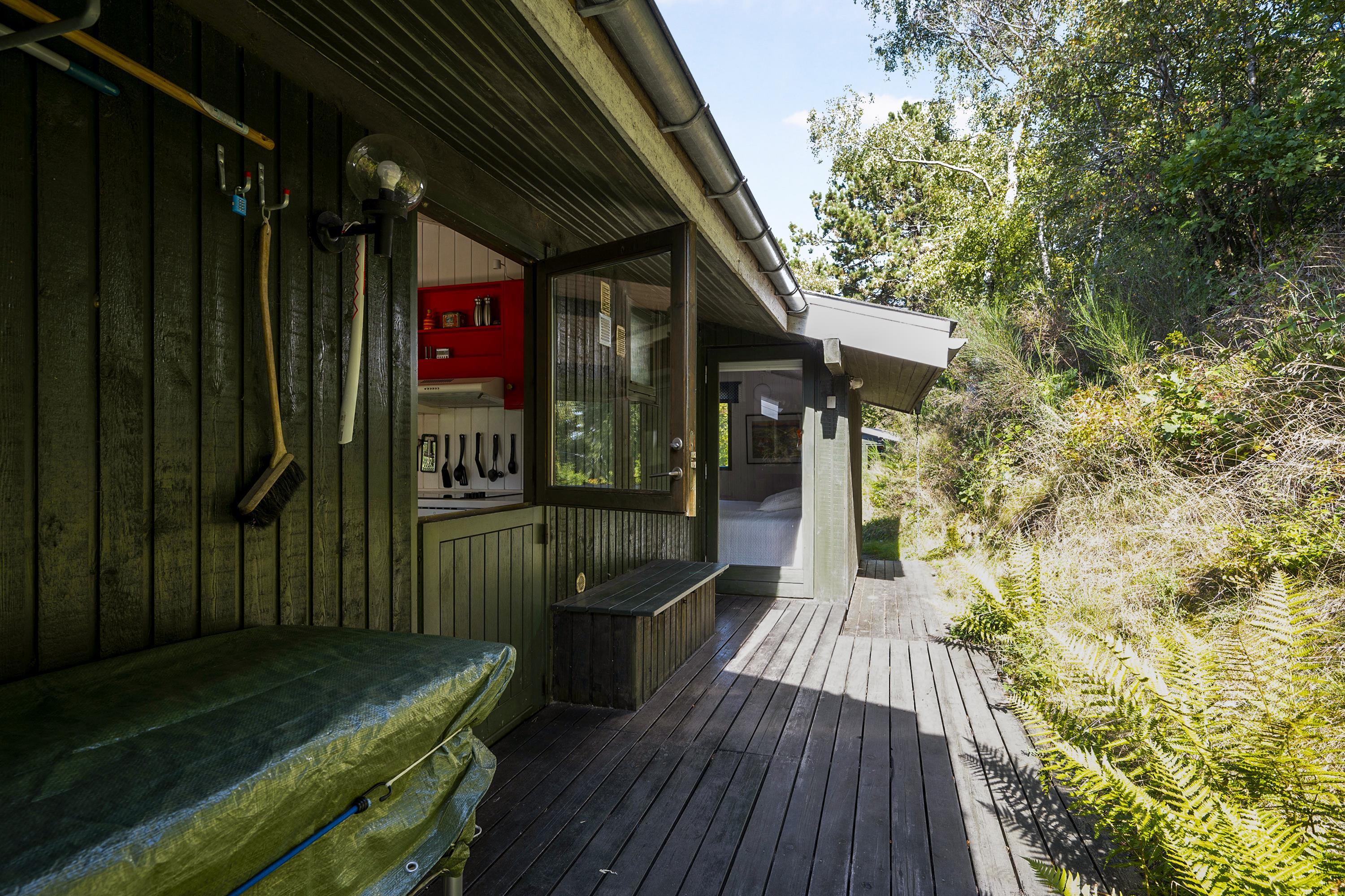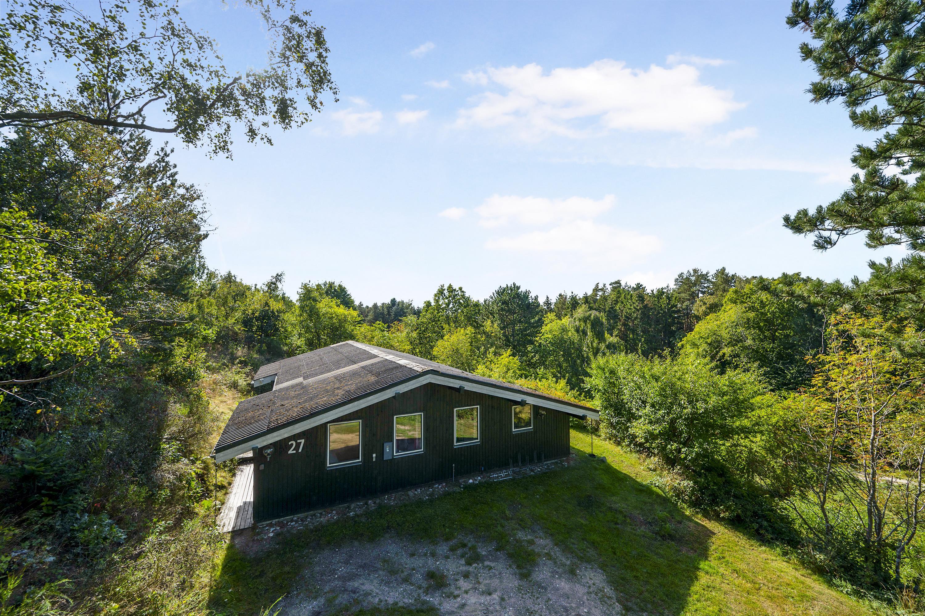 Dette ældre, velholdte og løbende moderniserede hus ligger højt og fuldstændig ugenert på kuperet naturgrund i skønt sommerhusområde i det østlige Ebeltoft. Der er dejlig, delvist overdækket syd- og vestvendt træterrasse på tre af husets sider med havemøbler, liggestole, parasol og grill. På den store grund er der gynger til børnene.