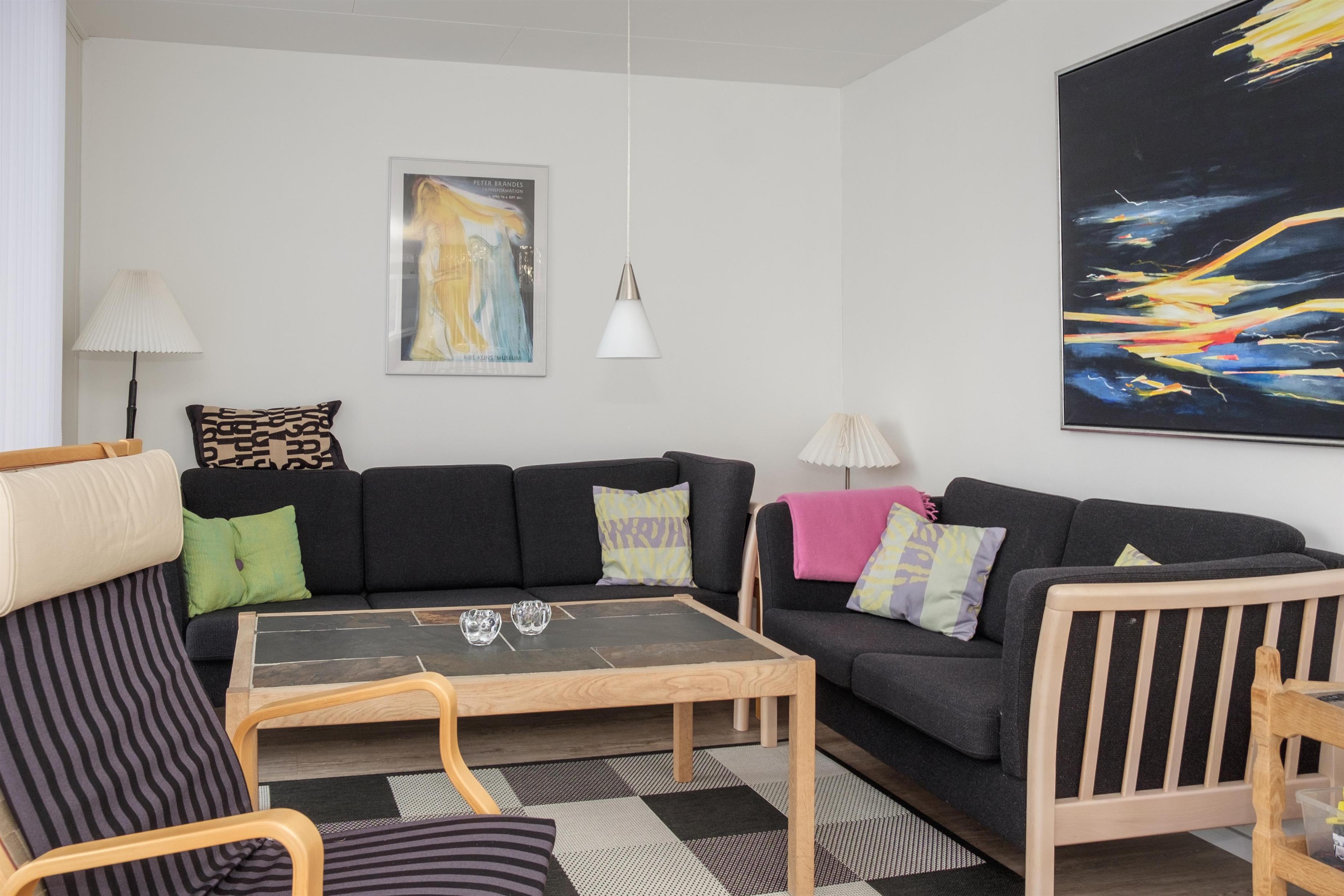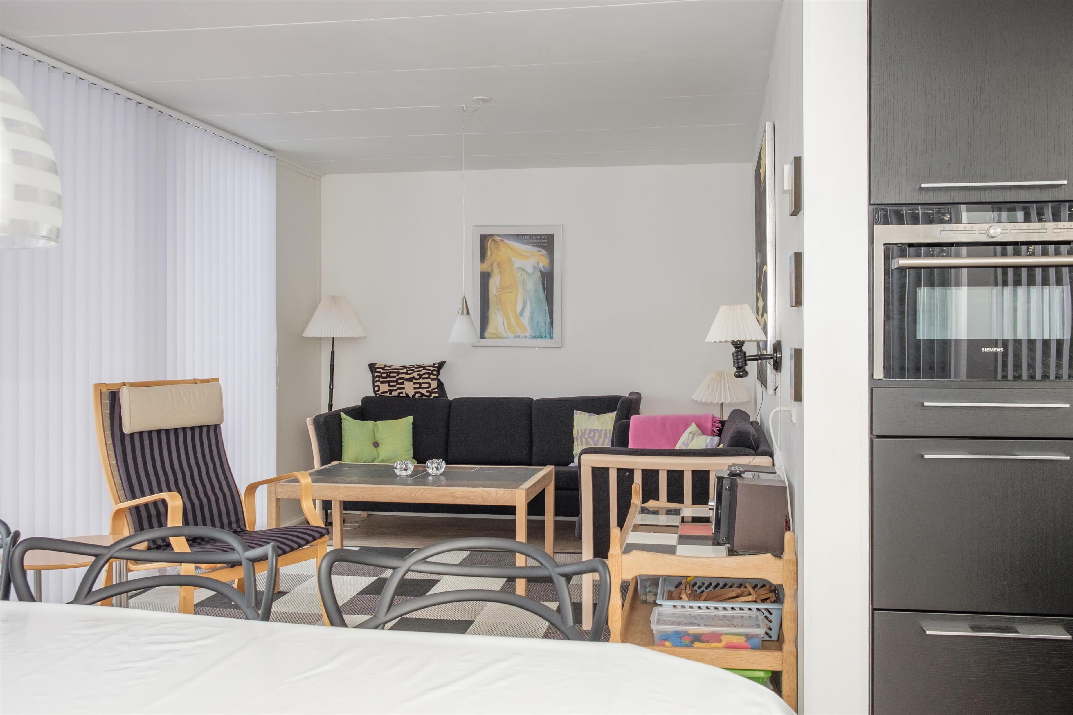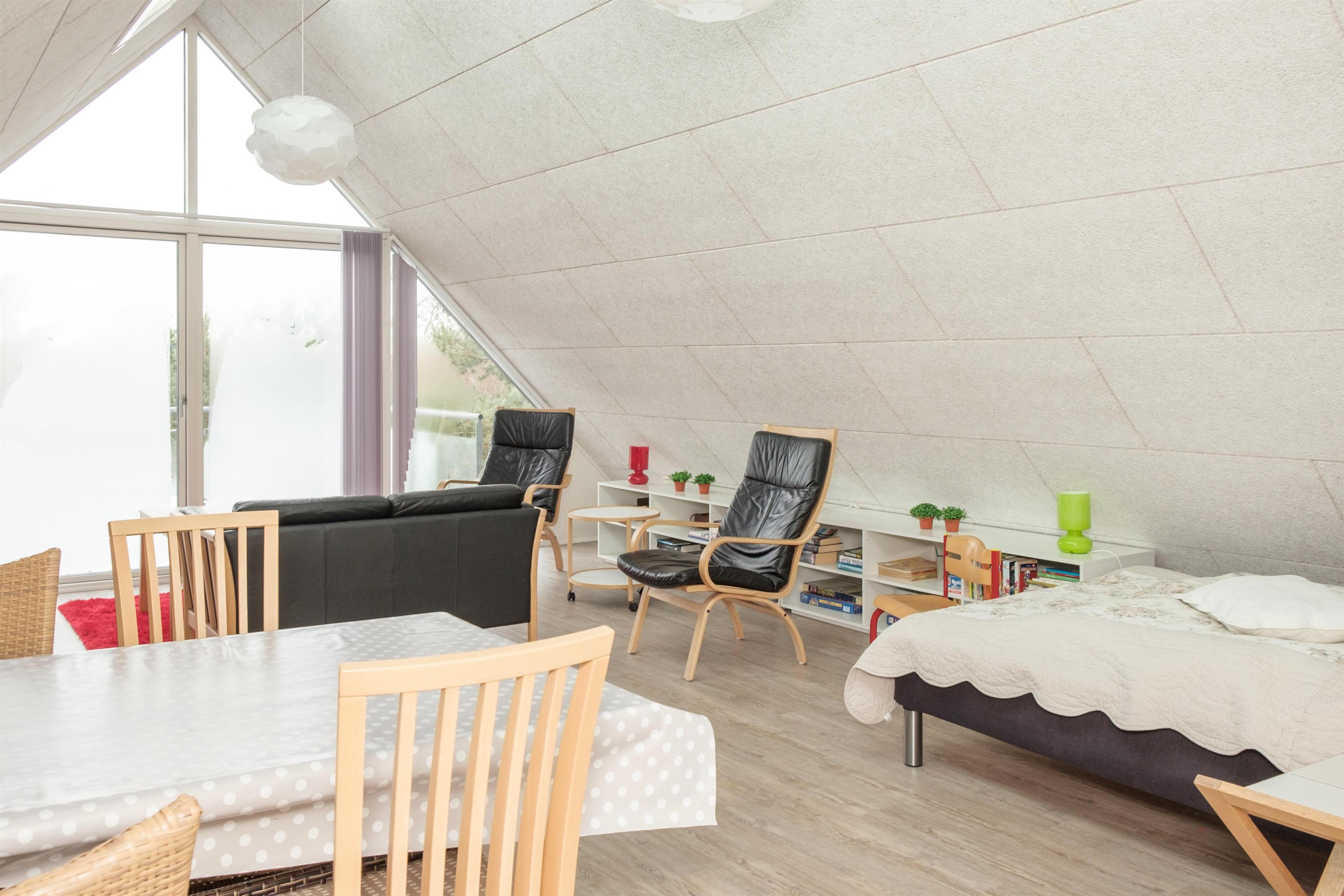 De store vinduespartier mod vest og syd giver masser af lys i stuen, som har spiseplads til 6 personer, TV med danske (inkl. TV2) og tyske kanaler, CD-afspiller og radio. I åben forbindelse hermed ligger det store, nye køkken med køle-/fryseskab, opvaskemaskine, keramiske kogeplader, indbygningsovn og mikrobølgeovn. Lækkert badeværelse med gulvvarme og infrarød sauna. Praktisk bryggers med bordvask og vaskemaskine. På 1. sal finder man en lys og rummelig opholdsstue med udgang til altan. De 6 sovepladser fordeler sig på 1 soveværelse i stueplan med dobbeltseng, 1 værelse på 1. sal med 2 enkeltsenge samt barneseng, og 1 dobbeltseng i opholdsstuen på 1. sal. Huset er yderst børnevenligt indrettet med børnegitter øverst på trappen til 1. sal, babybadekar og højstol, sandkasse og legeredskaber på grunden. Internetadgang.