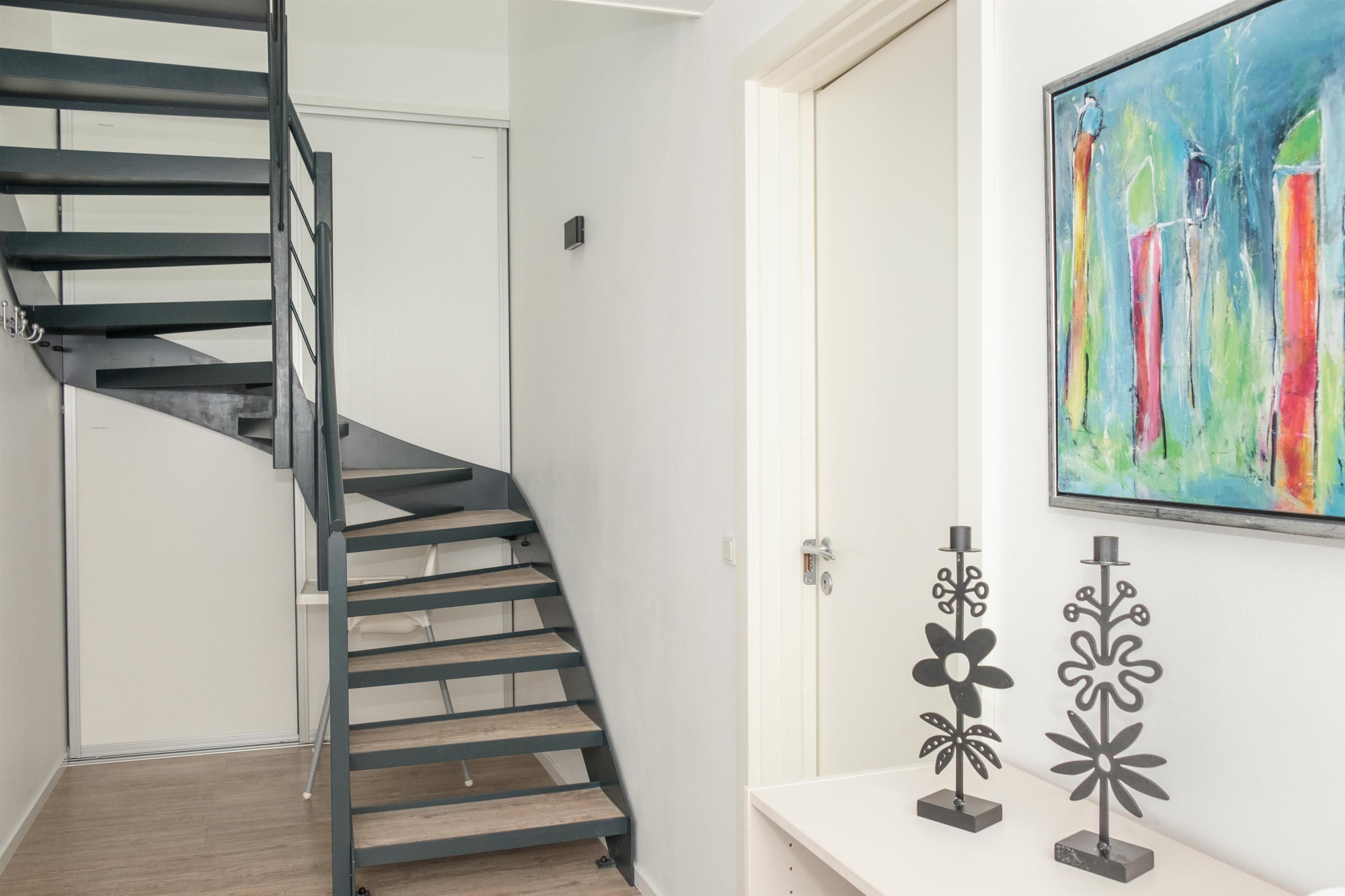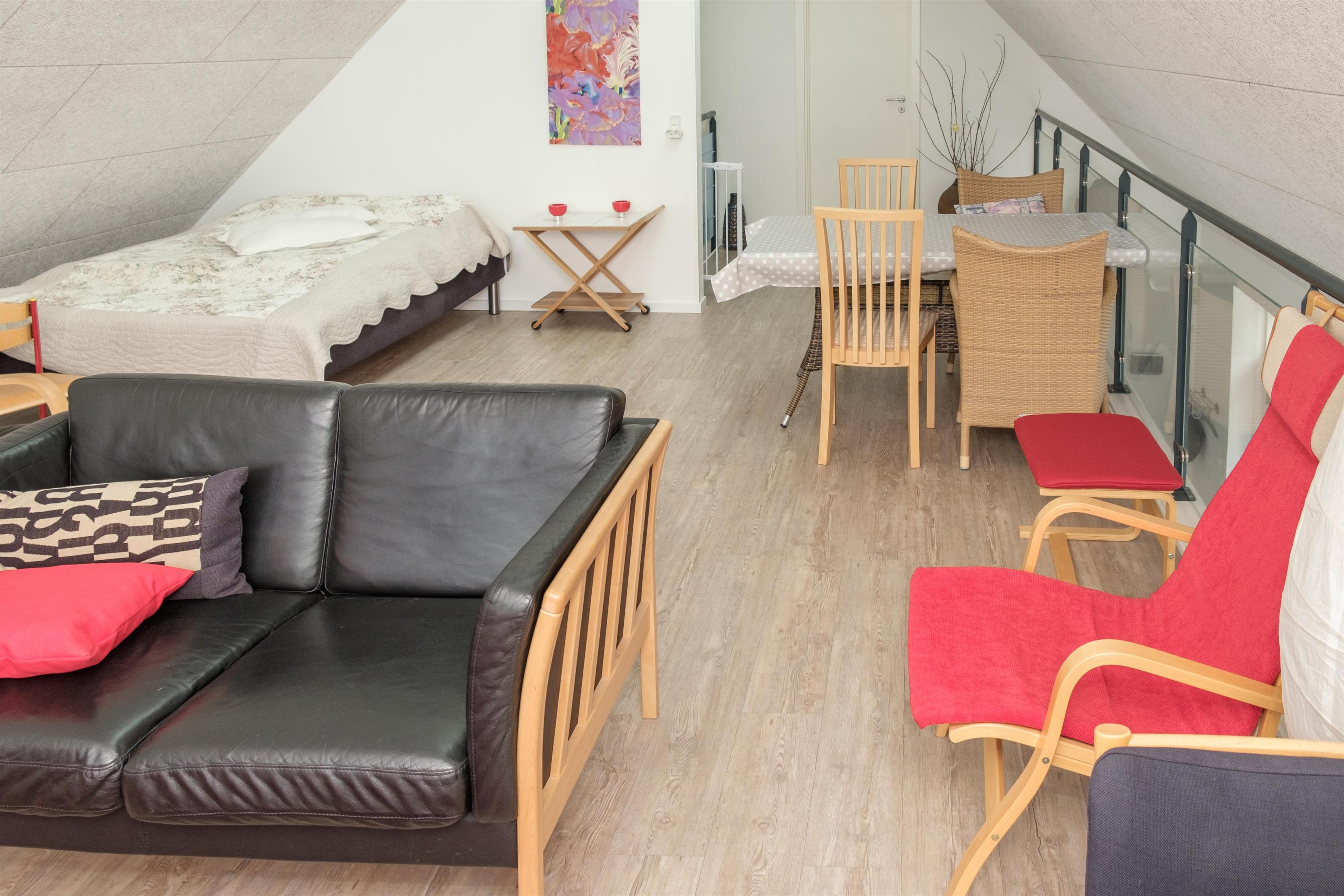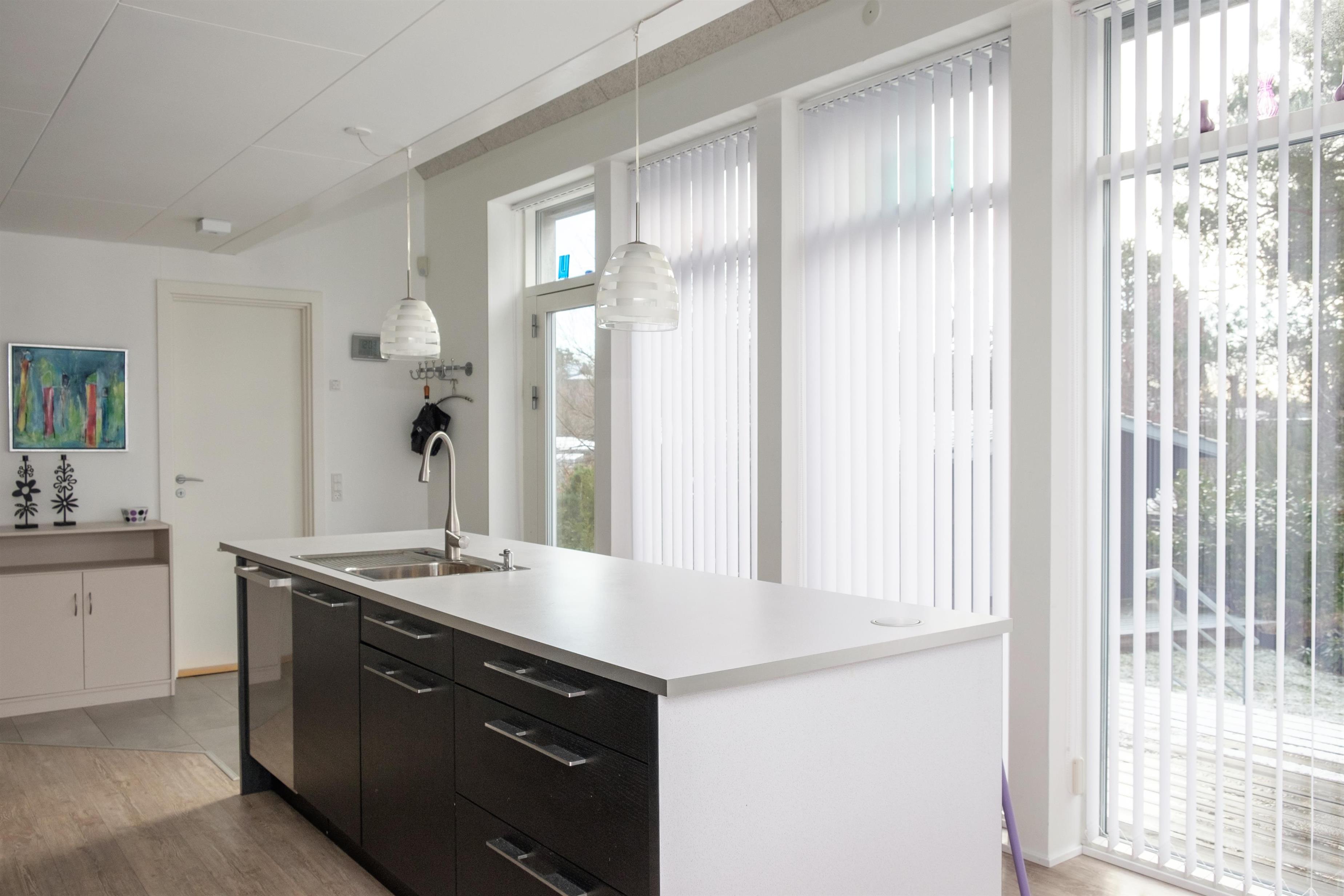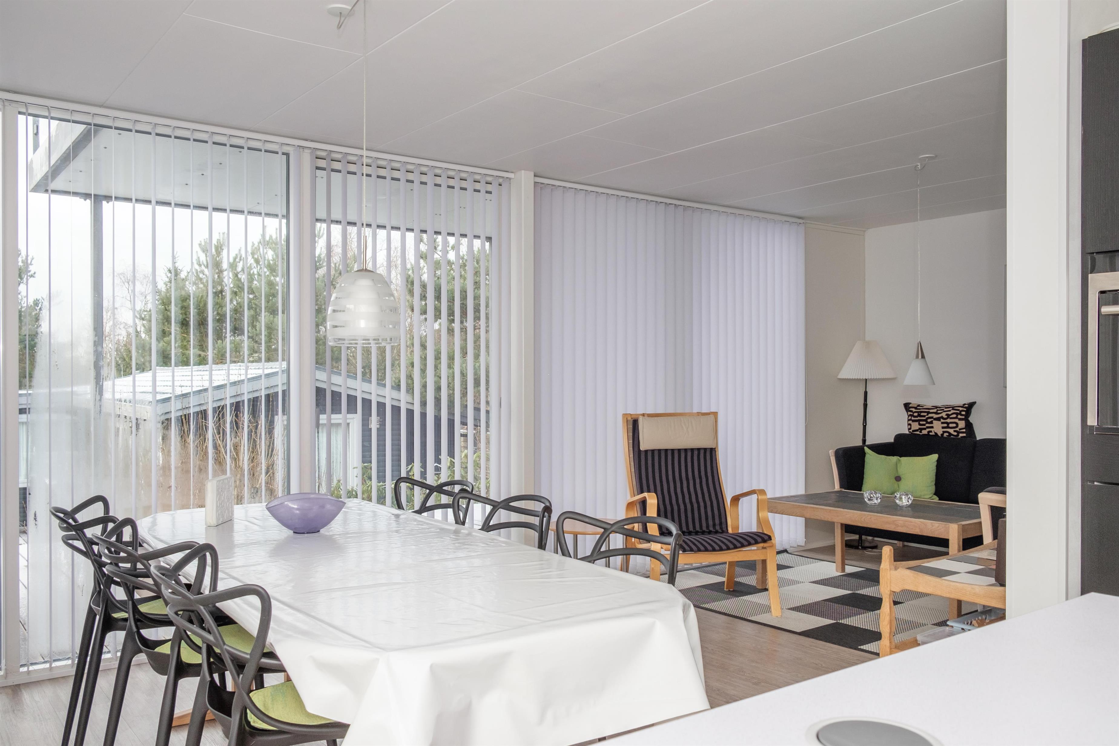 De store vinduespartier mod vest og syd giver masser af lys i stuen, som har spiseplads til 6 personer, TV med danske (inkl. TV2) og tyske kanaler, CD-afspiller og radio. I åben forbindelse hermed ligger det store, nye køkken med køle-/fryseskab, opvaskemaskine, keramiske kogeplader, indbygningsovn og mikrobølgeovn. Lækkert badeværelse med gulvvarme og infrarød sauna. Praktisk bryggers med bordvask og vaskemaskine. På 1. sal finder man en lys og rummelig opholdsstue med udgang til altan. De 6 sovepladser fordeler sig på 1 soveværelse i stueplan med dobbeltseng, 1 værelse på 1. sal med 2 enkeltsenge samt barneseng, og 1 dobbeltseng i opholdsstuen på 1. sal. Huset er yderst børnevenligt indrettet med børnegitter øverst på trappen til 1. sal, babybadekar og højstol, sandkasse og legeredskaber på grunden. Internetadgang.