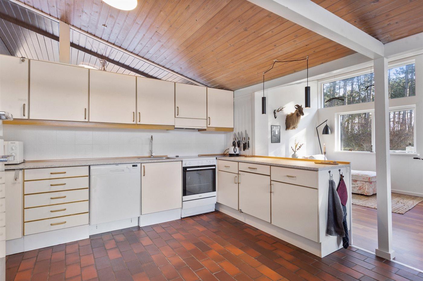 Indenfor i sommerhuset finder du alle de faciliteter, du har brug for til en komfortabel ferie. Køkkenet er veludstyret med en opvaskemaskine, en varmluftovn, en mikrobølgeovn og et køleskab. Der er også en vaskemaskine, en tørretumbler og en fryser med en kapacitet på 60 liter. I stuen er der en hyggelig brændeovn, som skaber en varm og indbydende atmosfære.