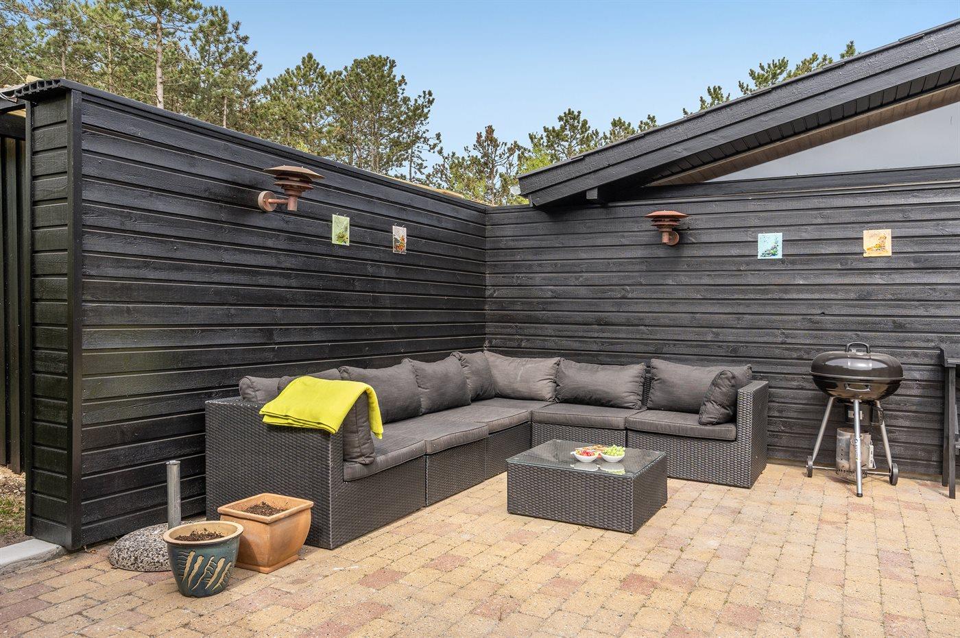 På den store naturgrund på 2016 m² er der rig mulighed for at nyde den friske luft og det smukke landskab omkring sommerhuset. Der er en åben terrasse, hvor du kan slappe af og nyde solen og en grill til rådighed, hvis du ønsker at lave mad udendørs. Der er også mulighed for at spille dart og bordfodbold i ferieboligen. Derudover har sommerhuset en stor græsplæne med en fodboldbane, en trampolin og et bålsted, hvor du kan hygge dig omkring bålet om aftenen.