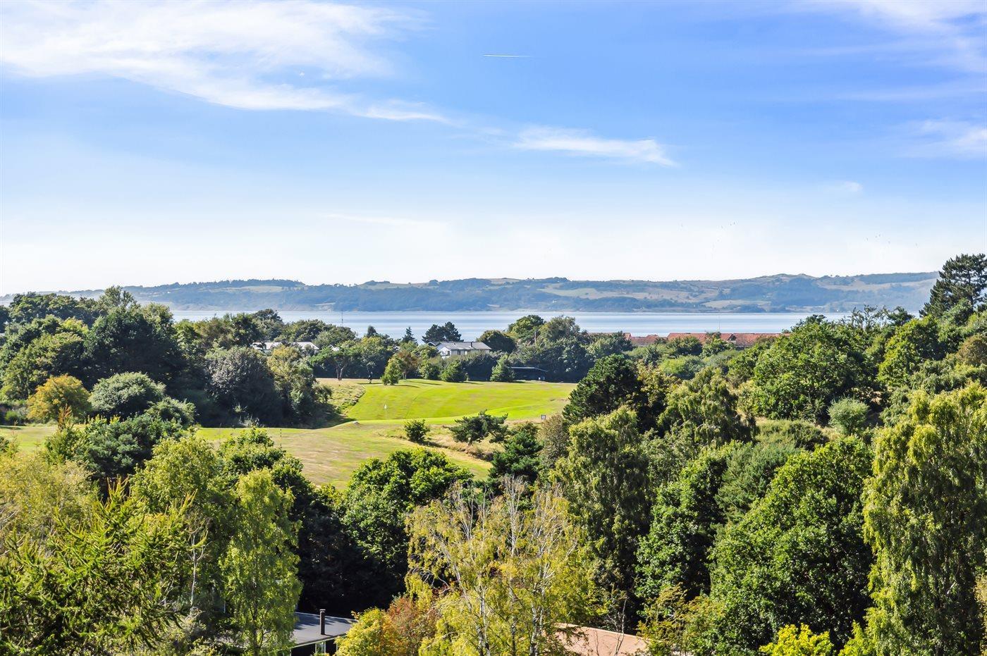 Moderne sommerhus i Ebeltoft med udsigt til golfbane, hav og byens vartegn, nyrenoveret og med stor træterrasse.