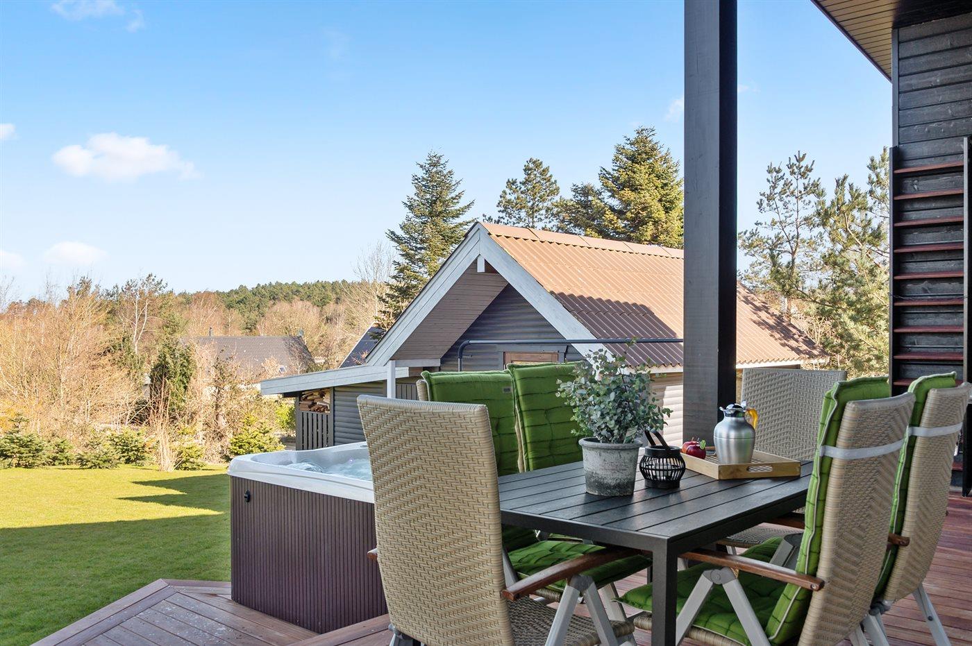 Helt nyt og indbydende sommerhus fra 2020 med en fantastisk beliggenhed tæt på såvel vandet som Ebeltoft bymidte. Sommerhuset er flot og gennemført i alle dets elementer, og fra både hus og grund er der udsigt over vandet og Ebeltoft Vig. På terrassen findes en stor spa, som kan benyttes hele året, og derudover er der også adgang til et saunarum, hvorfra havet kan skimtes i baggrunden. På grunden står et anneks til rådighed, hvor 2 af sovepladserne befinder sig.