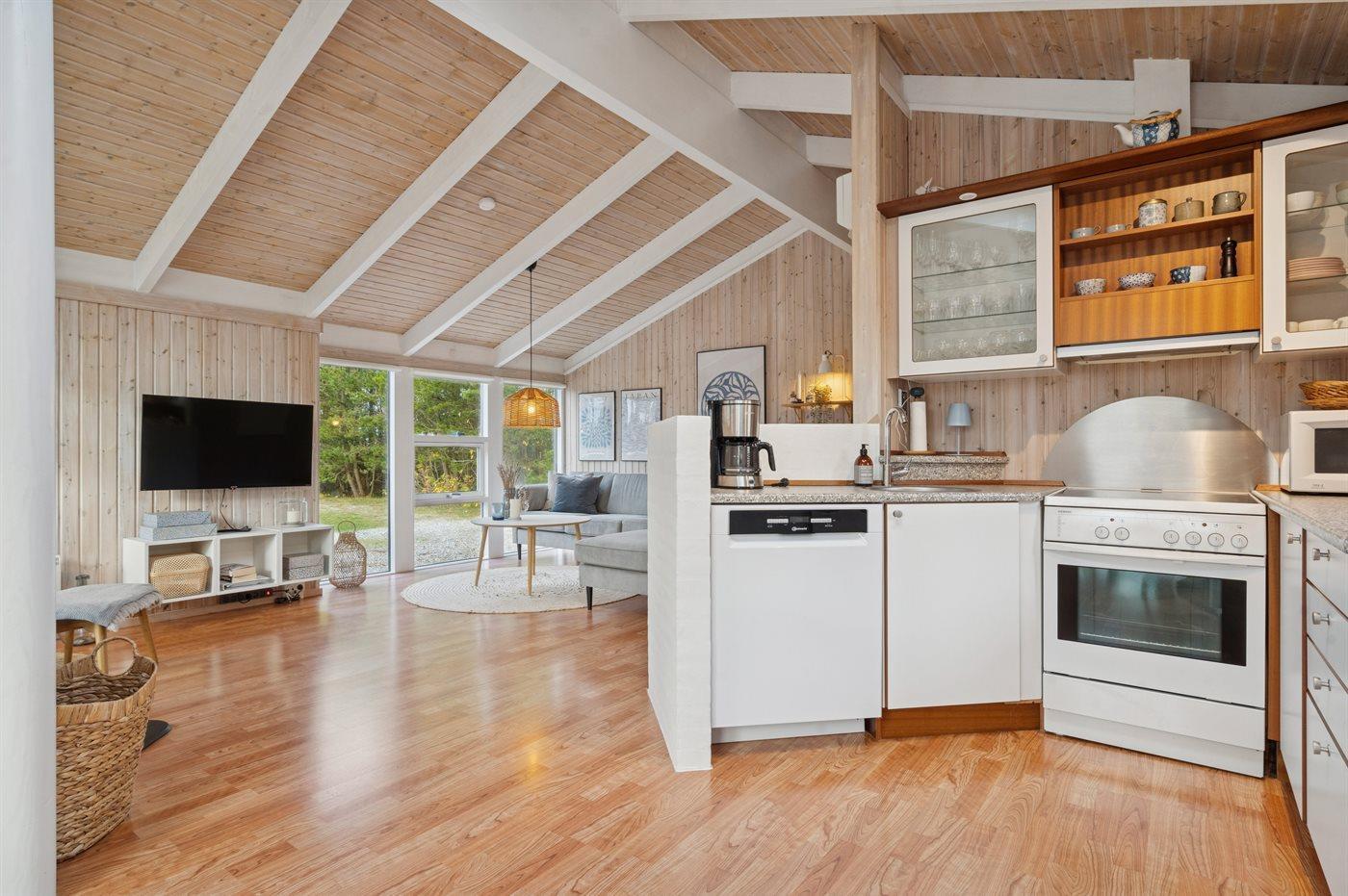 Køkkenet er udstyret med 1 køleskab. Der er 4 elkogeplader, varmluftovn, mikrobølgeovn samt opvaskemaskine.