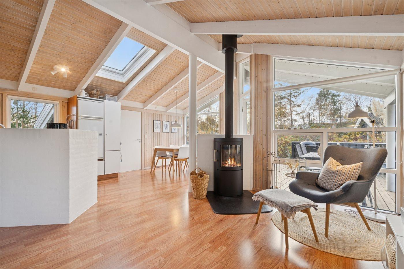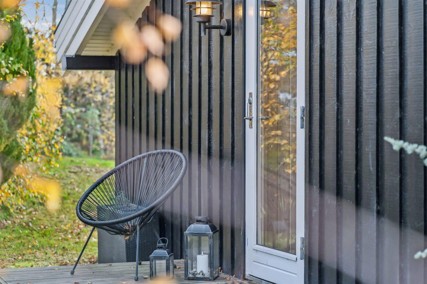 Skønt, velholdt og velindrettet sommerhus beliggende i naturskønne omgivelser tæt på vandet med udgang til terrassearealer med gode havemøbler.