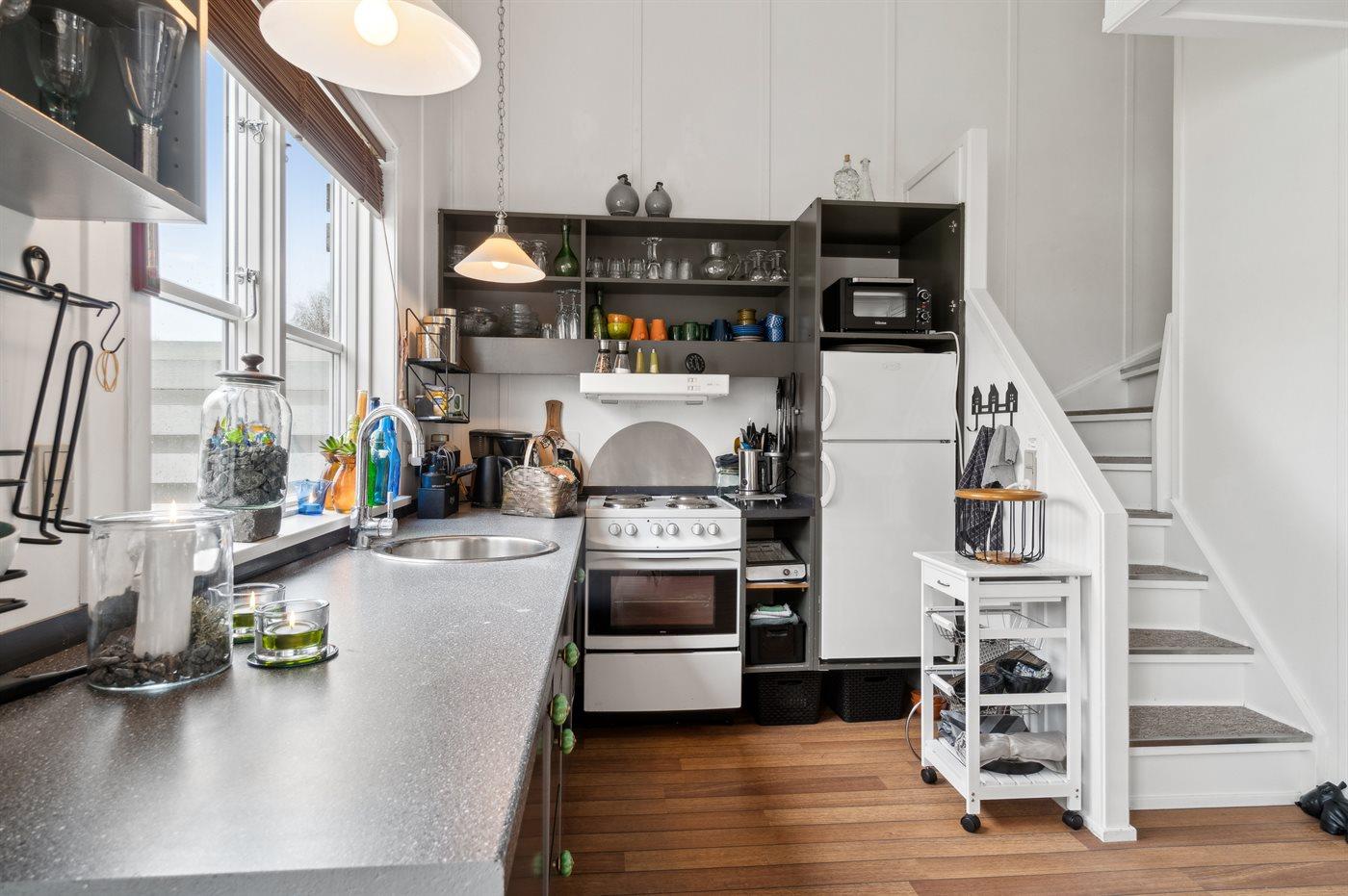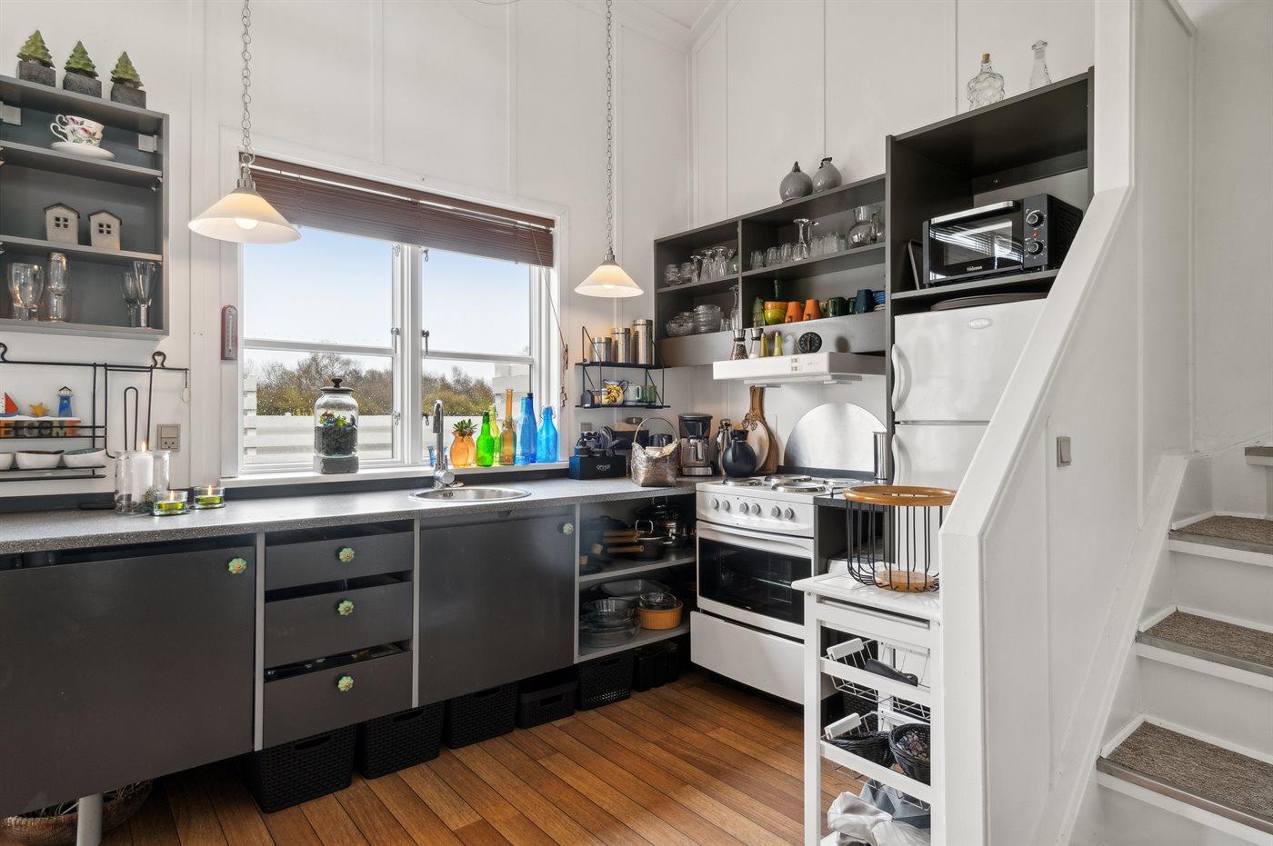Køkkenet er udstyret med 1 køleskab. Der er 4 elkogeplader, miniovn, bageovn, Airfryer samt opvaskemaskine.