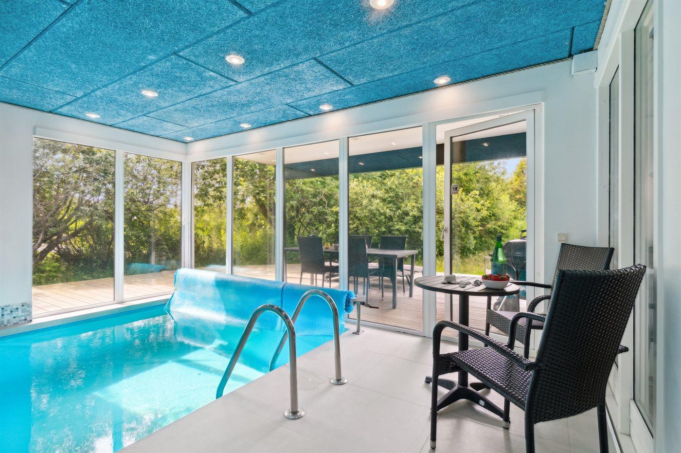 I den indendørs swimmingpool er der mulighed for leg og hyggeligt samvær. Swimmingpoolen måler op til 3 m i bredden, 6 m i længden og den er op til 1,4 m dyb. Vandet er mellem 24 og 28° C varmt. Der er gulvvarme i swimmingpoolområdet.