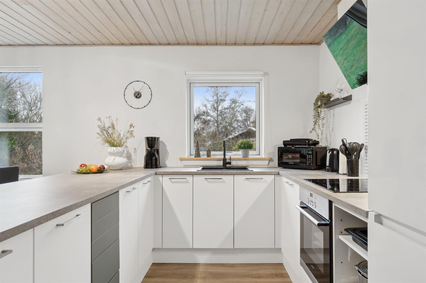 Køkkenet er udstyret med 1 køleskab. Der er 4 keramiske kogeplader, varmluftovn, mikrobølgeovn samt opvaskemaskine.