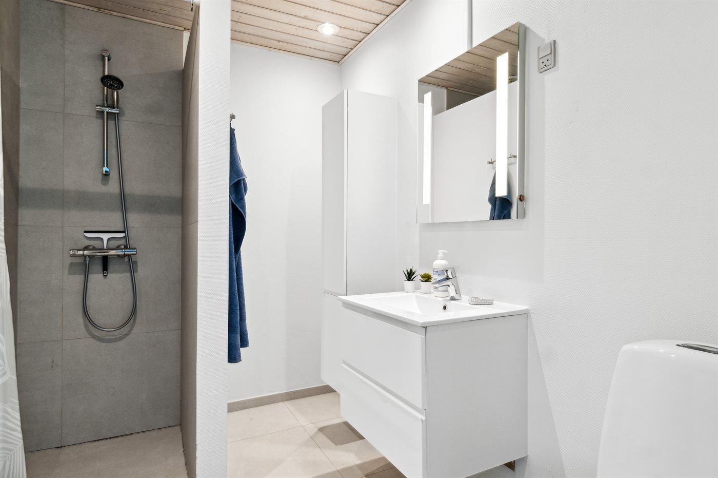 Der er 2 badeværelser med bruseniche og 2 toiletter. Der er gulvvarme på 2 badeværelser. I saunaen er der mulighed for afslapning.