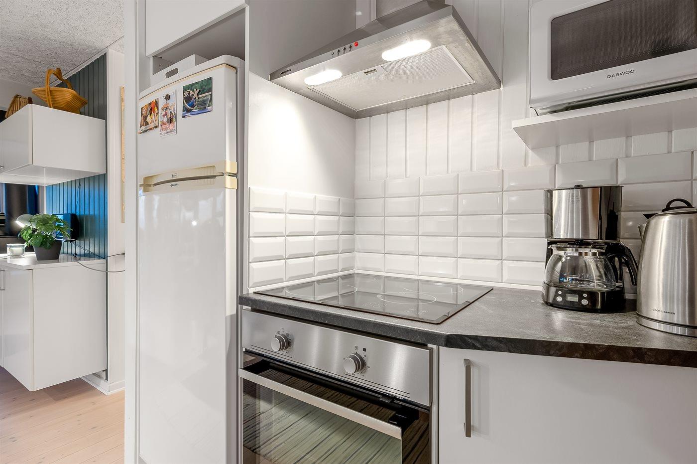 Køkkenet er udstyret med 1 køleskab. Der er 4 induktionskogeplader, varmluftovn, mikrobølgeovn samt opvaskemaskine.