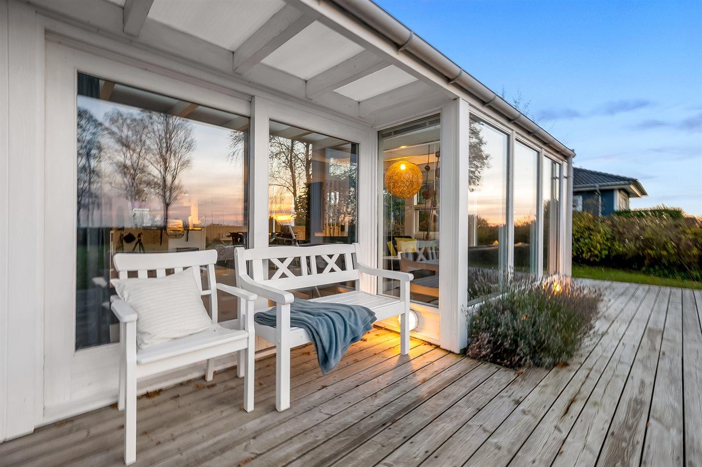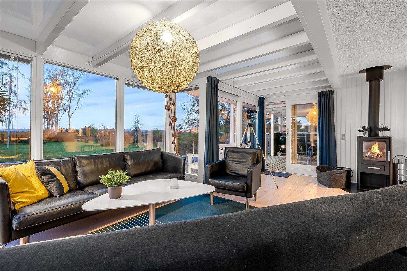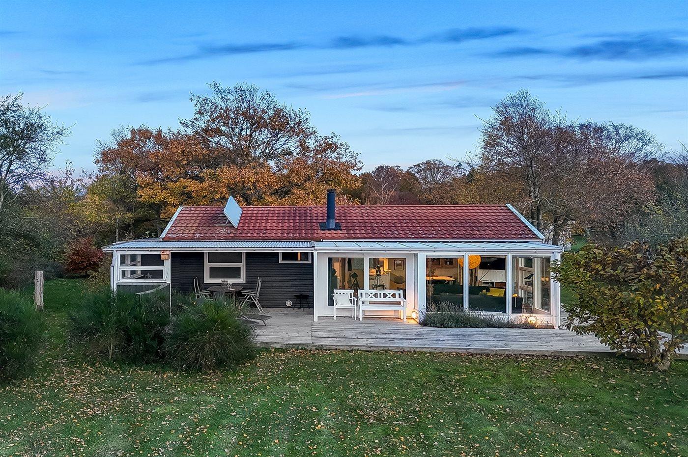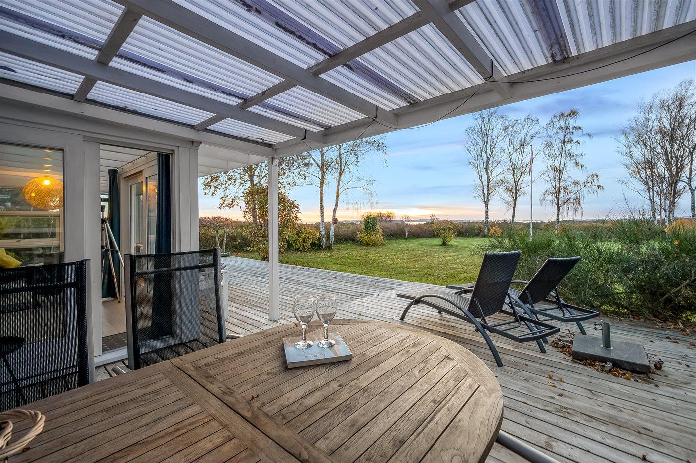 Hyggeligt sommerhus ved Ahl Strand med havudsigt, store terrasser, legeplads og tæt på Nationalpark Mols Bjerge.