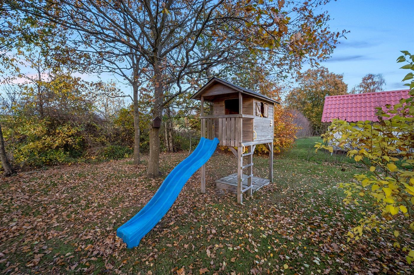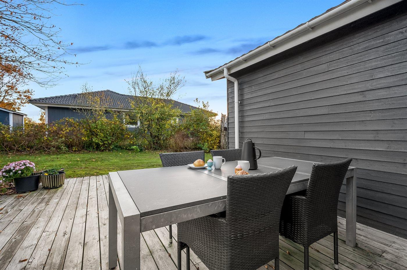 Udenfor venter en stor have med god plads til både afslapning og leg. De mange terrasser giver mulighed for at nyde både sol, skygge og læ dagen igennem. Til børnene er der bl.a. legetårn, gynger og et hyggeligt lille legehus.