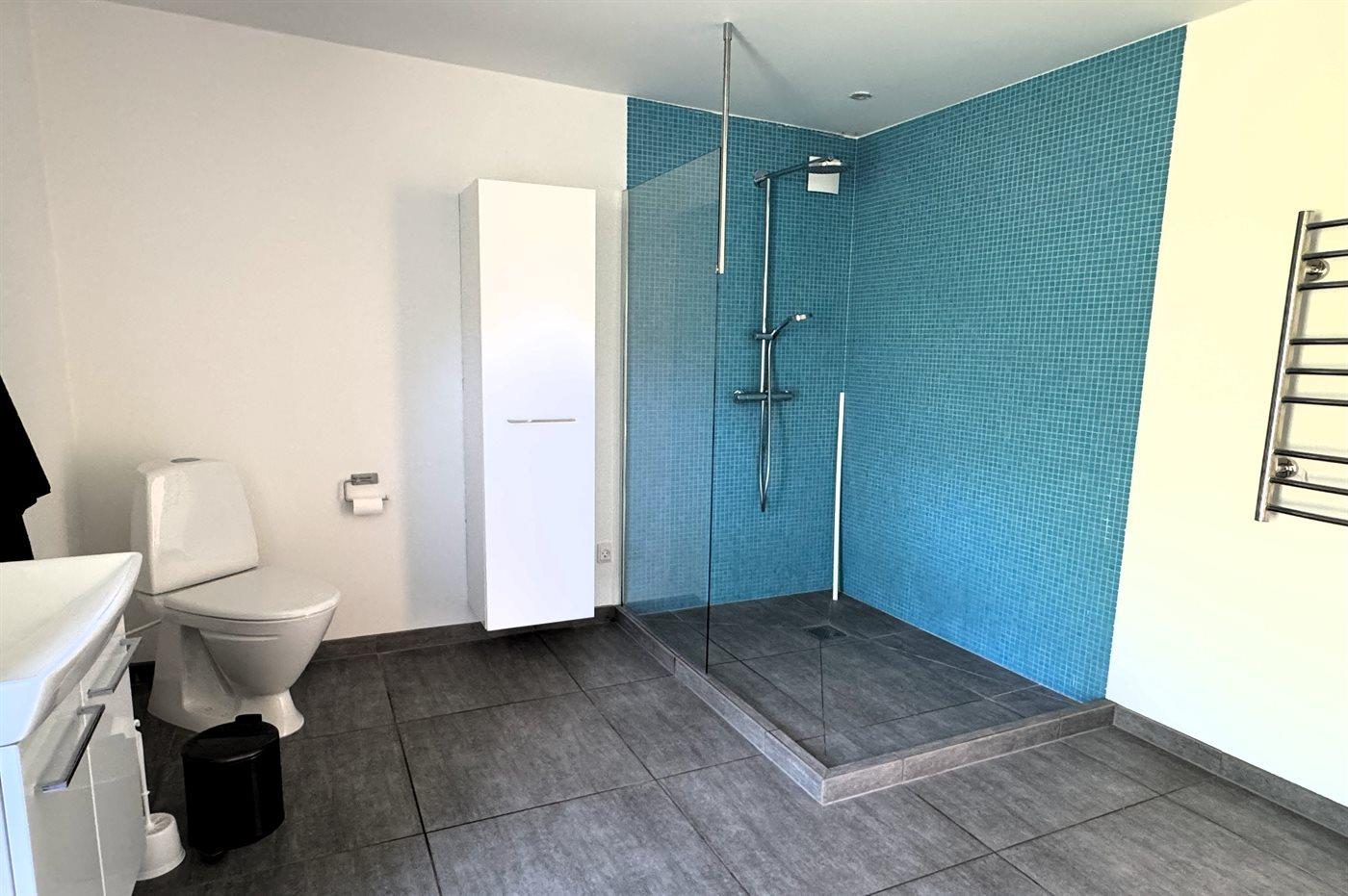 Der er 2 badeværelser med bruseniche og 2 toiletter. Der er gulvvarme på 2 badeværelser.