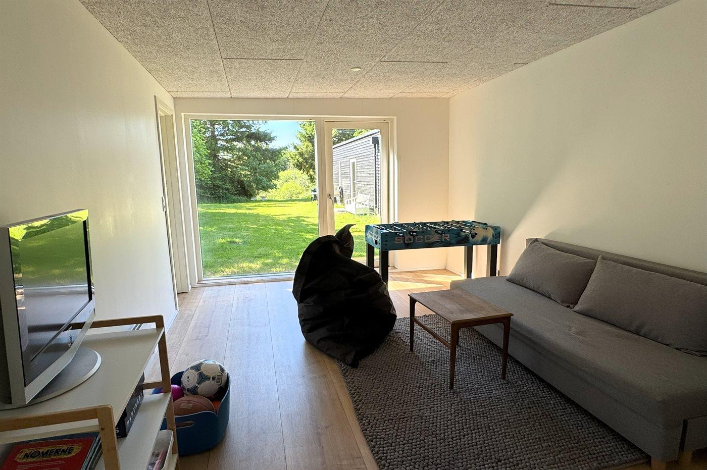 Det store fællesrum i hovedhuset har højt til loftet, masser af lys og direkte adgang til terrasser og den store naturgrund, hvor I kan nyde jeres egen sø og finde ro i grønne omgivelser. Her er både plads til leg, afslapning og samvær – og hunden er selvfølgelig også velkommen.