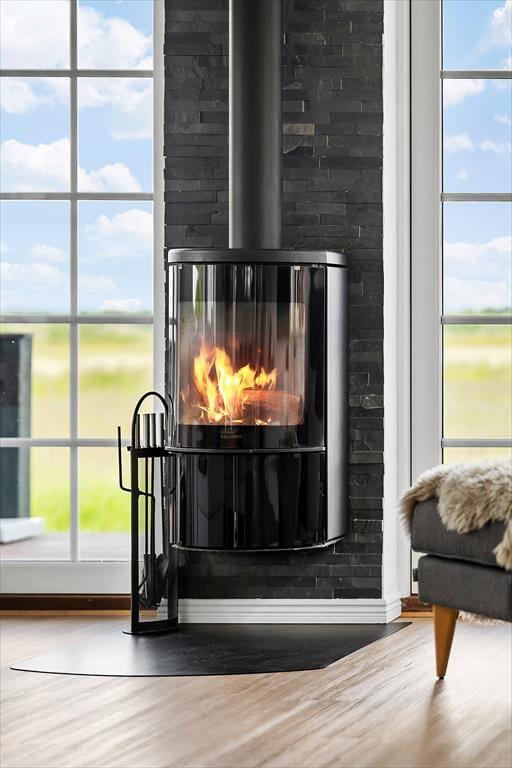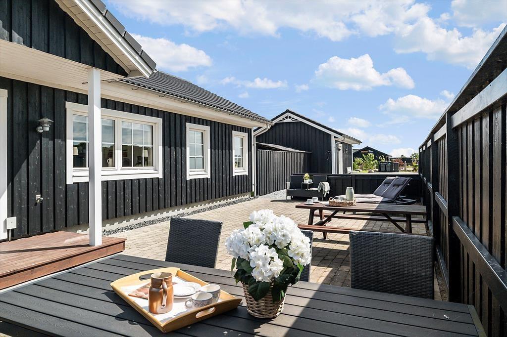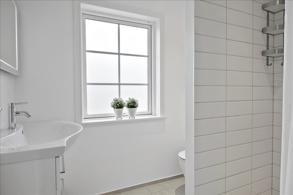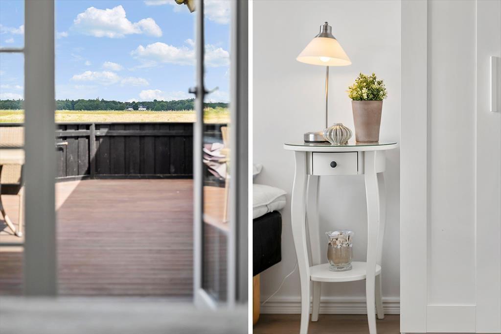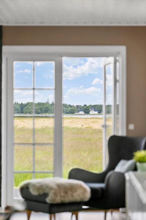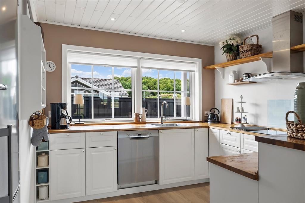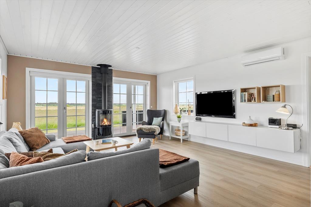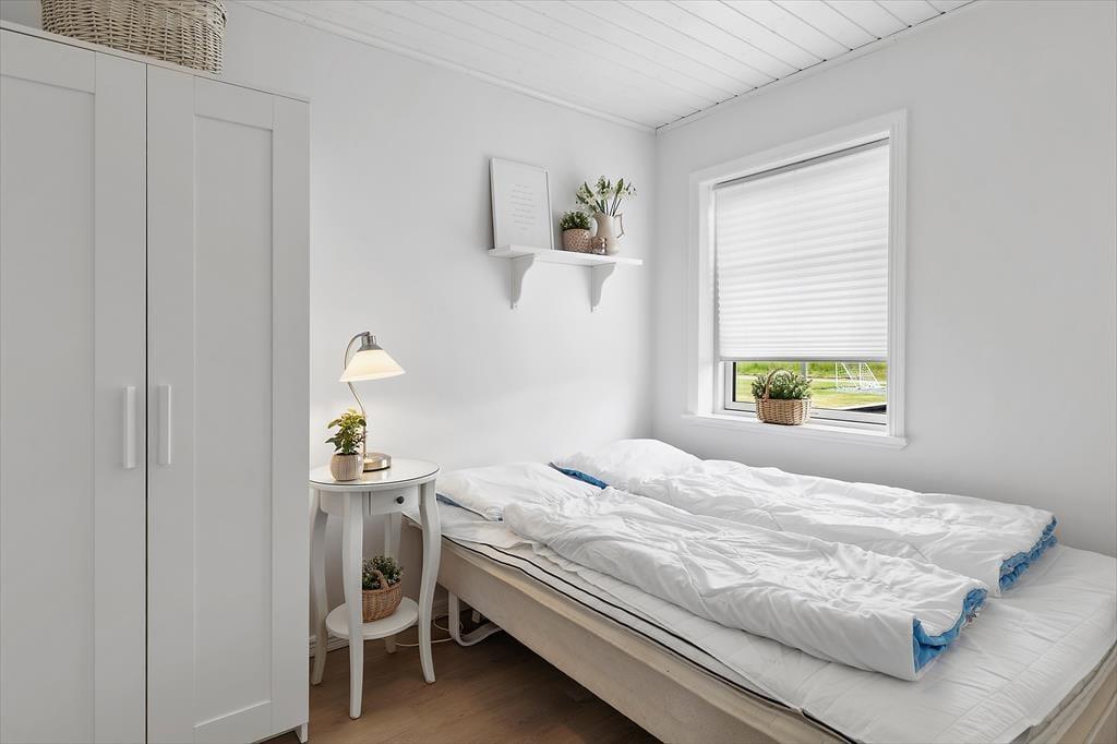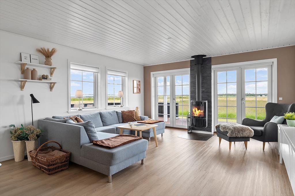 Huset fremstår meget lyst og romantisk. Her er simpelthen tænkt på det hele. Huset byder på tre soveværelser, hvor to af dem er med en trekvart seng, et med køjesenge og på det sidste værelse er der dobbeltseng. Der er to badeværelser, det ene med toilet og spa samt bruser, det fremstår i smuk skandinavisk stil; elegant og samtidig enkelt, og her oser af wellness. Det andet badeværelse har brusekabine og toilet. Stilener gennemgående smuk og skandinavisk i huset og huset byder på en afslappende stemning i stuen, hvor der er rigeligt plads til alle. Man kan have skønne hyggeaftener foran brændeovnen, eller hygge med en god film i det hyggelige sofahjørne Eller bare sidde og nyde den smukke udsigt over vandet. Det åbne køkken er en integreret del af stuen og det bliver nemt samlingspunktet for familien. Fra køkkenet er der udgang til en terrasse der løber hele vejen omkring huset og her kan man nyde udsigten over den store grund. Dette er et hus, hvor du med garanti vil føle dig godt tilpas fra første øjeblik.