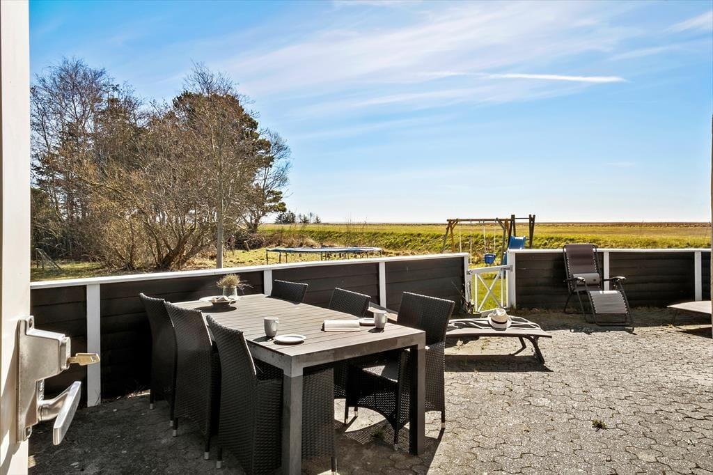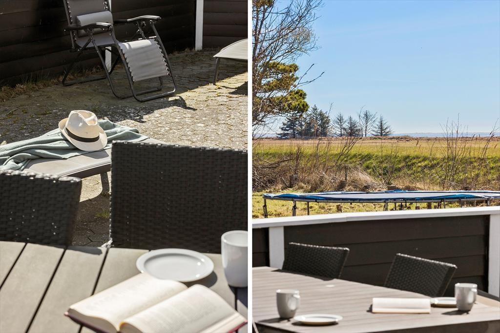 På husets terrasse og omkringliggende have kan du virkelig mærke, at du er landet midt i naturens ro. Huset ligger i et fredeligt område, og fra terrassen har du kig til havet, som altid giver en særlig ro og inspiration. Start dagen med en kop kaffe i morgensolen, mens mågerne sejler hen over himlen, og lad børnene løbe rundt og lege på plænen. Om aftenen kan I tænde op i grillen og dække op til middag under åben himmel – og måske tage et sidste dyp i poolen, inden I kryber til køjs. Den omkringliggende have giver plads til både boldspil, havespil og ren afslapning i en liggestol med en god bog. Uanset hvordan du vælger at bruge tiden udendørs, vil omgivelserne her give dig de helt rigtige feriefornemmelser.