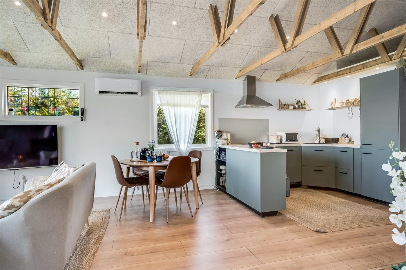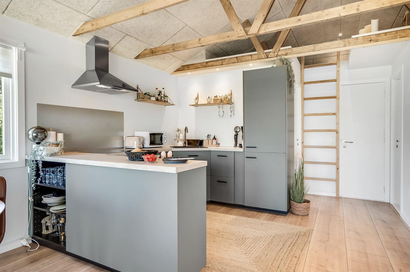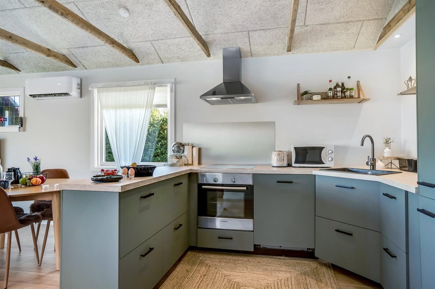 Køkkenet er udstyret med 1 køleskab. Der er 4 induktionskogeplader, varmluftovn, mikrobølgeovn samt opvaskemaskine.
