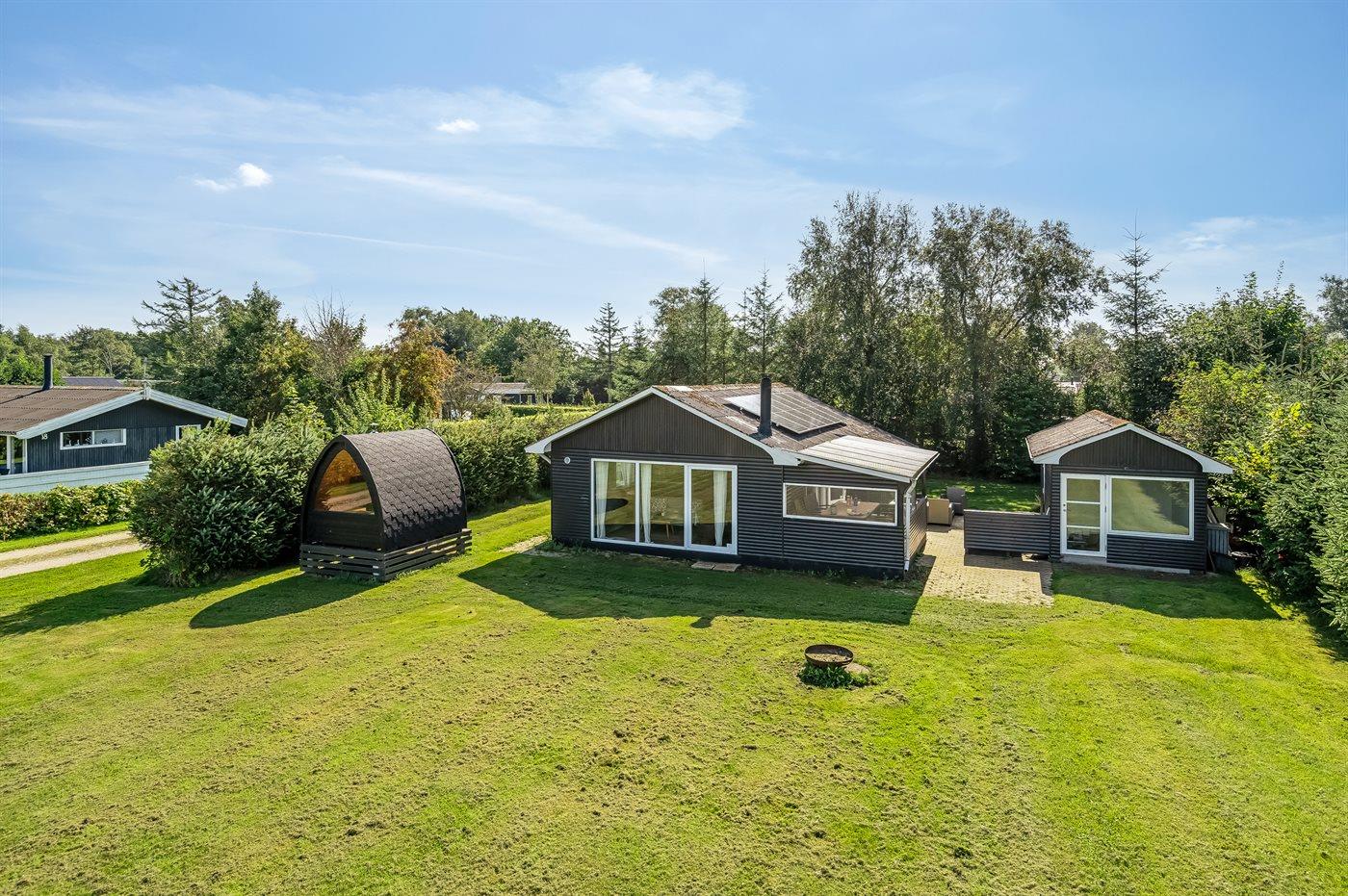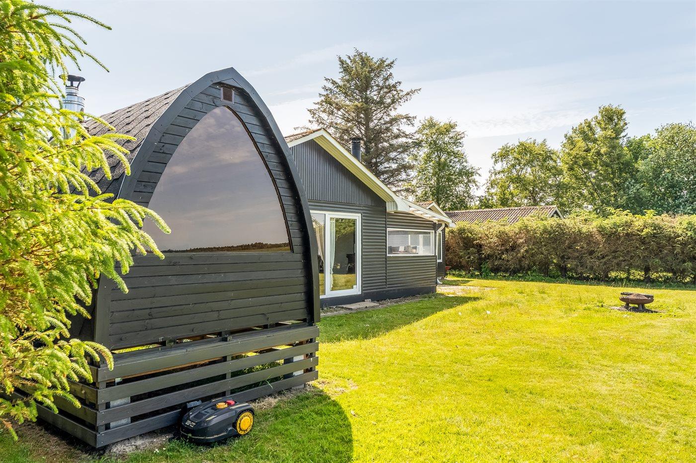 Ferieboligen er beliggende på en 1358 m² stor havegrund. Der er 950 m til havet. Der er 100 m til fjorden. Nærmeste forretning er beliggende i en afstand af 640 m. Der er en golfbane i en afstand af 2700 m. Til ferieboligen hører åbent terrasseareal. Desuden er der overdækket terrasse. Bålsted. Udendørs sauna. Grill til rådighed. Parkering ved ferieboligen.