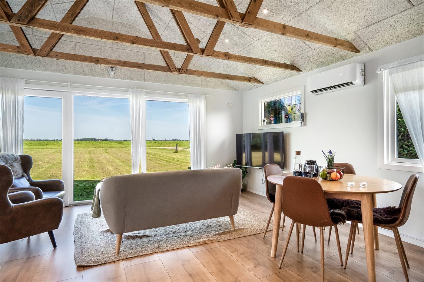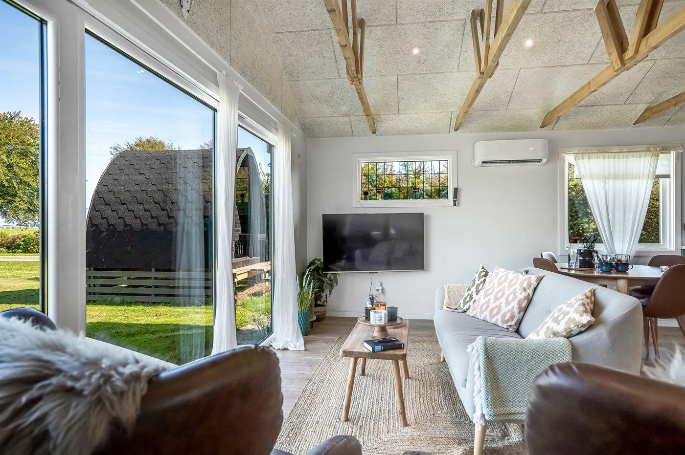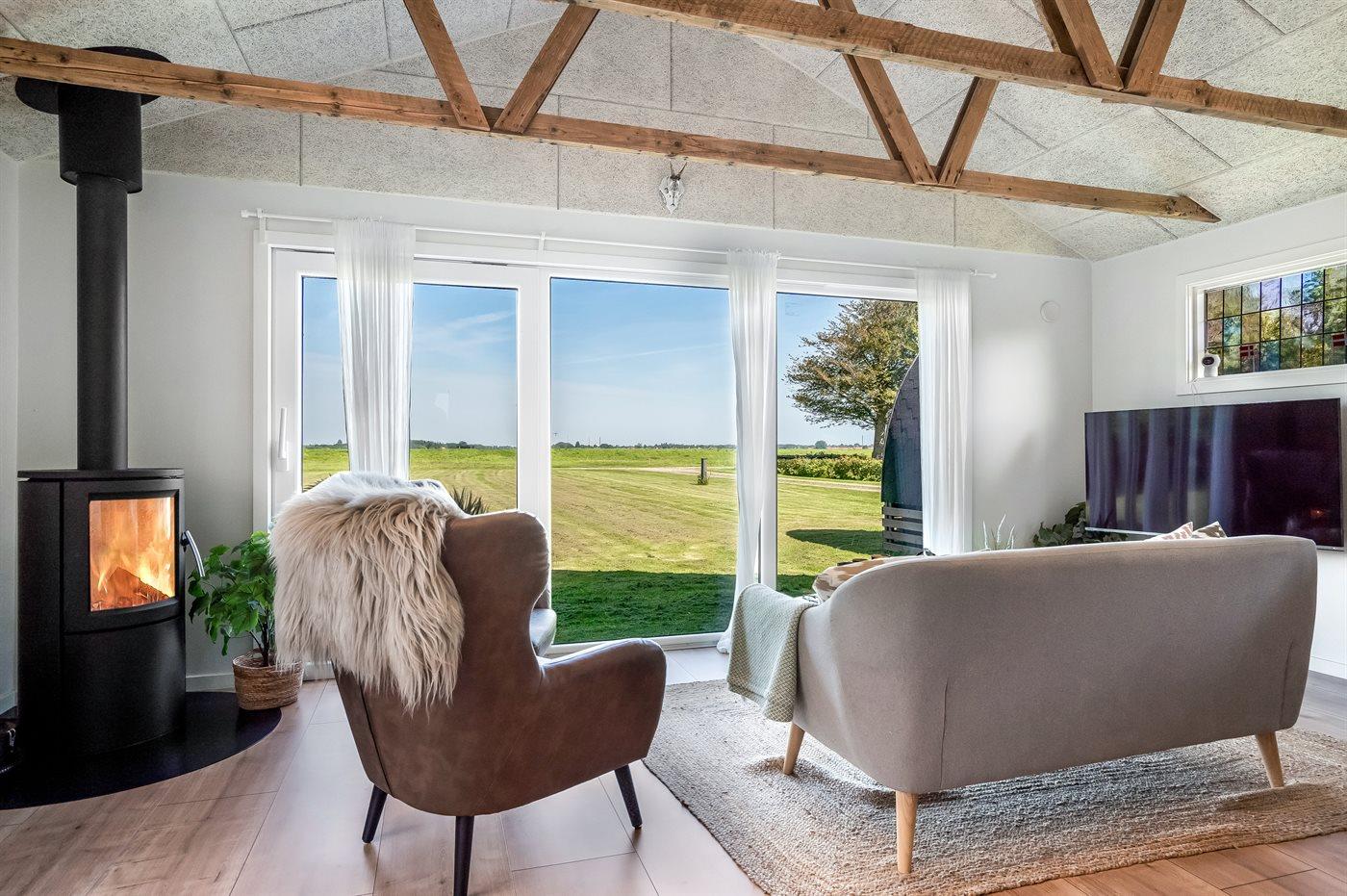 Efter en lang dag på farten kan I slappe af i husets lækre fællesrum med kig til spærrene under loftet, og fra den store vinduesside kan I se ud over grunden, marker og fjorden. Fyld indetimerne med brætspil og ild i brændeovnen, hyggelige madlavningsprojekter og gode bøger ved vinduet, hvorfra I kan nyde udsigten. I sommersæsonen kan I rykke ud på terrassen og grille, mens I sidder dejligt i læ mellem husets bygninger.
