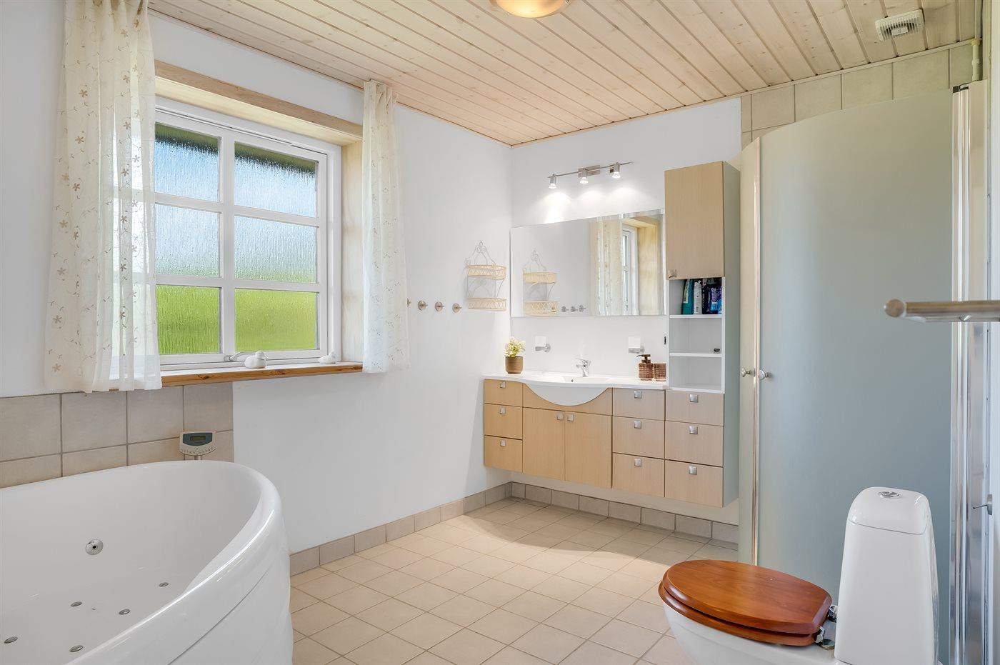 Sommerhuset byder på et skønt spabad, hvor du kan læne dig tilbage og nyde varmen og roen efter en dag fyldt med oplevelser. Udendørs finder du både en stor åben terrasse og en overdækket terrasse – perfekt til solrige dage eller hyggelige aftener med grillmad - uanset vejret.