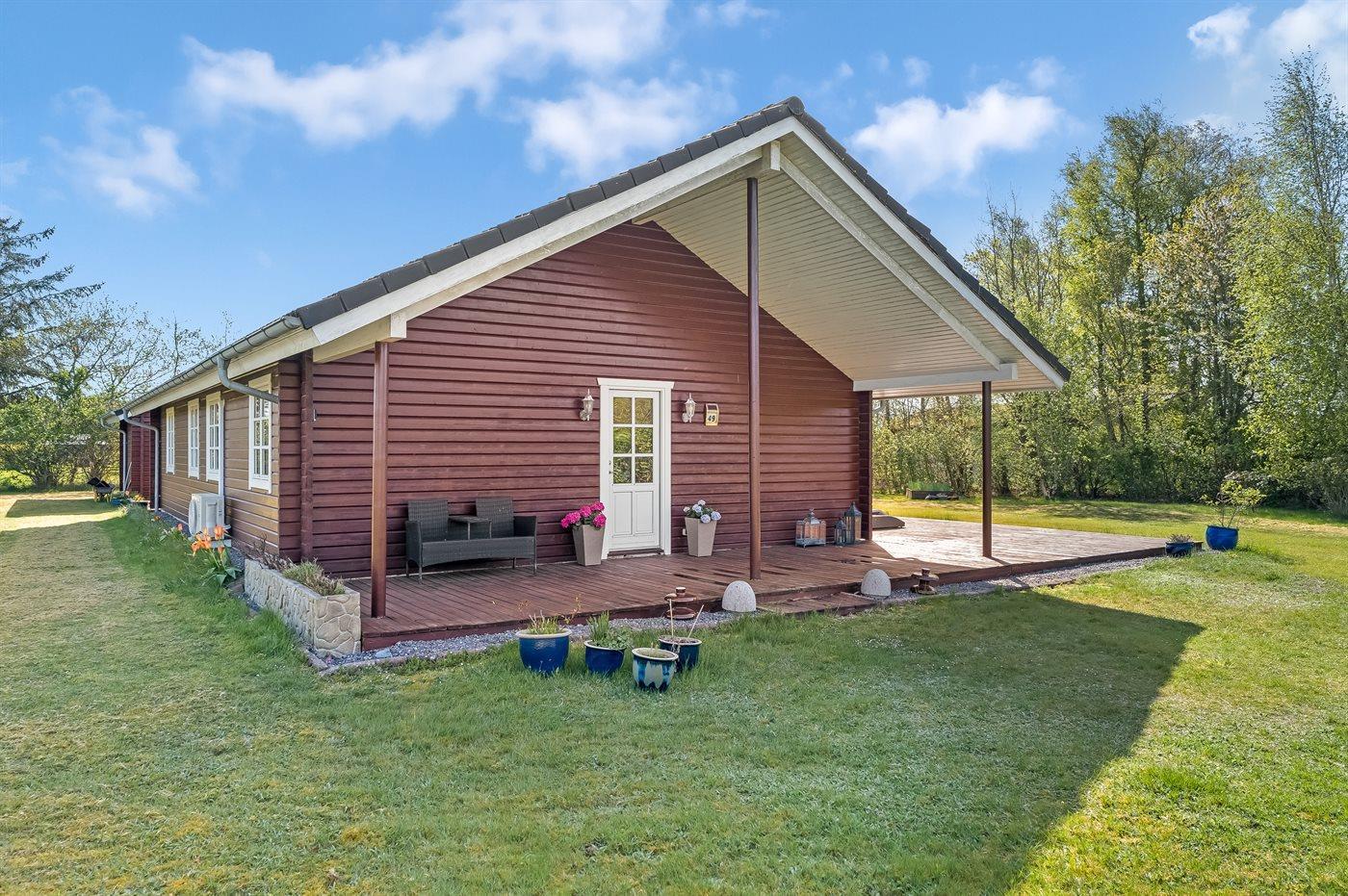 Ferieboligen er beliggende på en 1252 m² stor havegrund. Der er 1100 m til havet. Der er 600 m til fjorden. Nærmeste forretning er beliggende i en afstand af 350 m. Der er en golfbane i en afstand af 3380 m. Til ferieboligen hører åbent terrasseareal. Desuden er der overdækket terrasse. Grill til rådighed. Parkering ved ferieboligen.