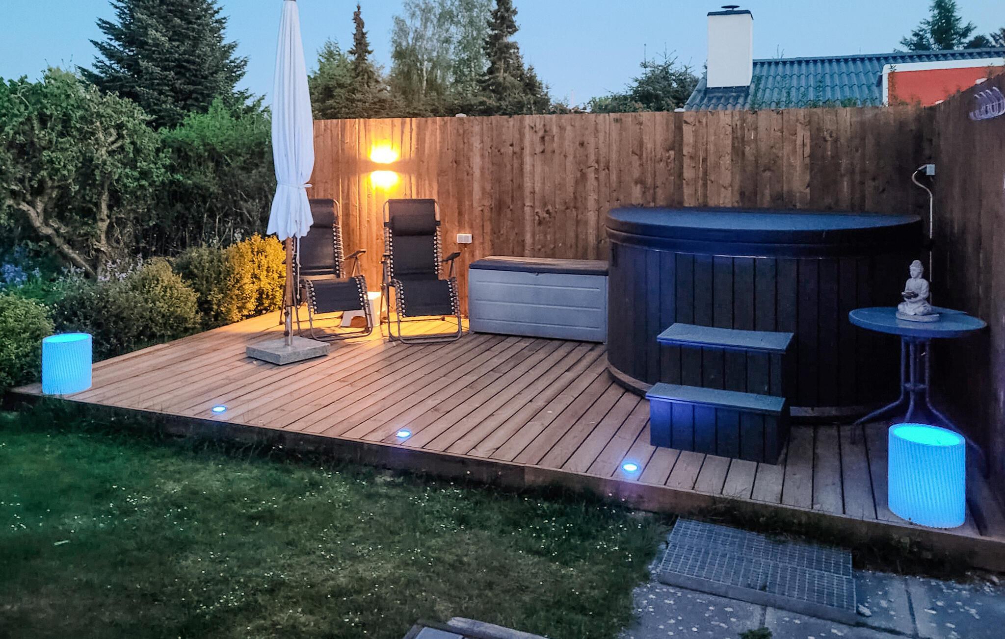 Det velholdte udendørsområde lokker børnene til at nyde den friske luft med gode legemuligheder. Forkæl jer selv med nogle afslappende øjeblikke i spabadet, brug de behagelige liggestole til afslappende læsetid og nyd jeres tid sammen med en stemningsfuld grillmiddag under stjernerne.