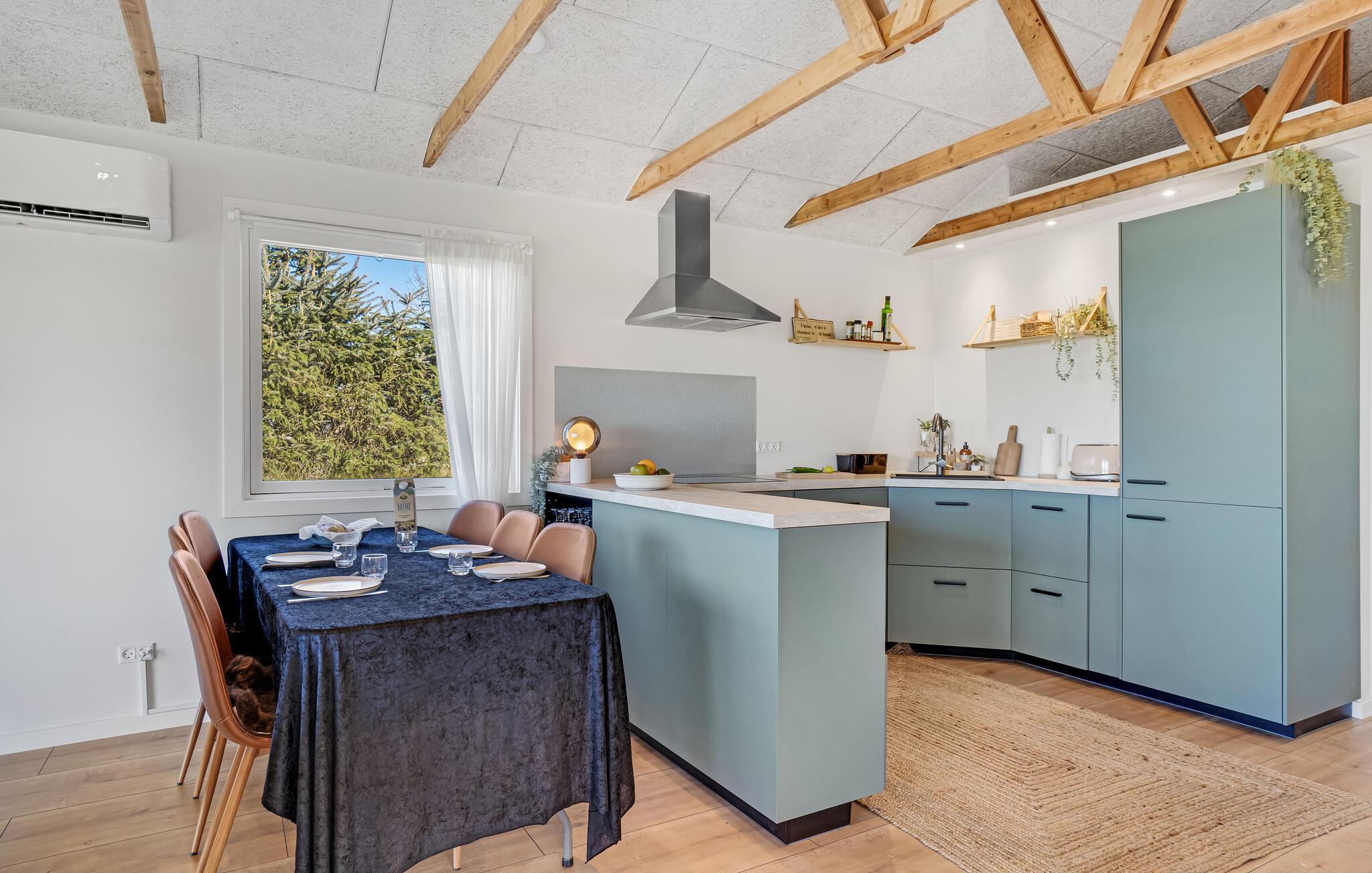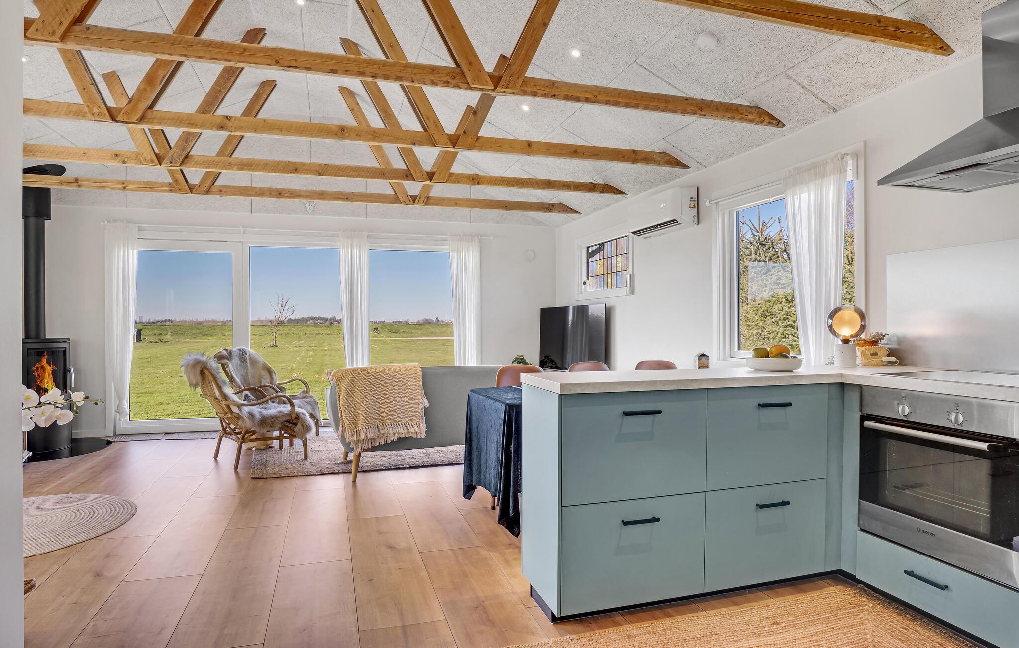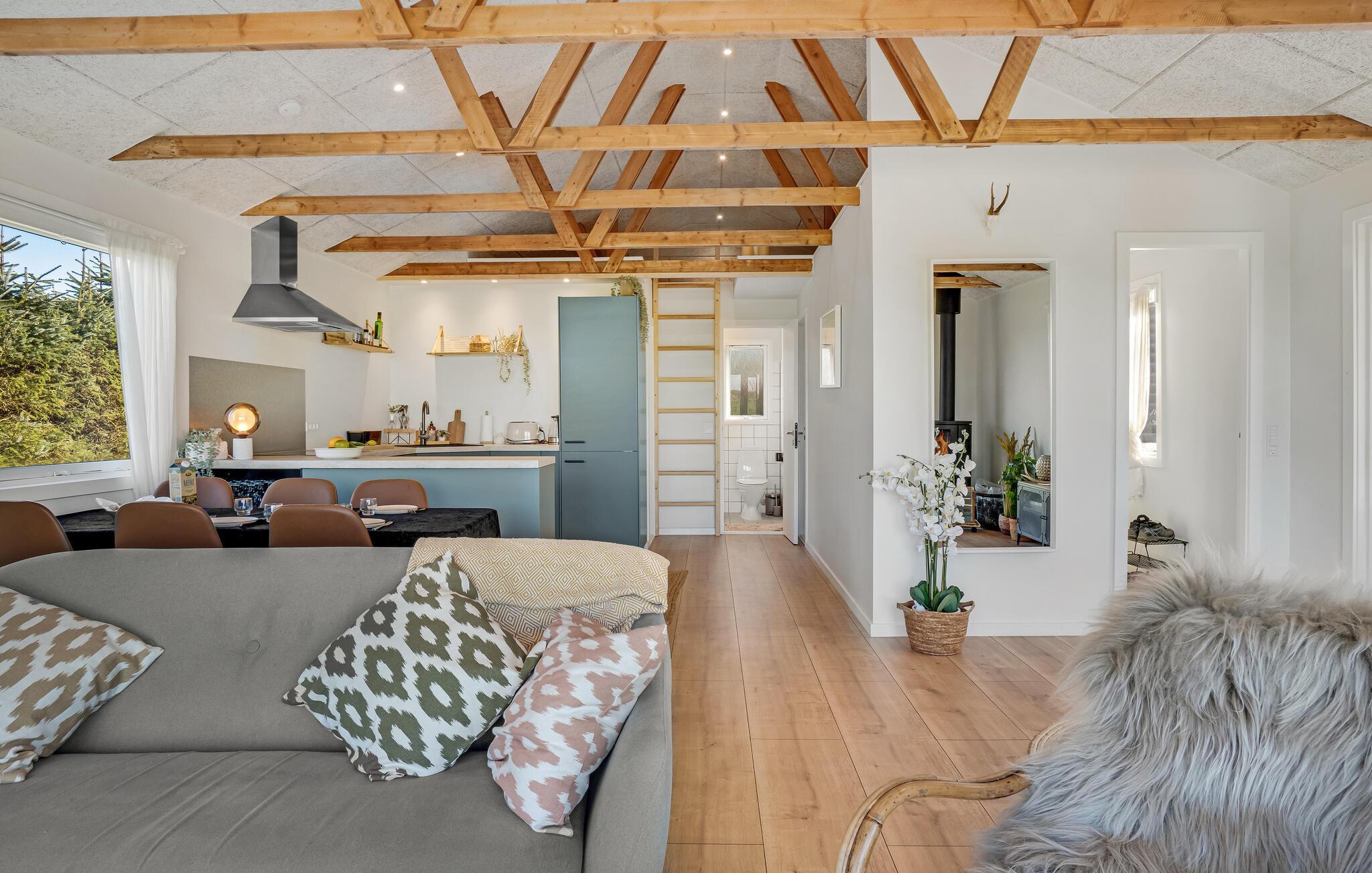 Velkommen til en fantastisk familieferie, hvor I kan få jeres base i dette elegante hus, som emmer af komfort. Efter en lang dag på farten kan I slappe af i husets lækre fællesrum med kig til spærrene under loftet, nordiske indretningsløsninger og en stor vinduesside ud over grunden, marker og fjorden længere ude. Fyld indetimerne med brætspil og ild i brændeovnen, hyggelige madlavningsprojekter og gode bøger ved vinduet, hvor I kan kigge op og nyde udsigten ind imellem. I sommersæsonen kan I rykke ud på terrassen og grille, mens I sidder dejligt i læ mellem husets bygninger.