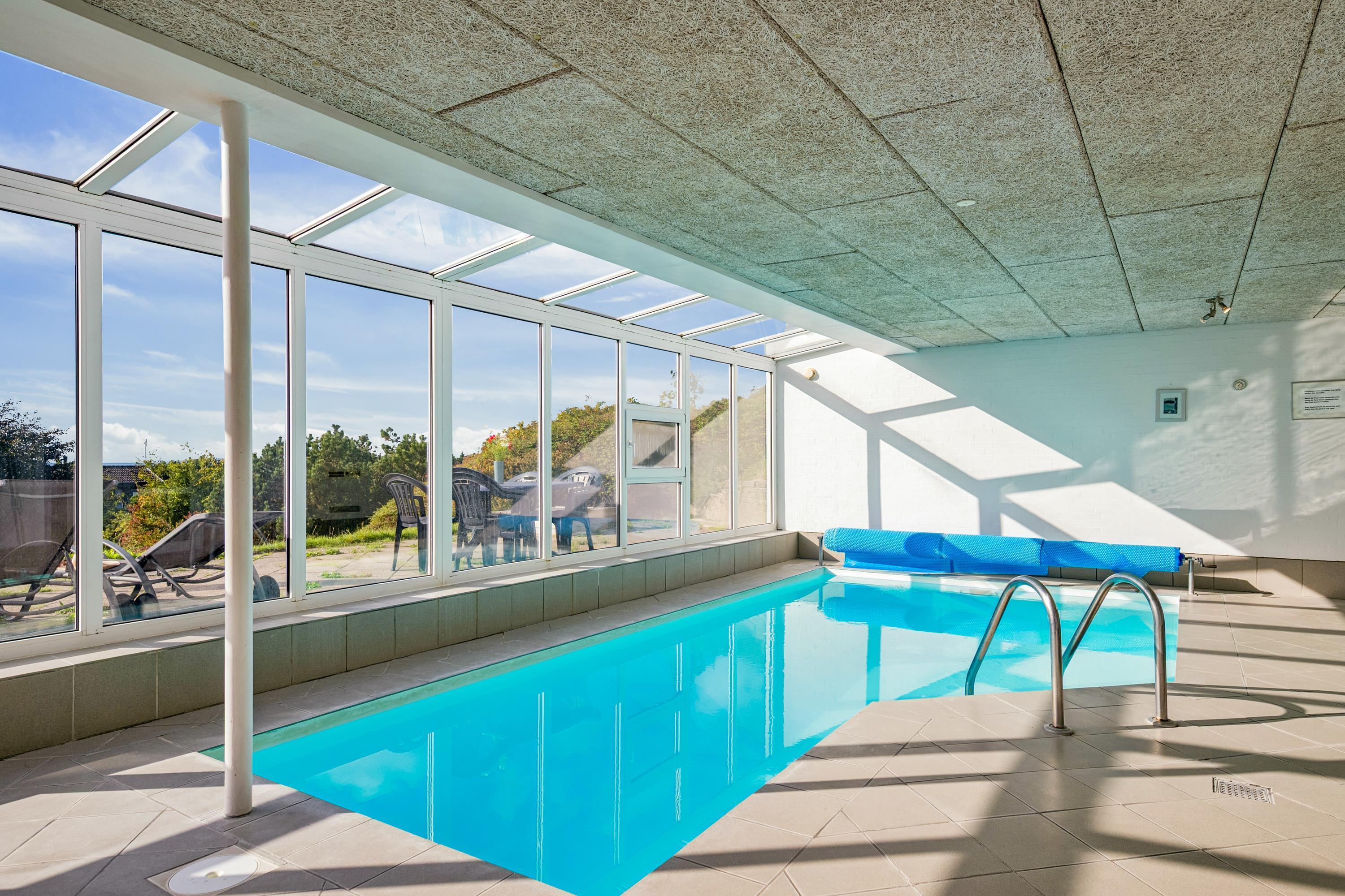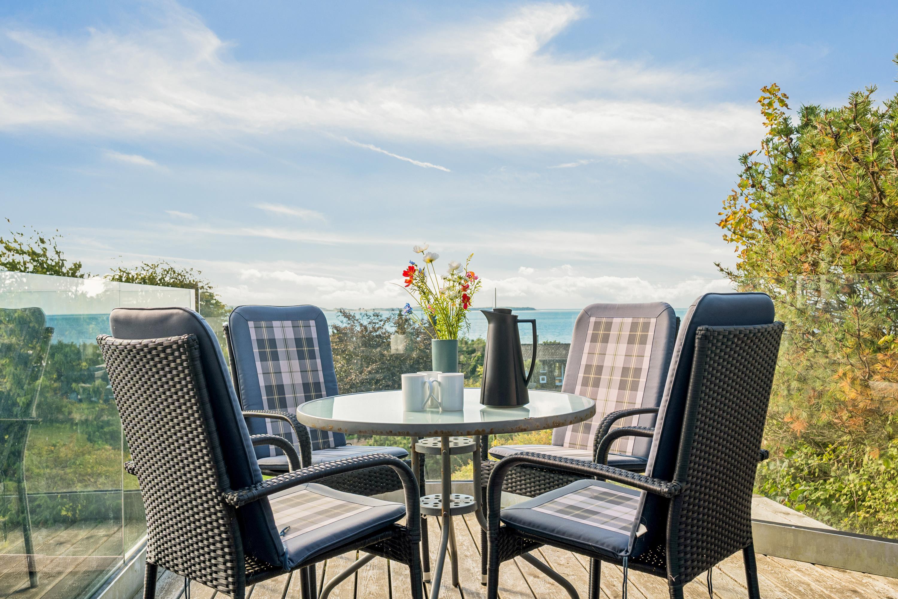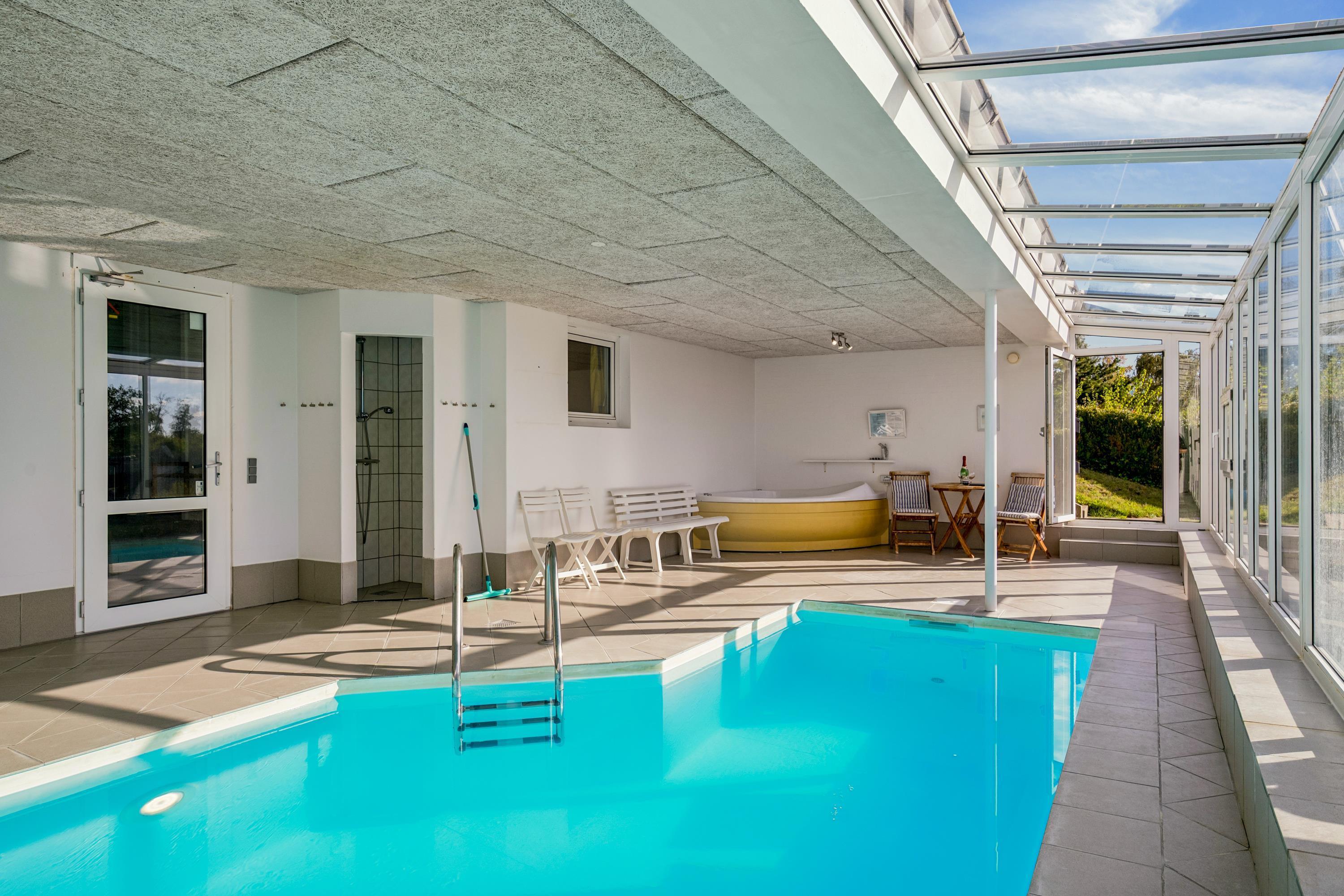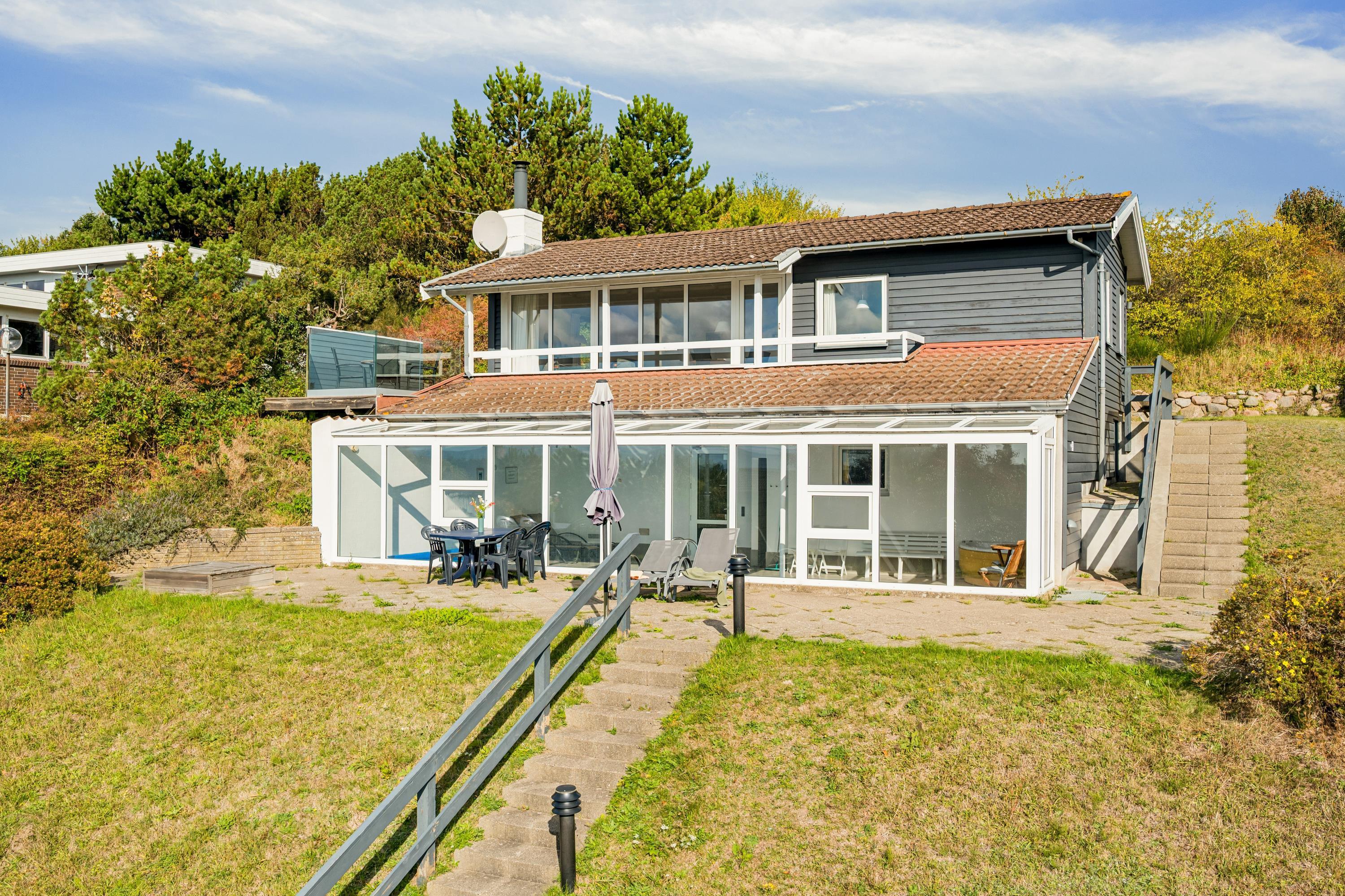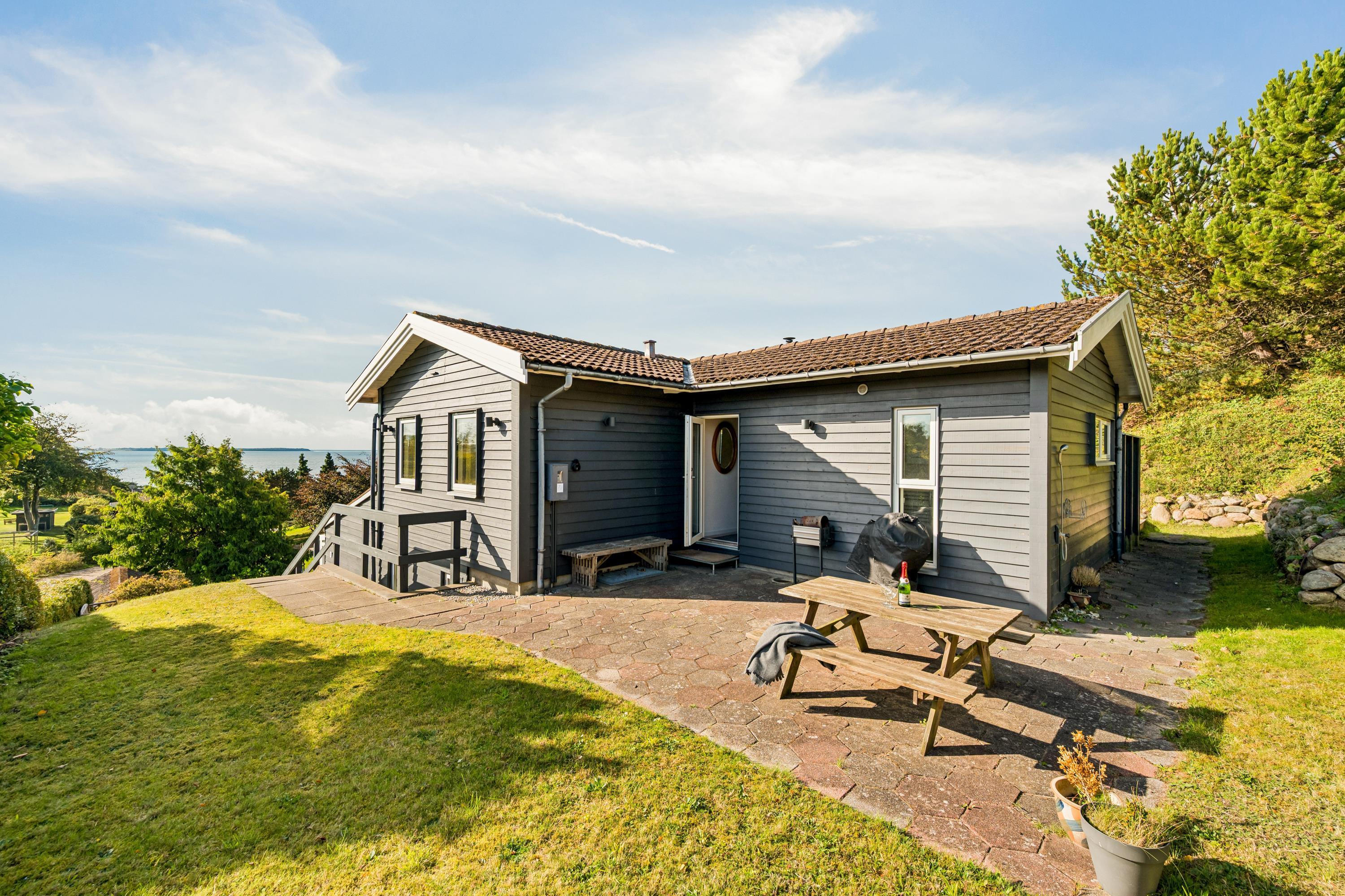 Hyggeligt feriehus med pool og sauna, smuk udsigt over Ebeltoft Vig og tæt på børnevenlig sandstrand.