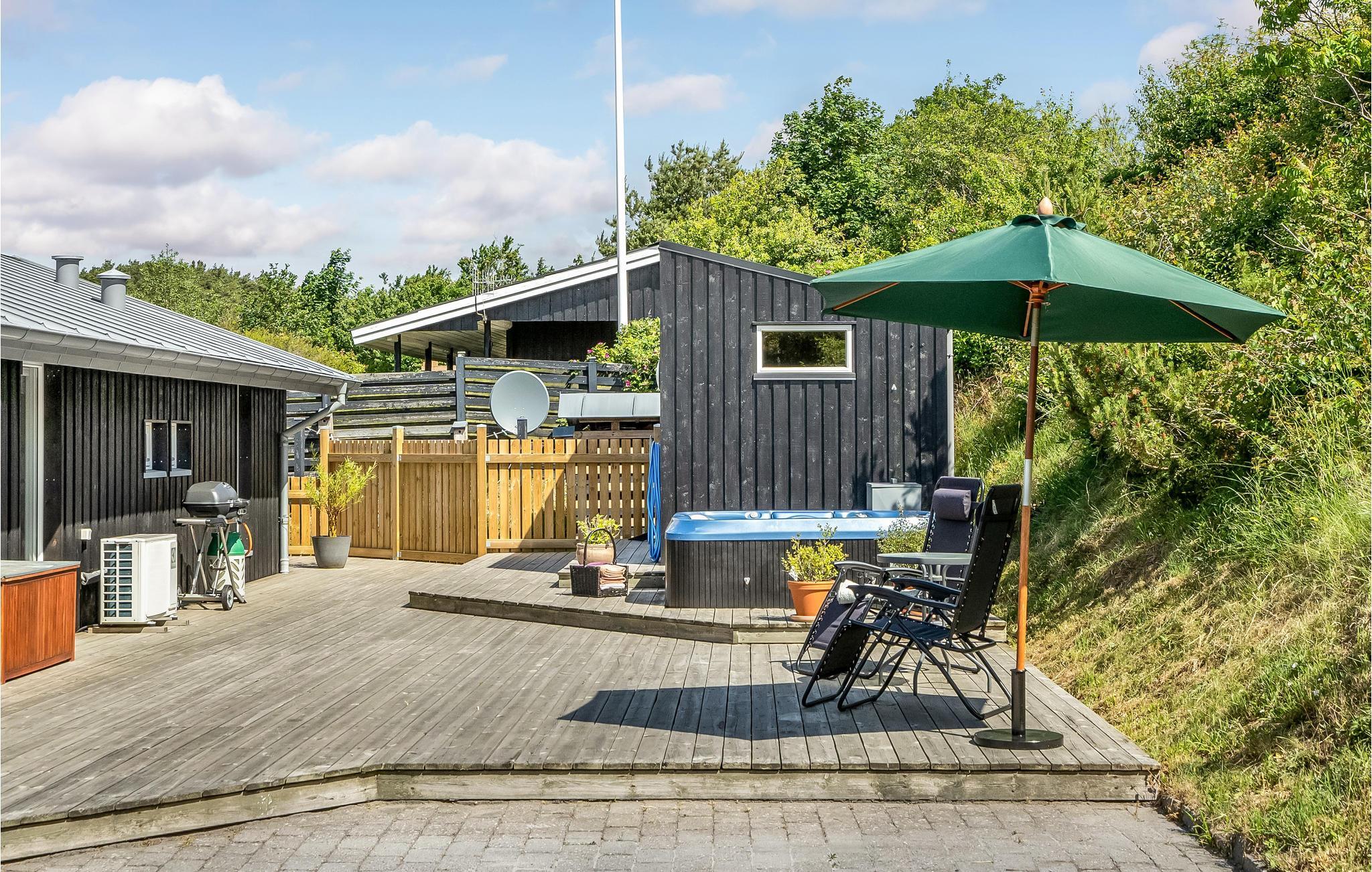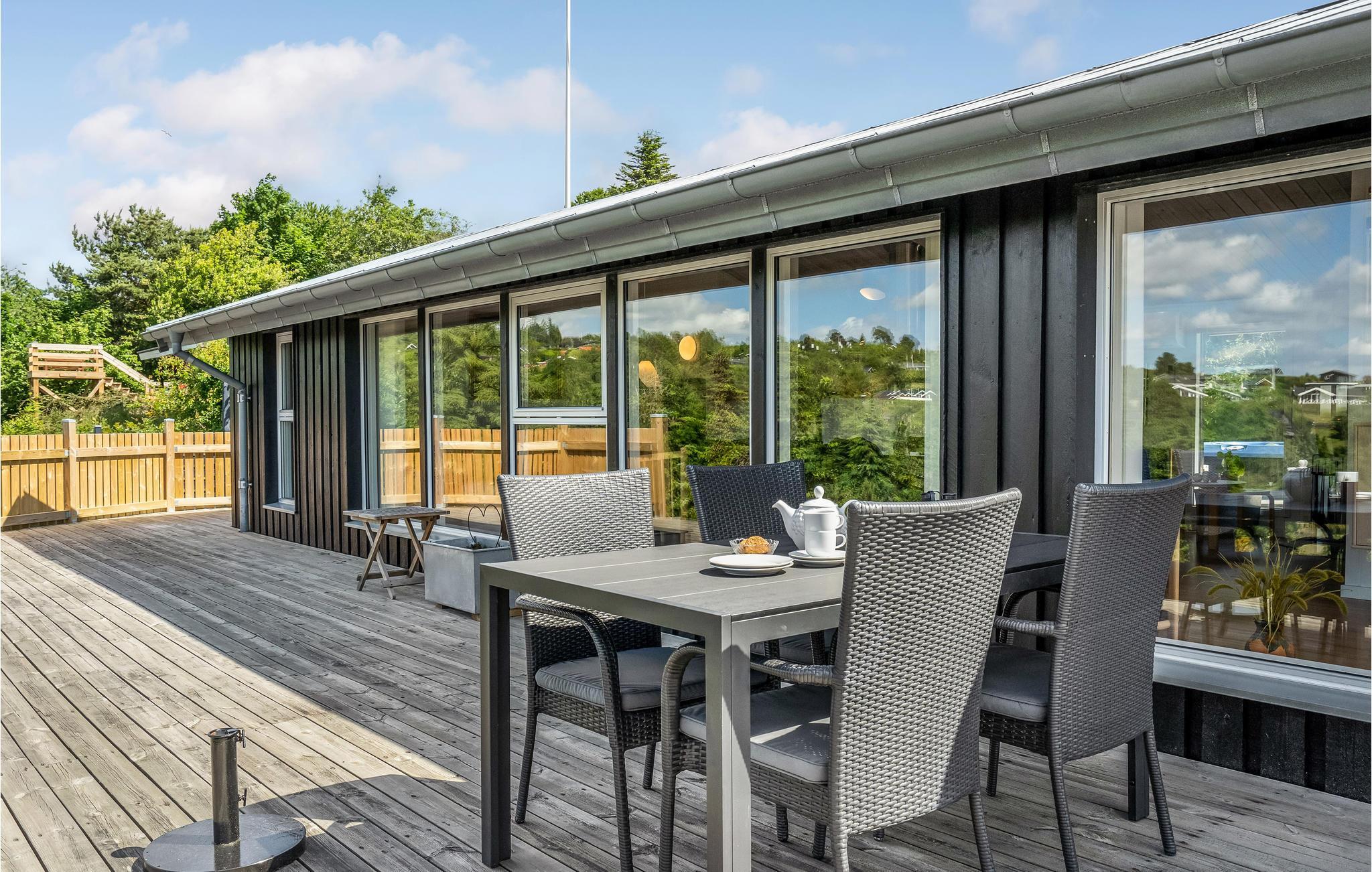 Moderne sommerhus med stor terrasse og udendørs spabad nær strand og by i Ebeltoft.